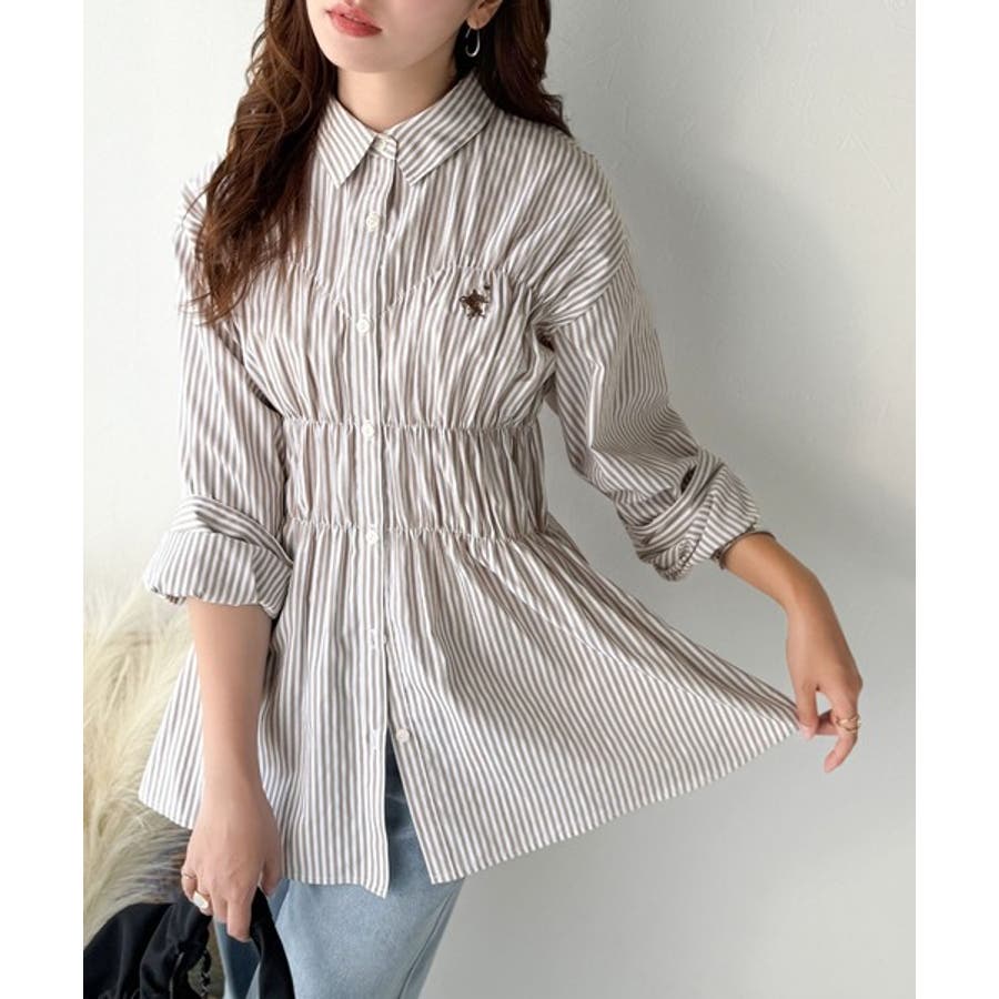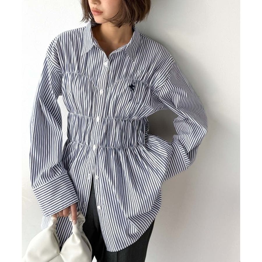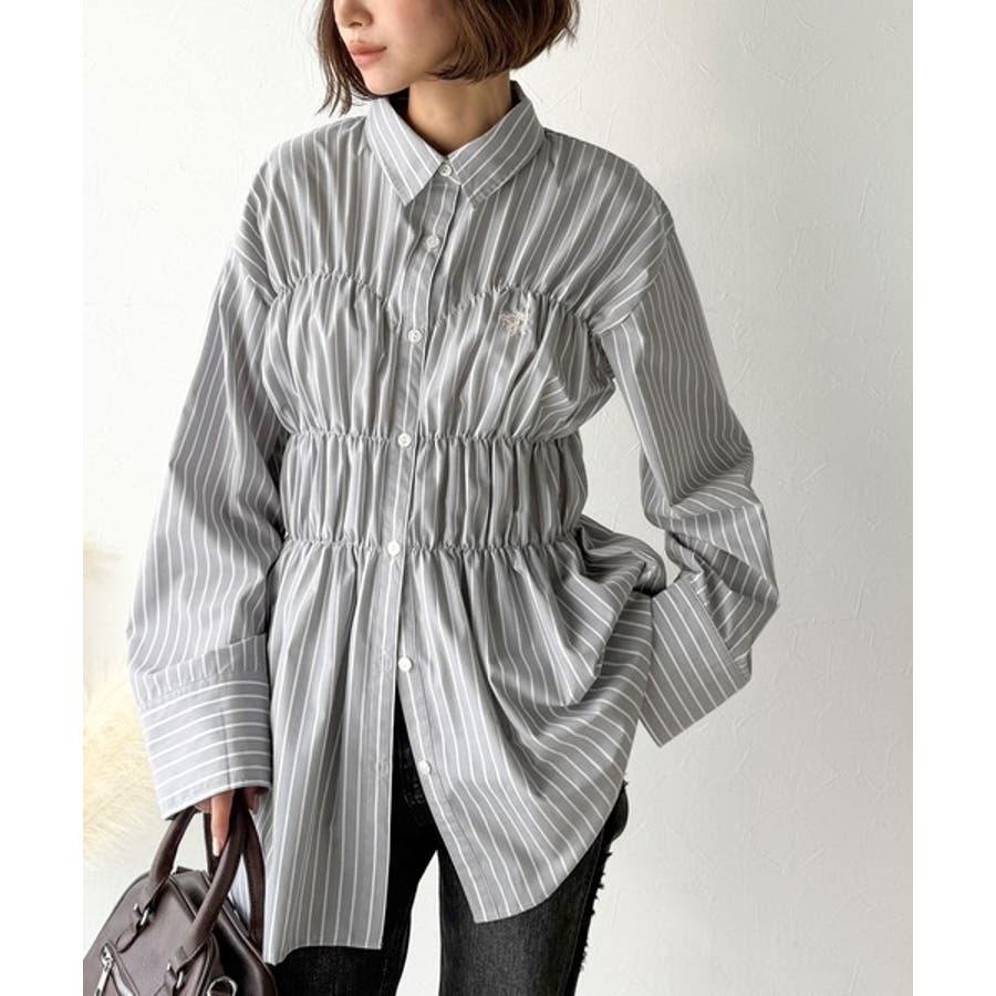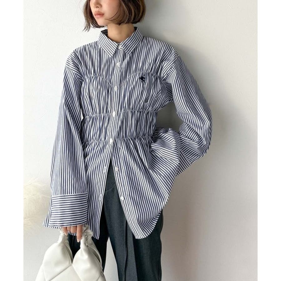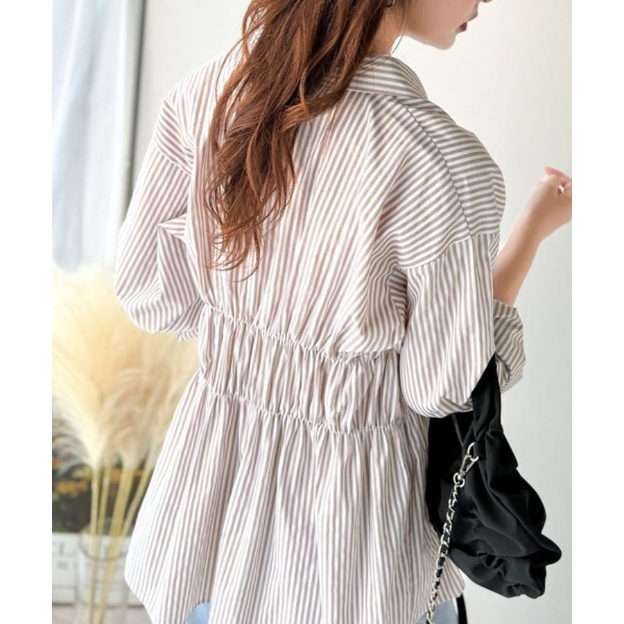 大人のシルエット美人を叶える、ビスチェ風シャーリング長袖シャツ(ストライプ 無地…