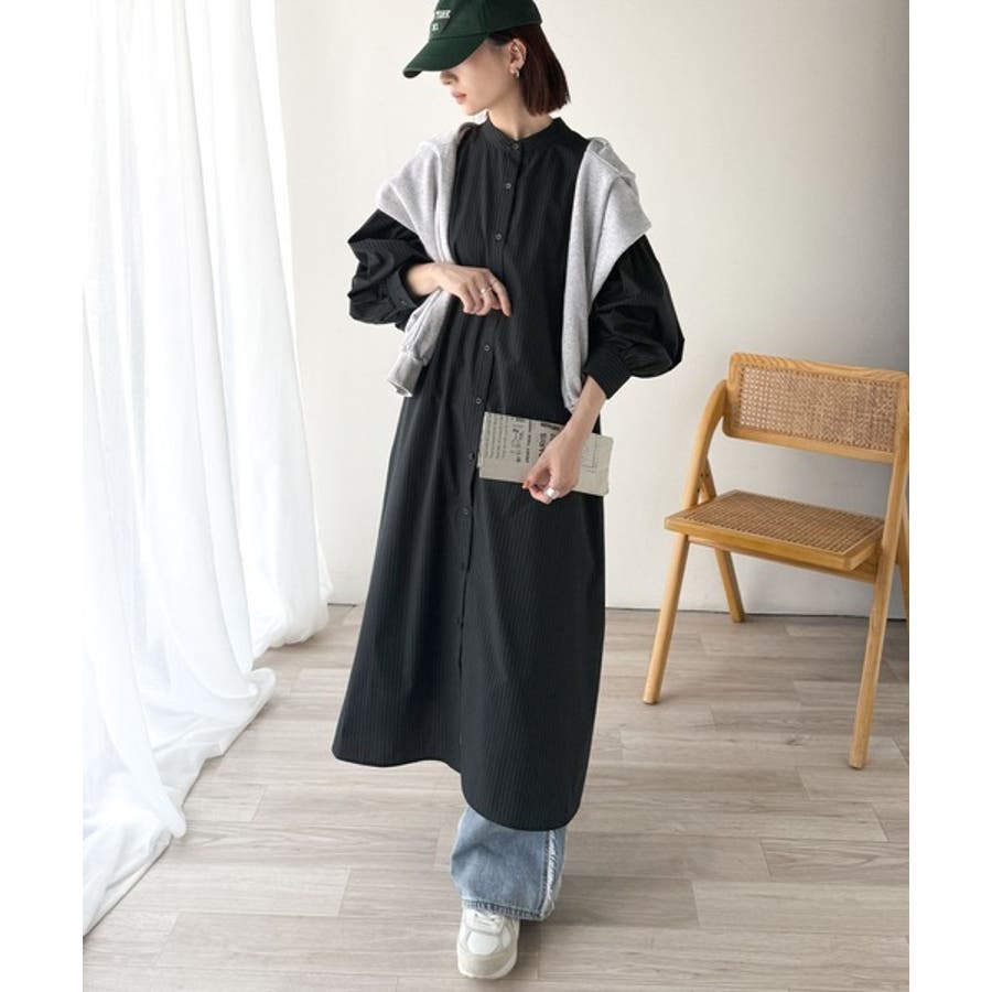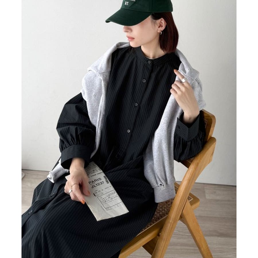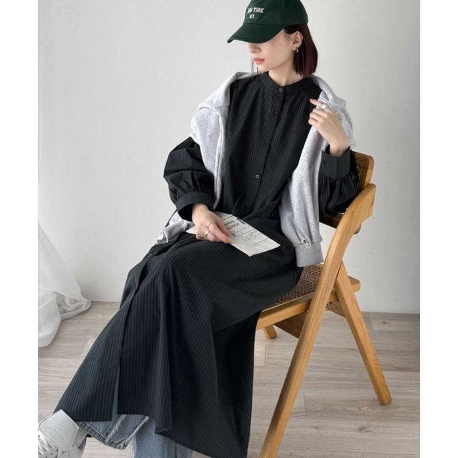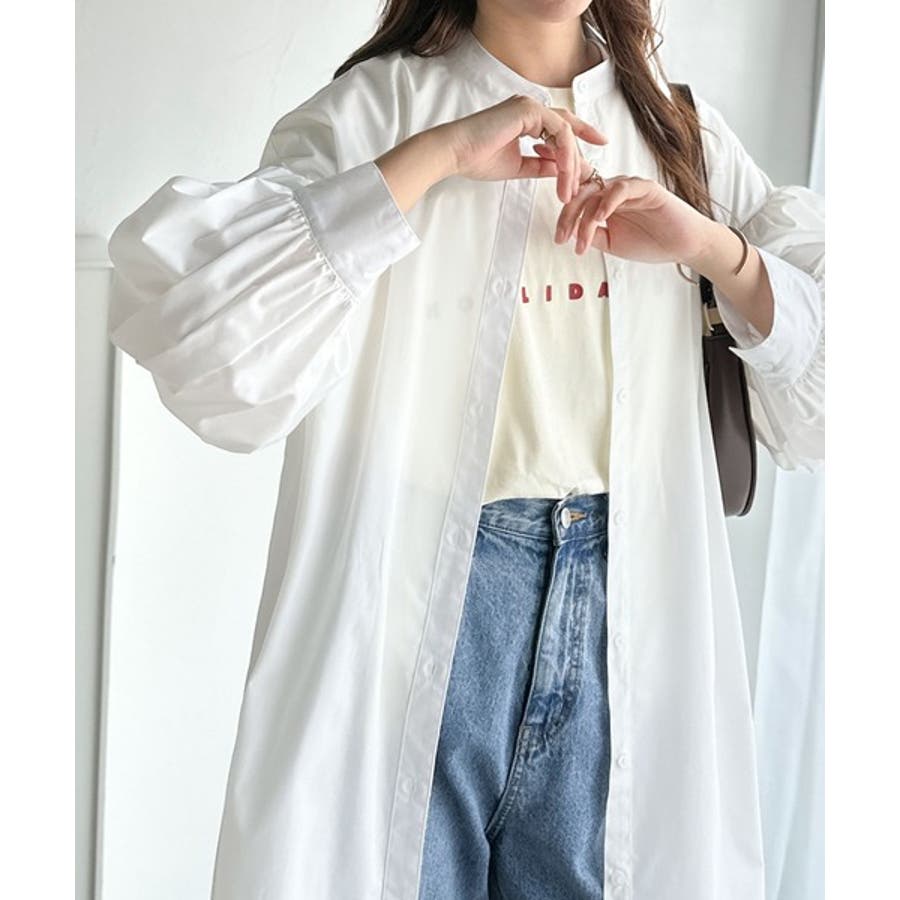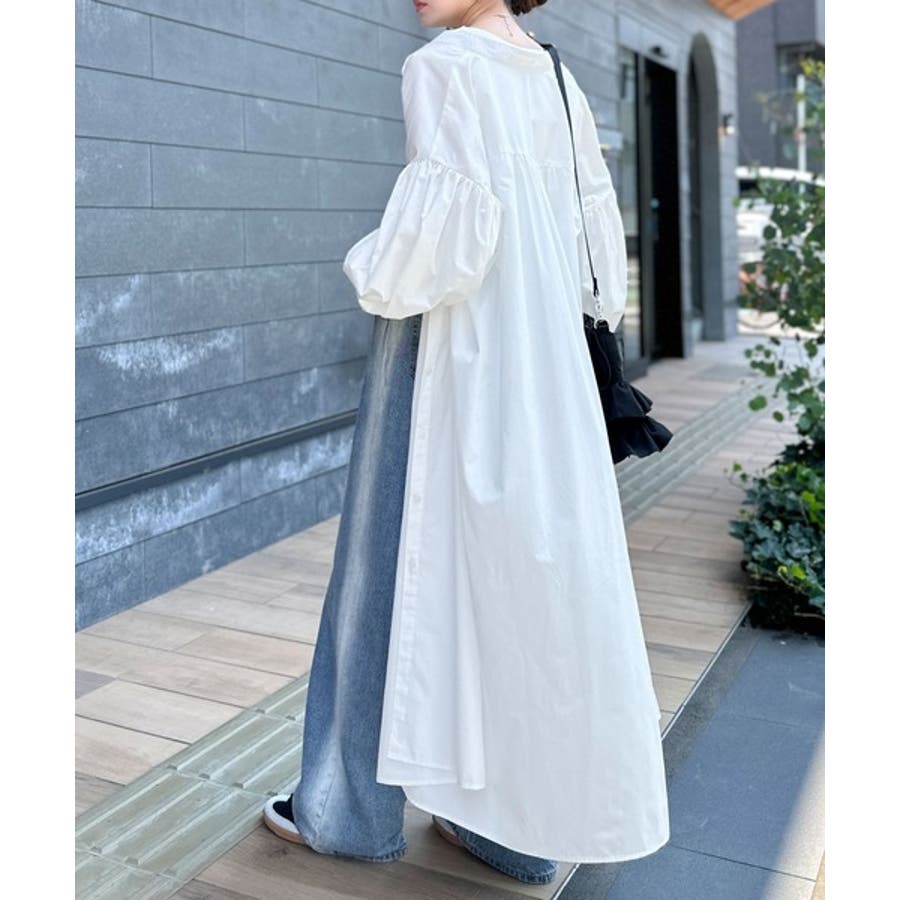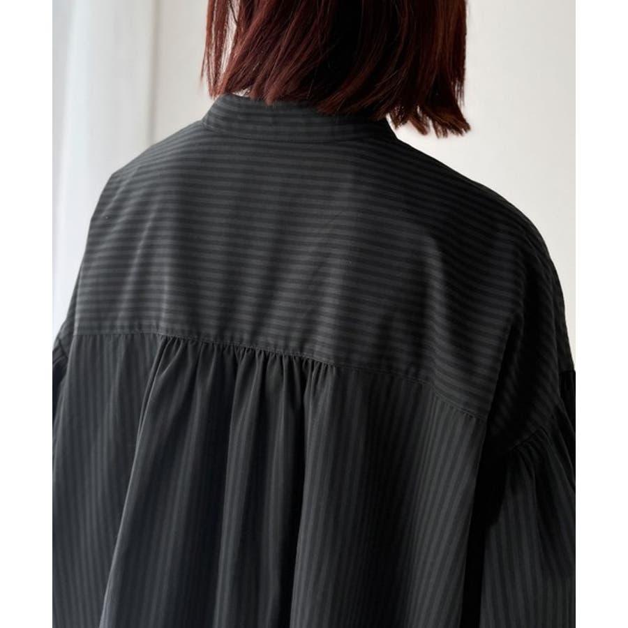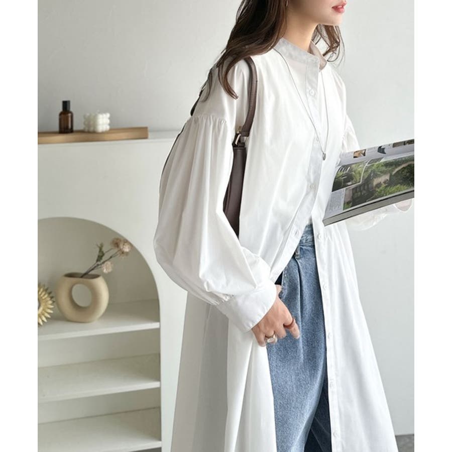 首元はすっきりとしたバンドカラー仕様で、全体にたっぷりギャザーを施したボリューム感のあるシャツワンピース。