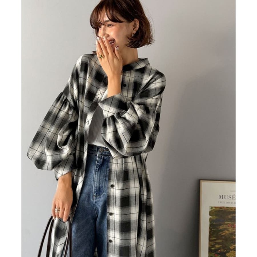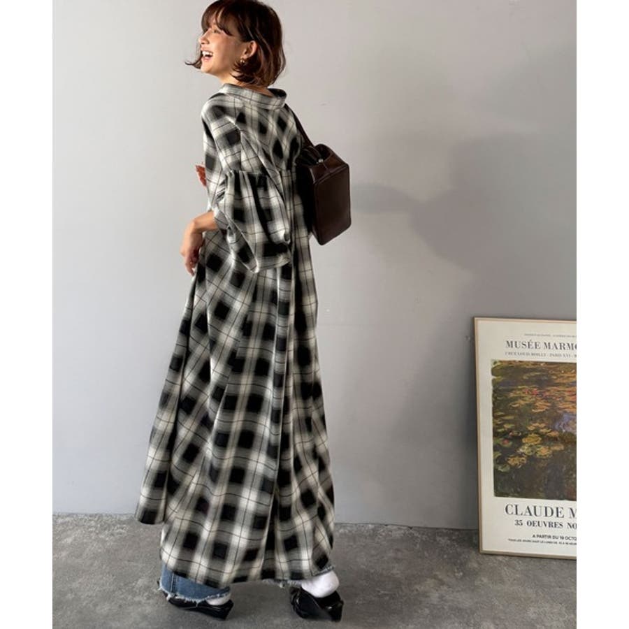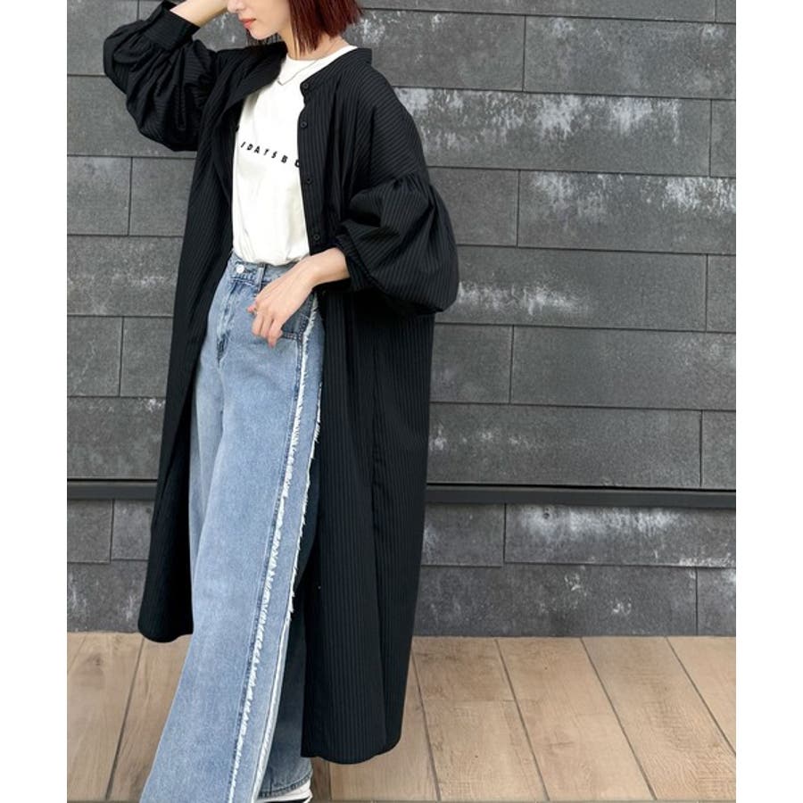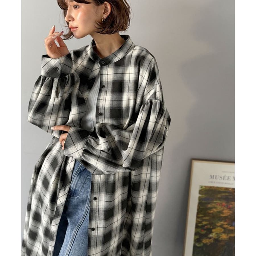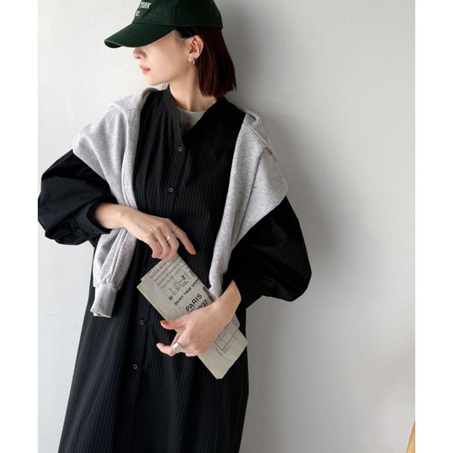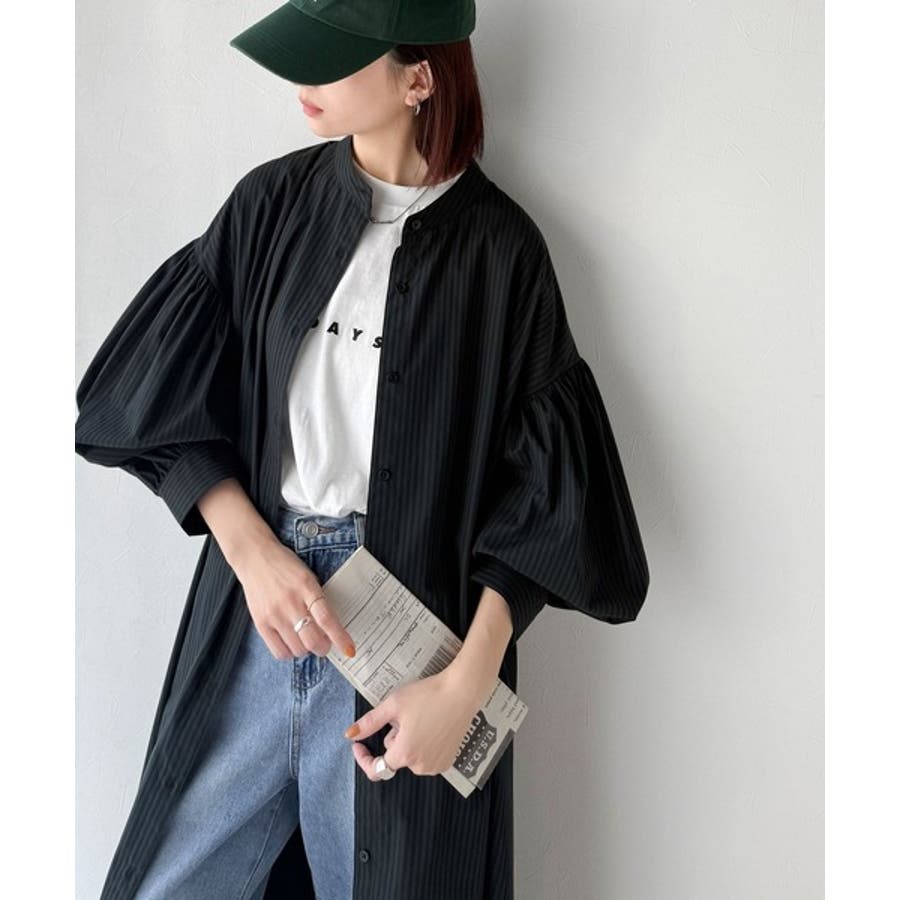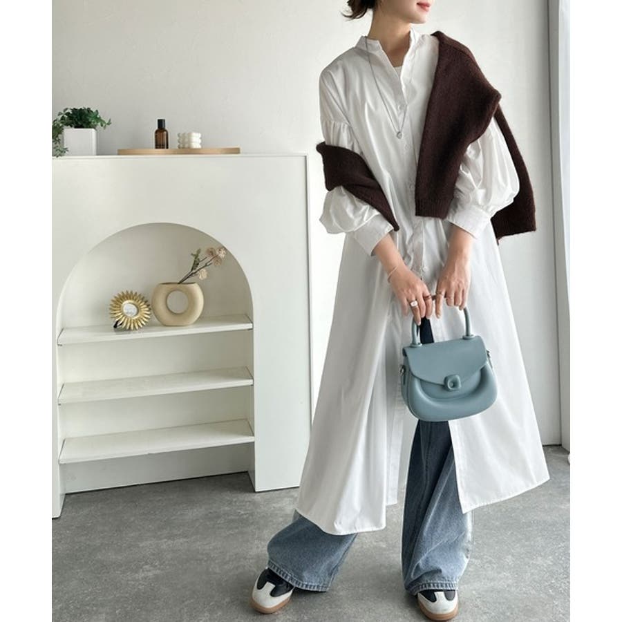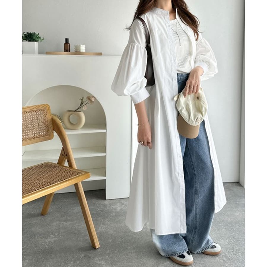 首元はすっきりとしたバンドカラー仕様で、全体にたっぷりギャザーを施したボリューム感のあるシャツワンピース。
