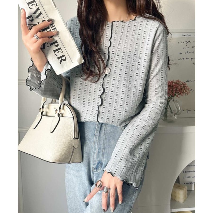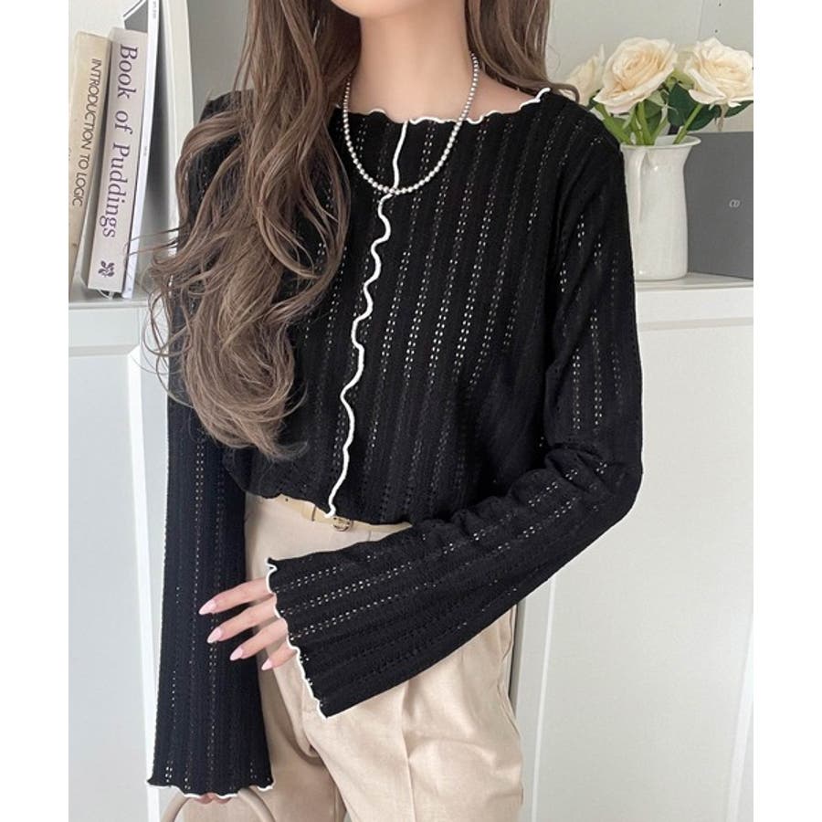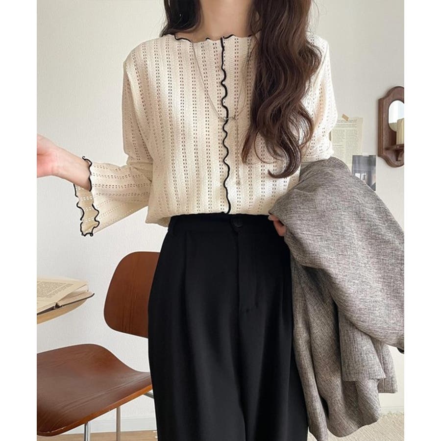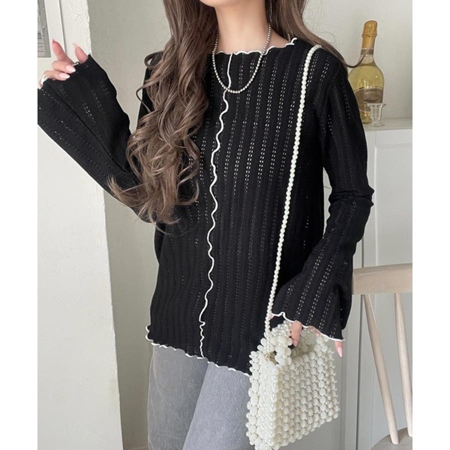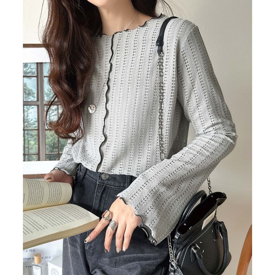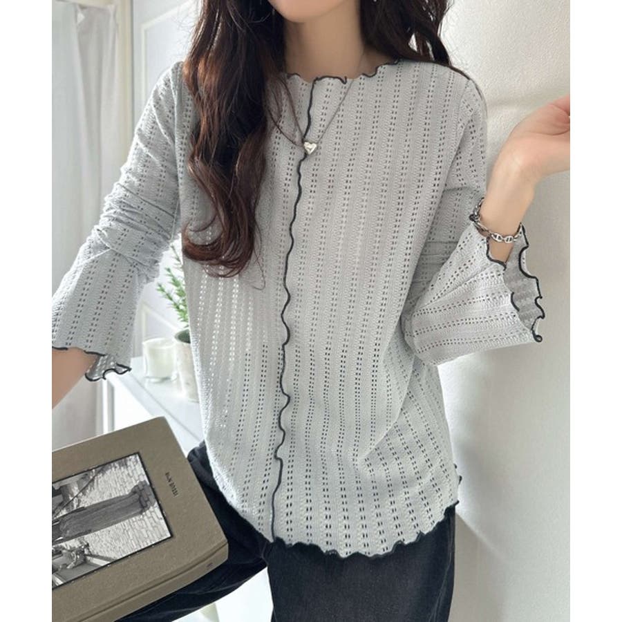 ほんのり色っぽ。透かし編みセンターメロウフレアスリーブトップスカットソー(長袖)