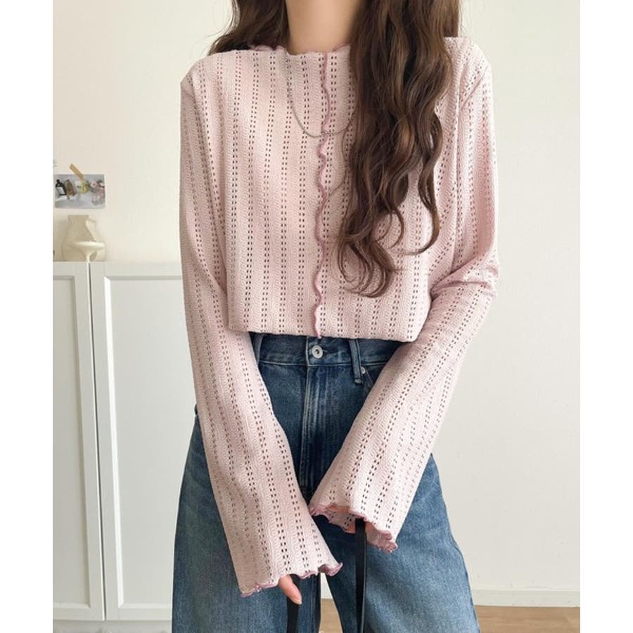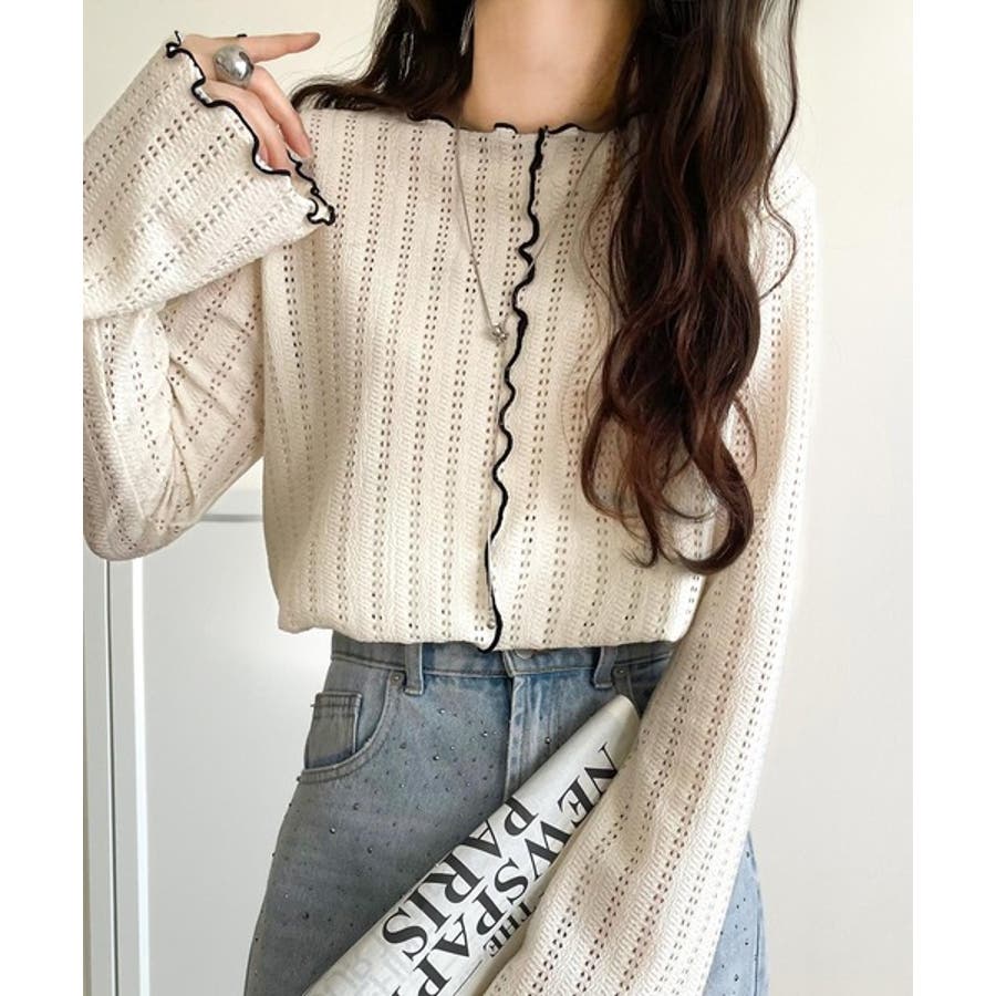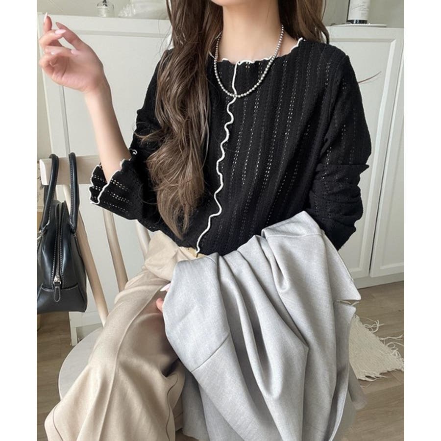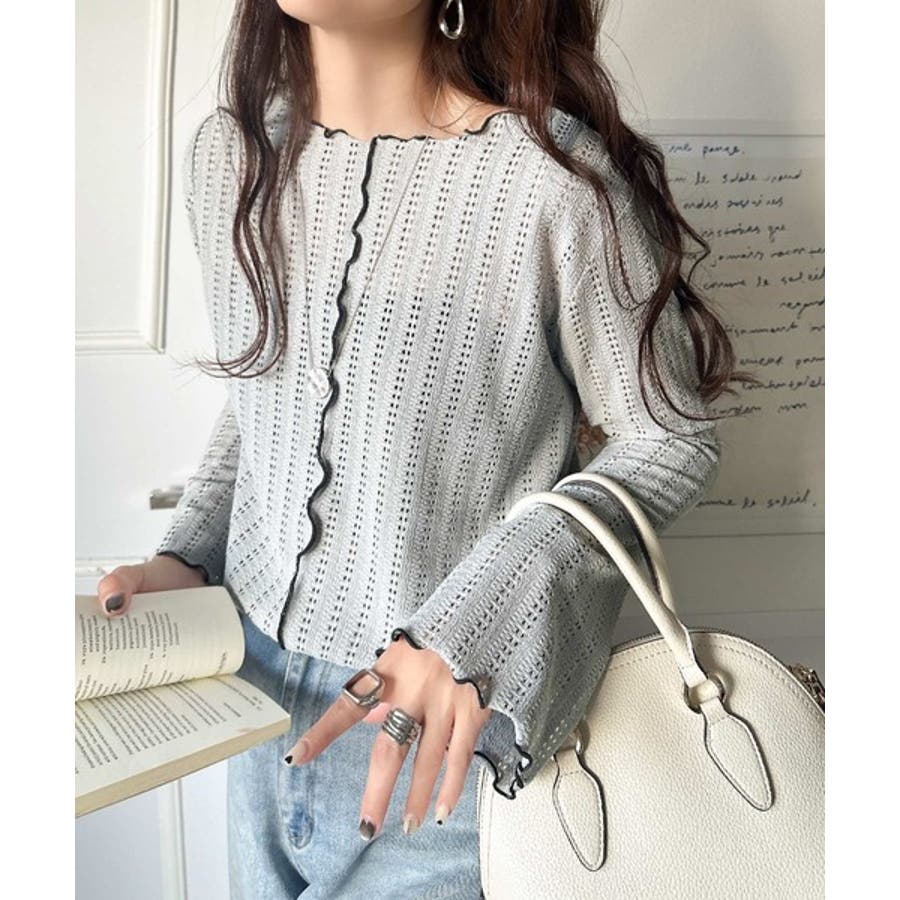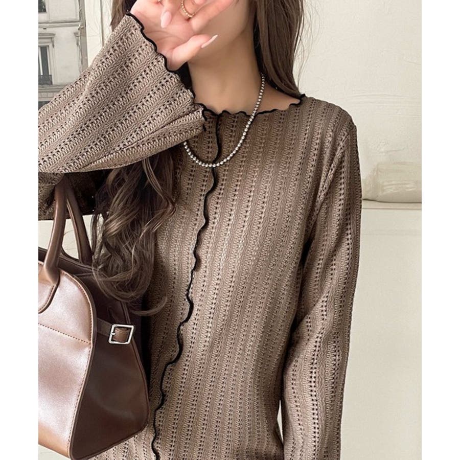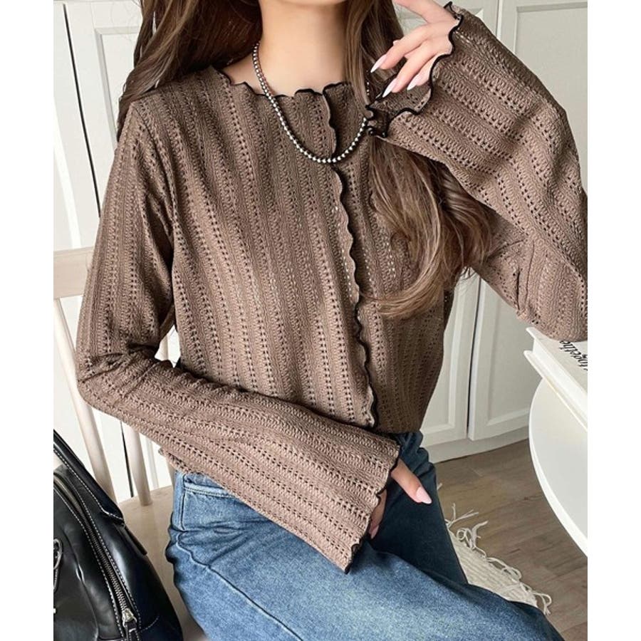 ほんのり色っぽ。透かし編みセンターメロウフレアスリーブトップスカットソー(長袖)