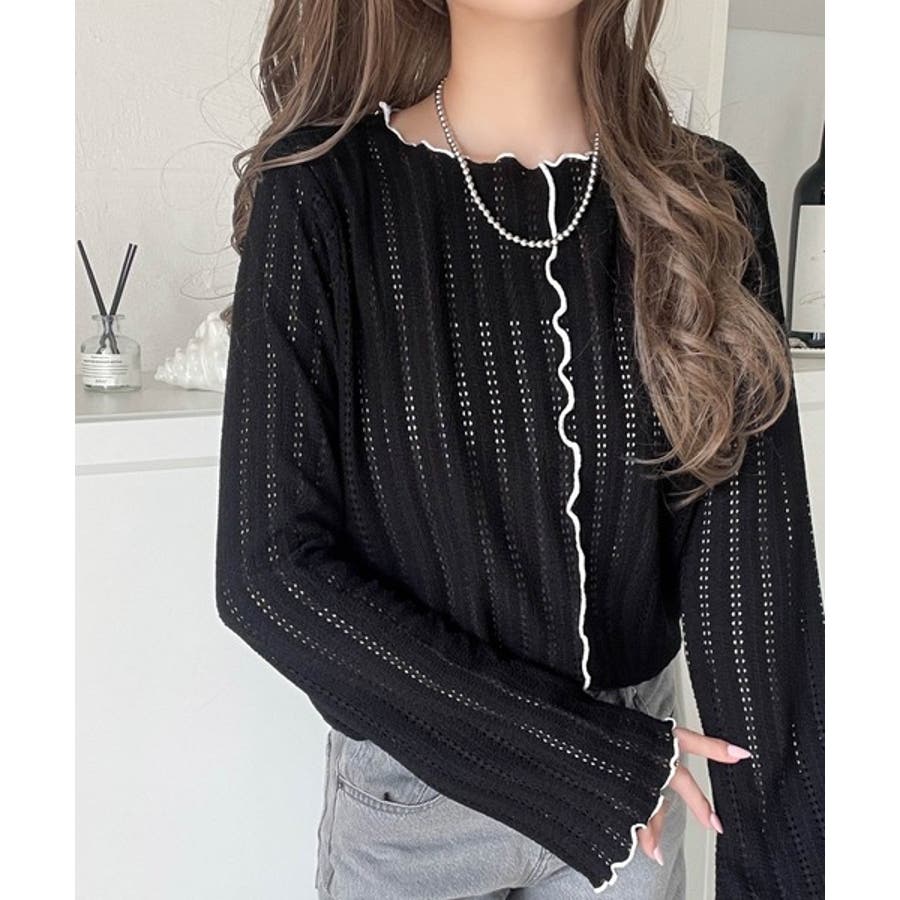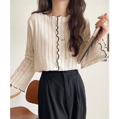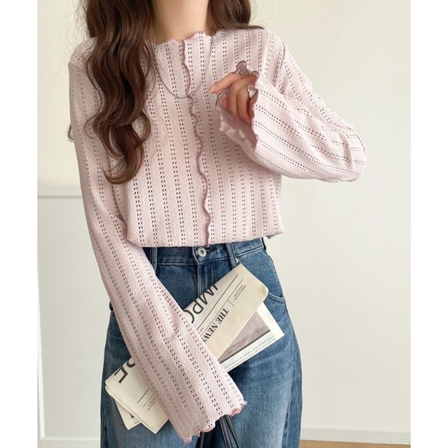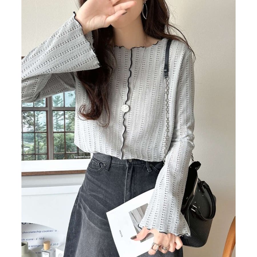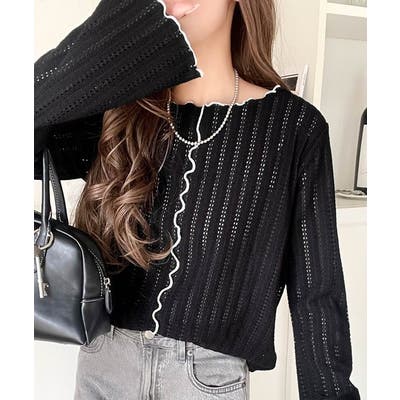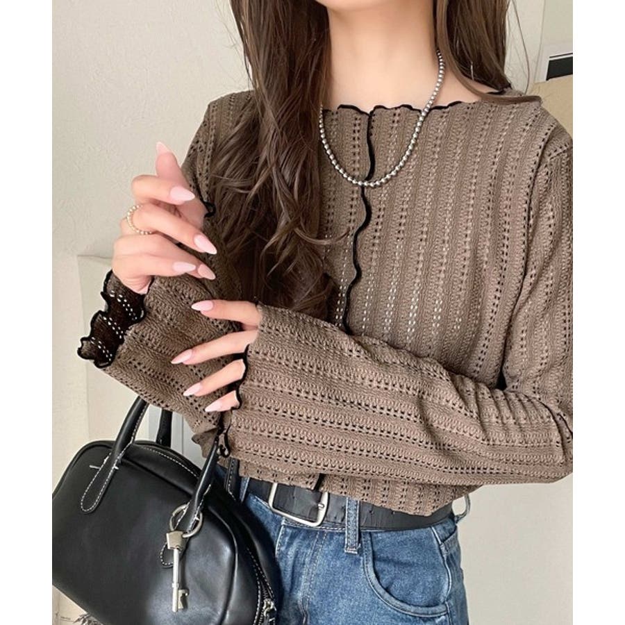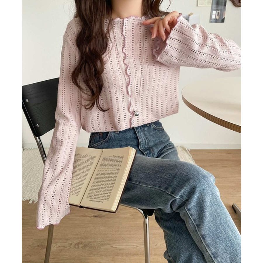 ほんのり色っぽ。透かし編みセンターメロウフレアスリーブトップスカットソー(長袖)
