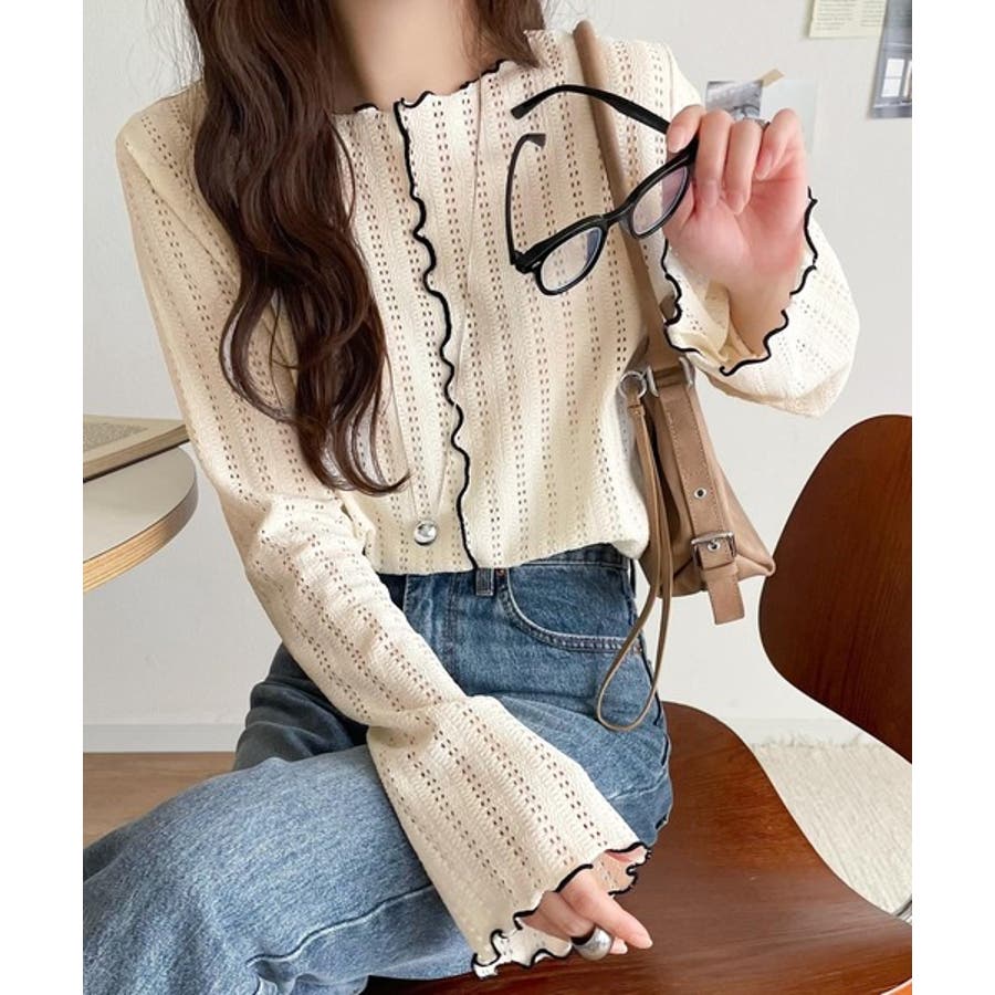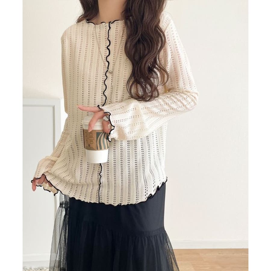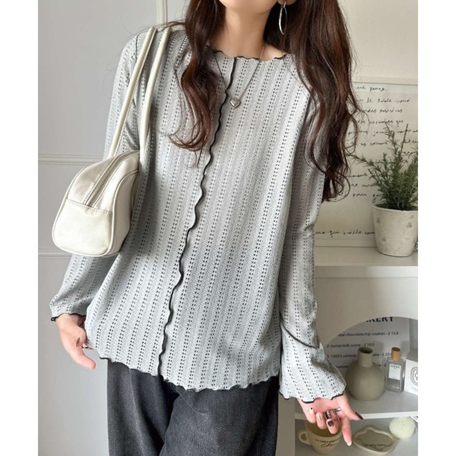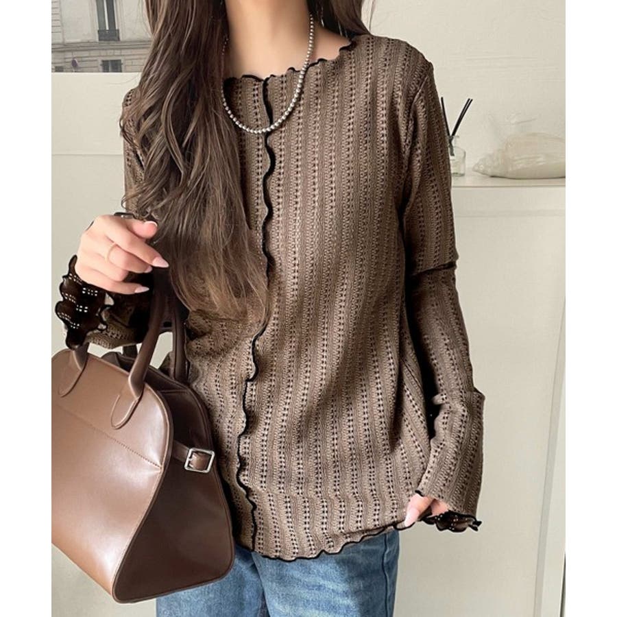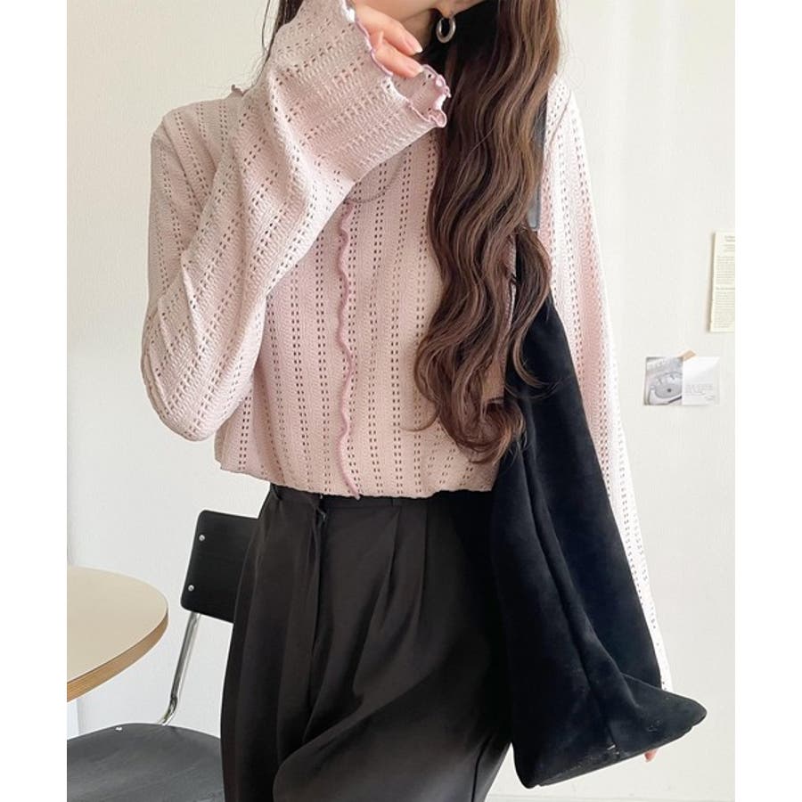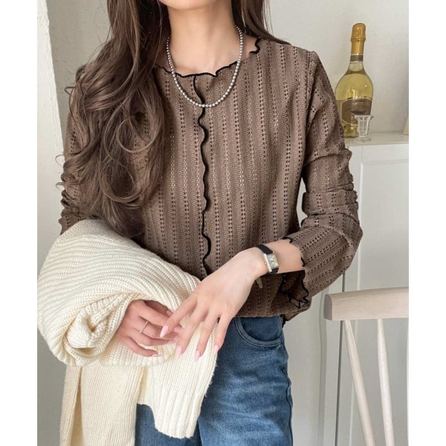 ほんのり色っぽ。透かし編みセンターメロウフレアスリーブトップスカットソー(長袖)