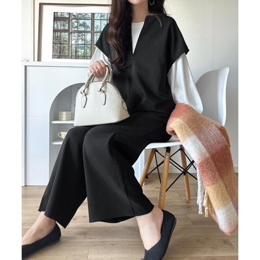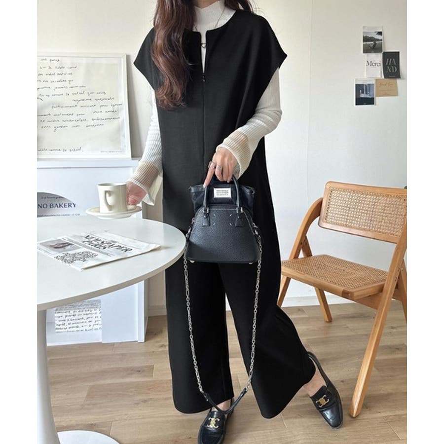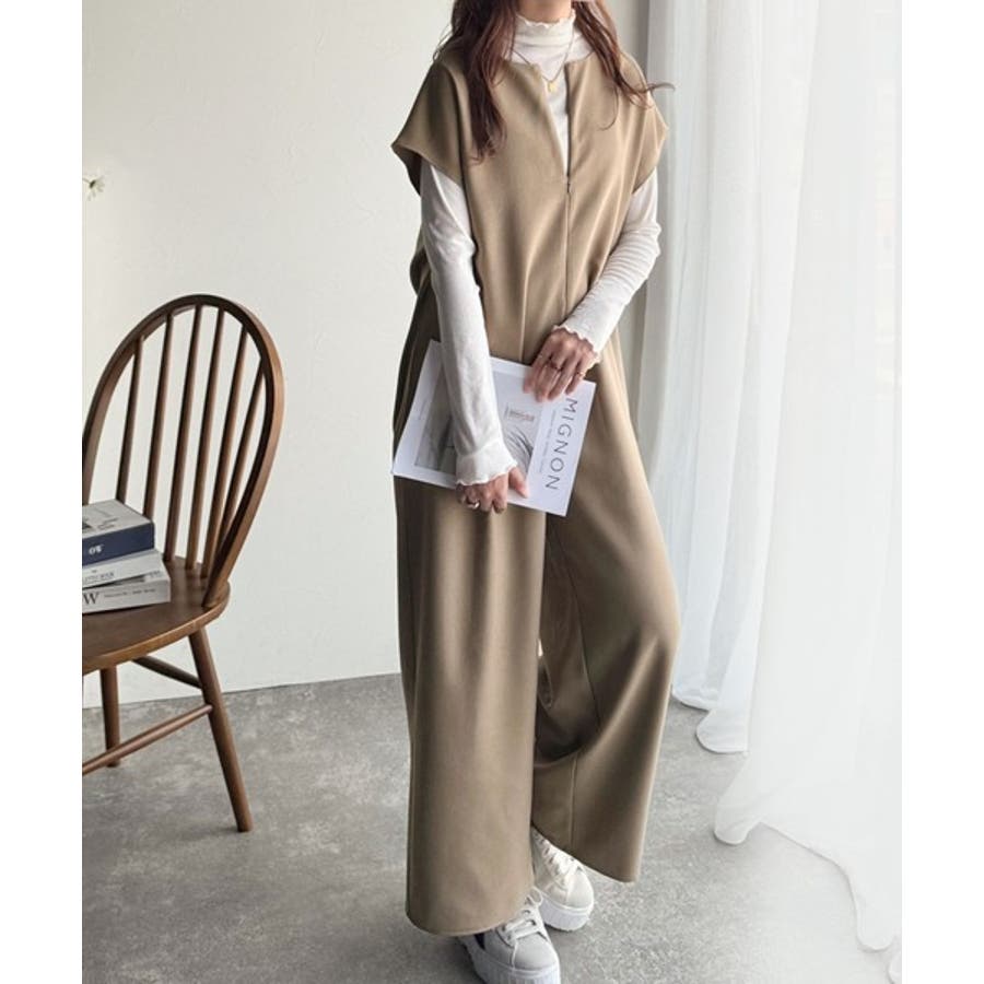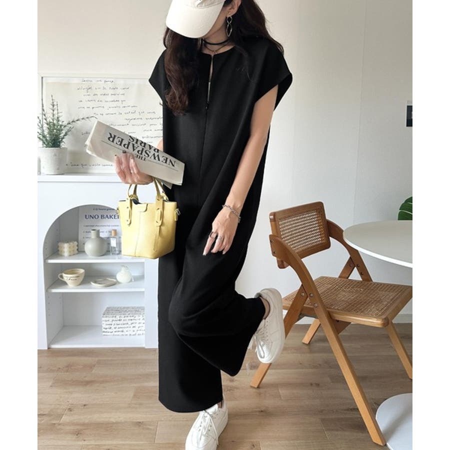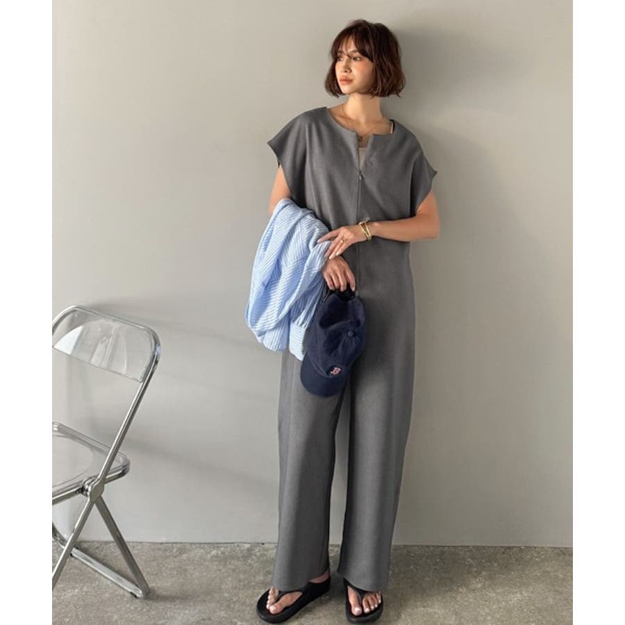シンプルだけど、襟元に大人の抜け感。ハーフジップオールインワン