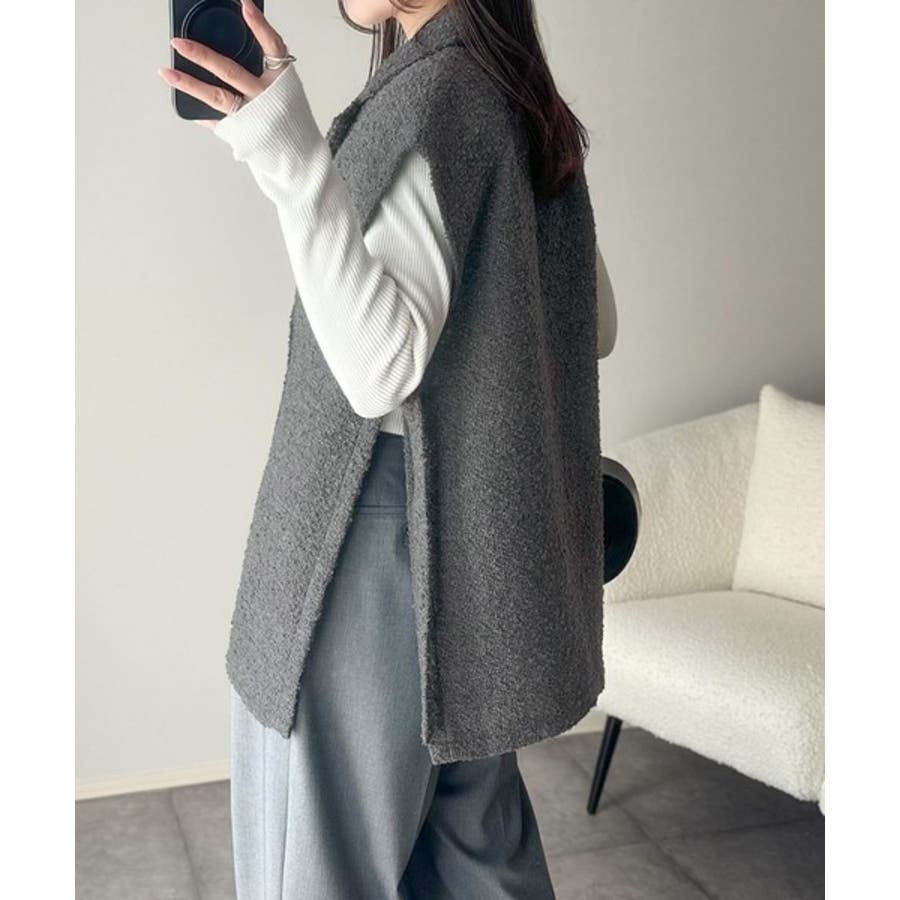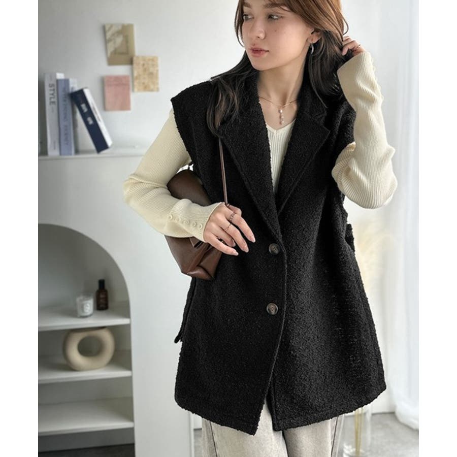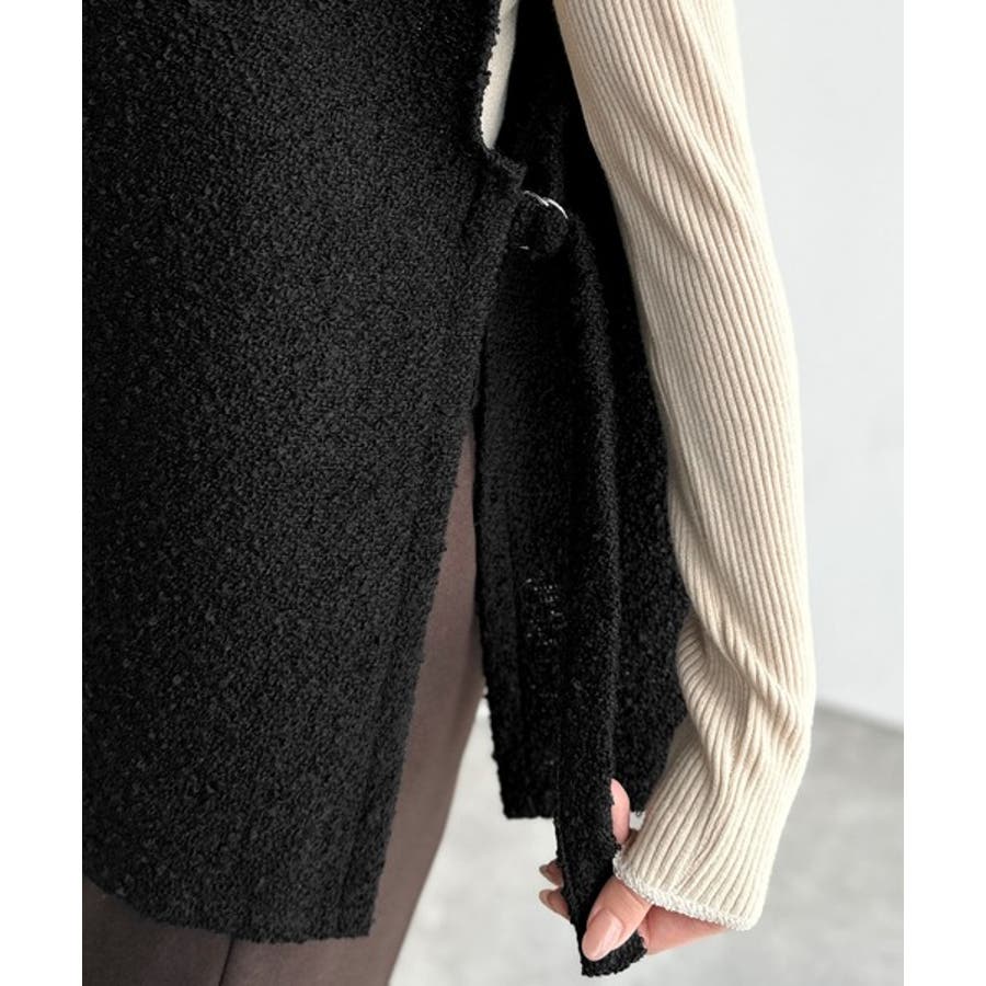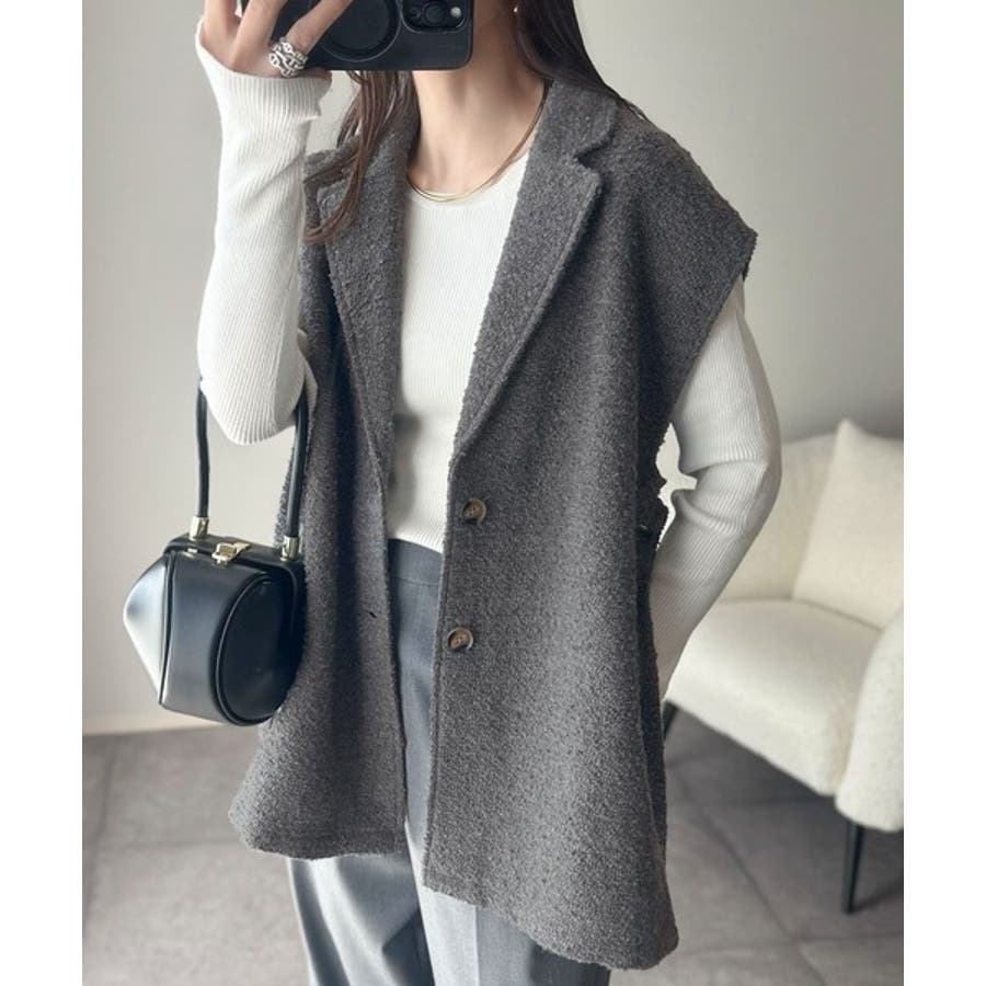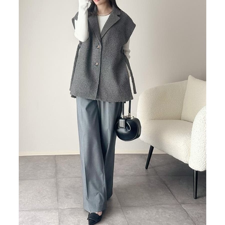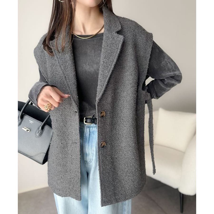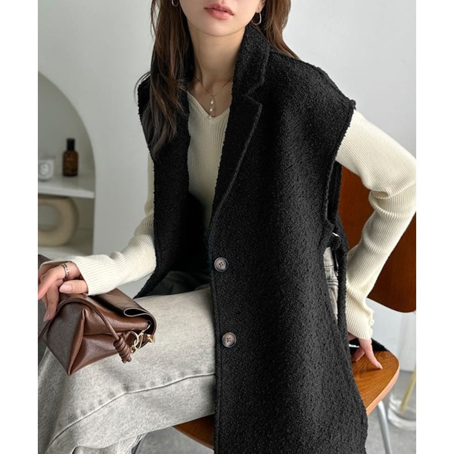 シンプルで洗練された大人の雰囲気を演出。サイドベルトブークレシングルジレベスト