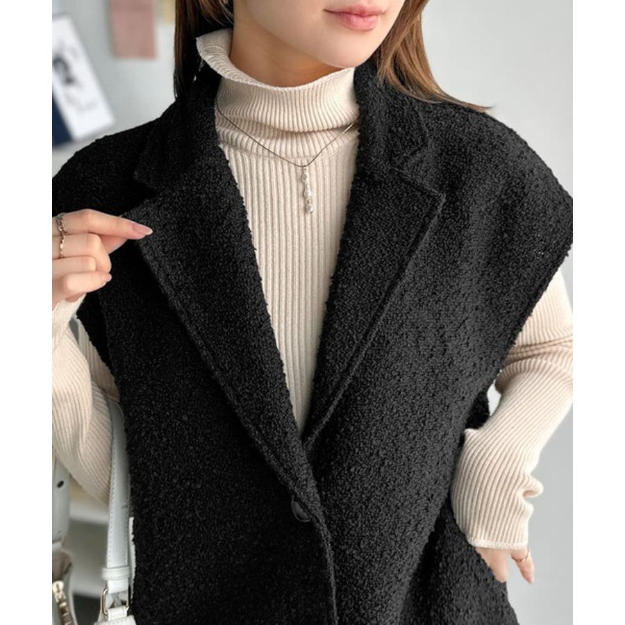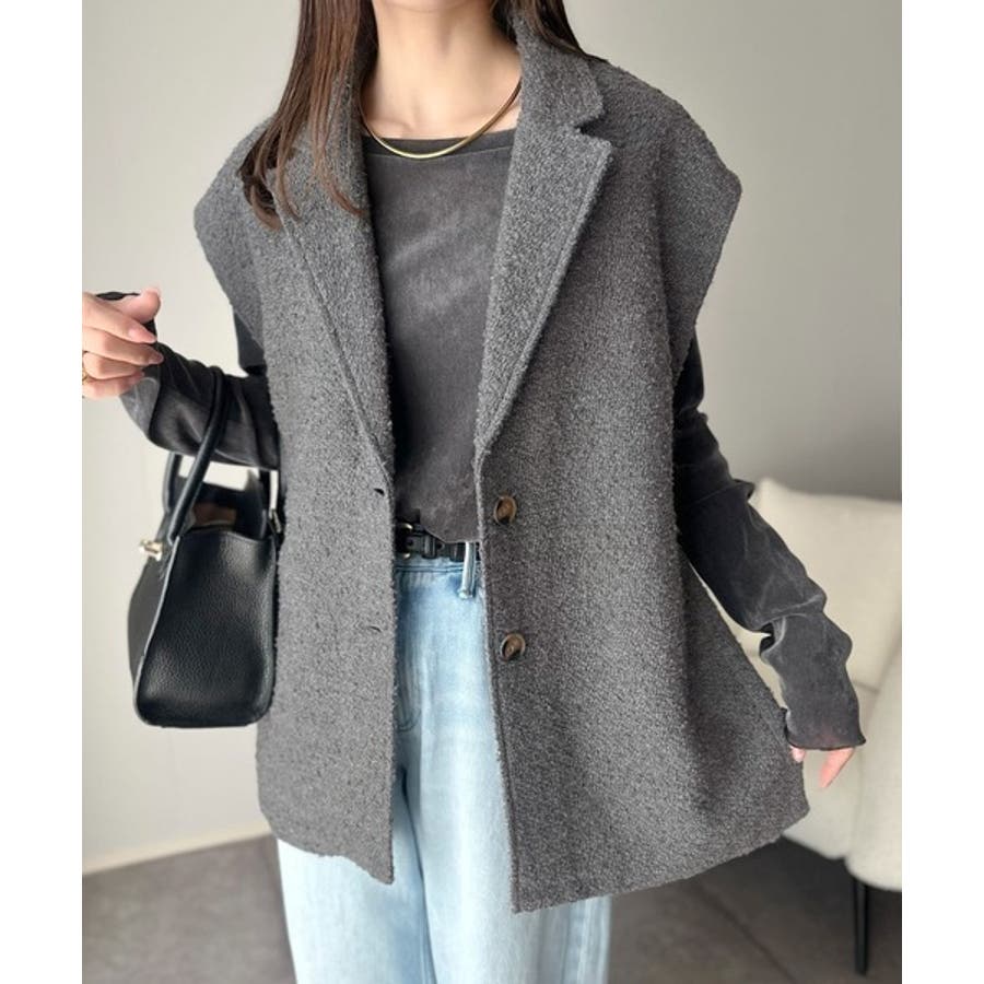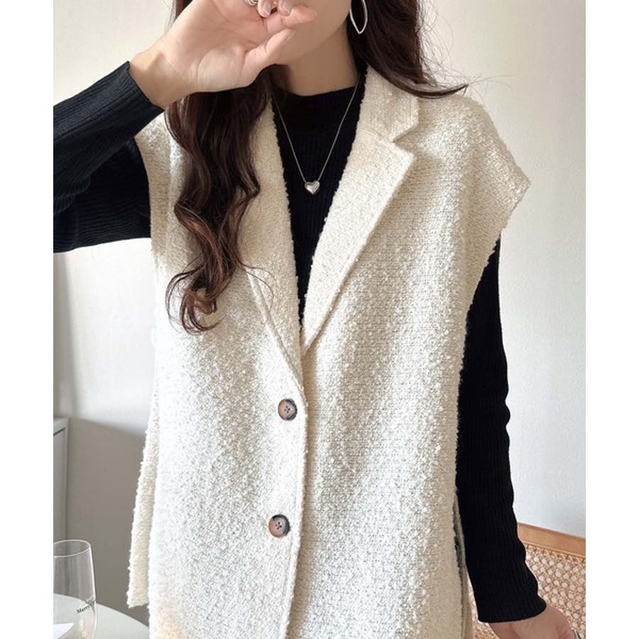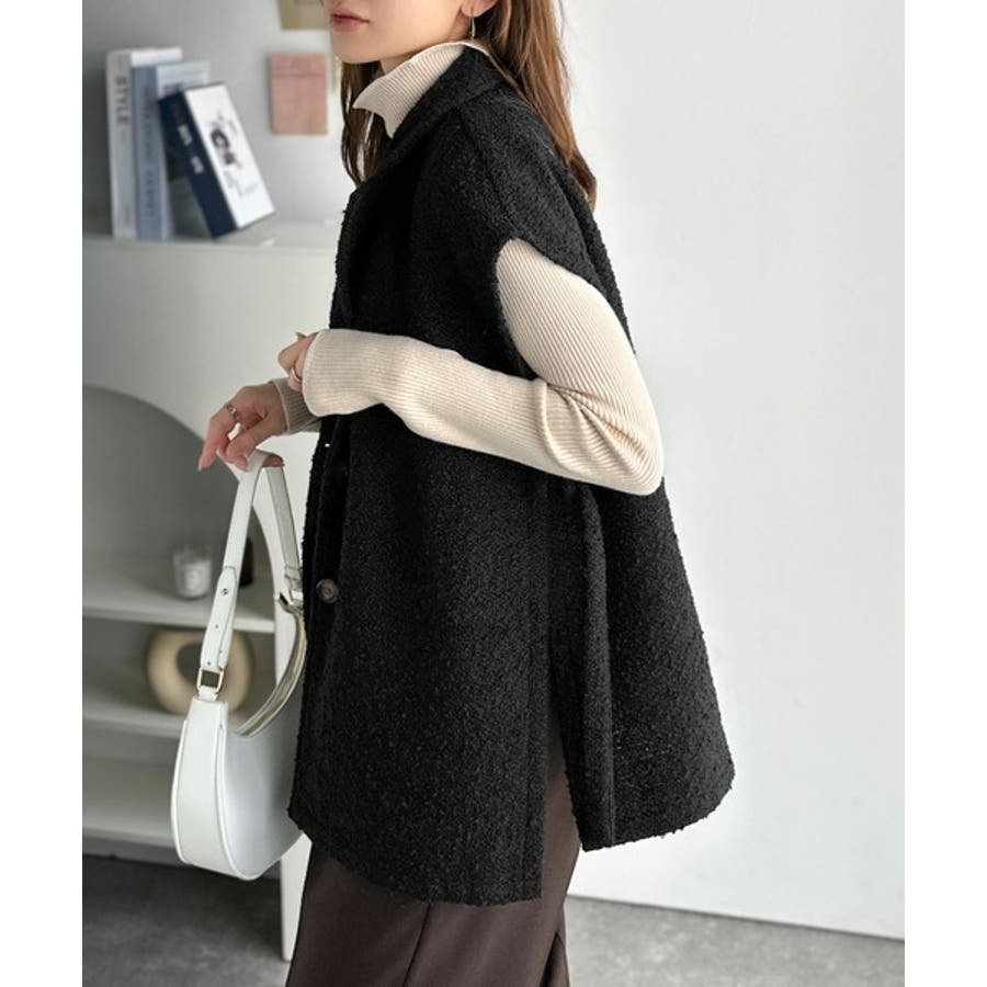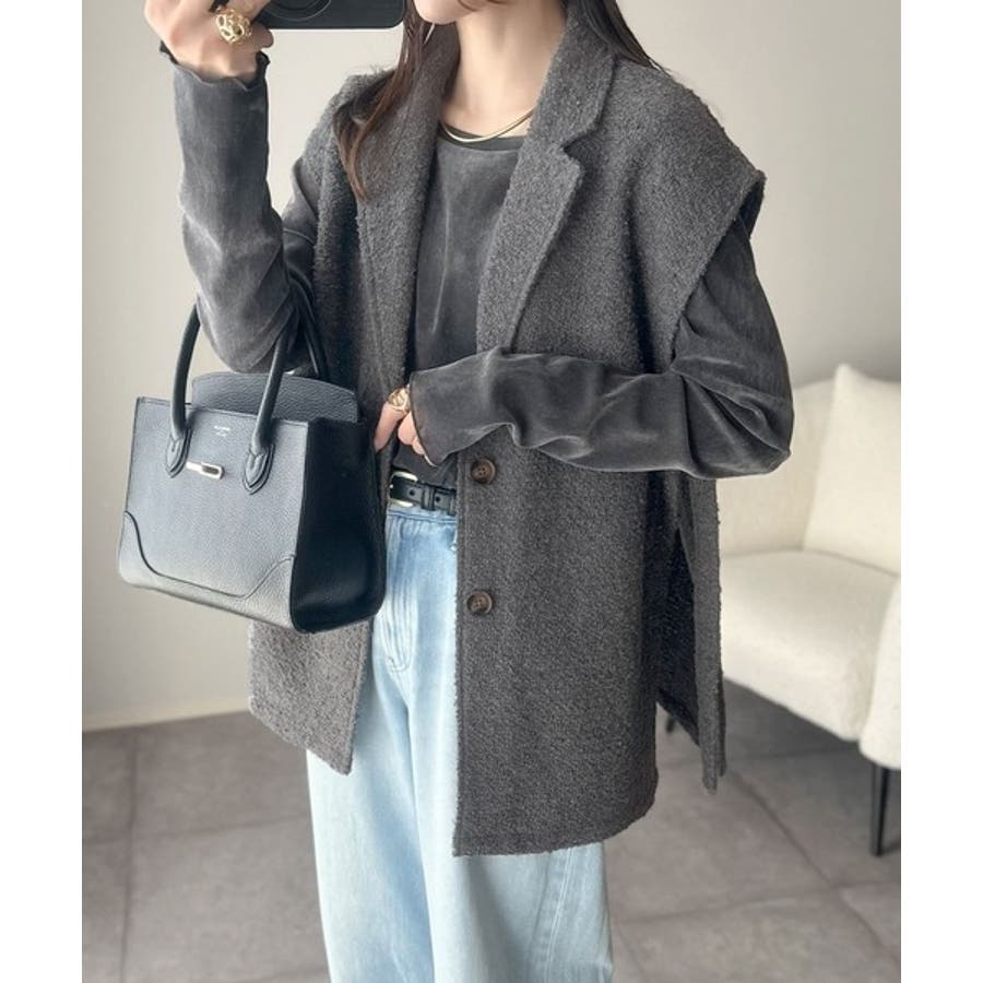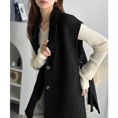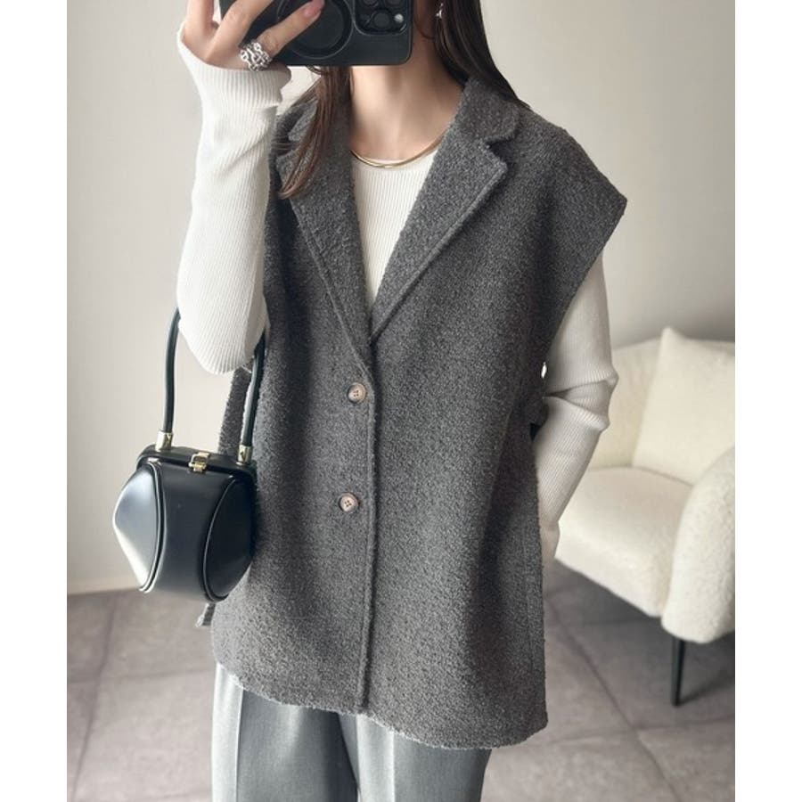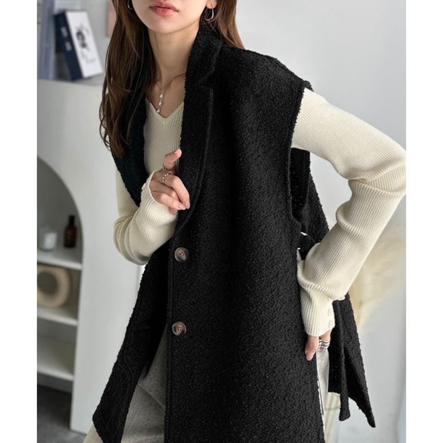 シンプルで洗練された大人の雰囲気を演出。サイドベルトブークレシングルジレベスト