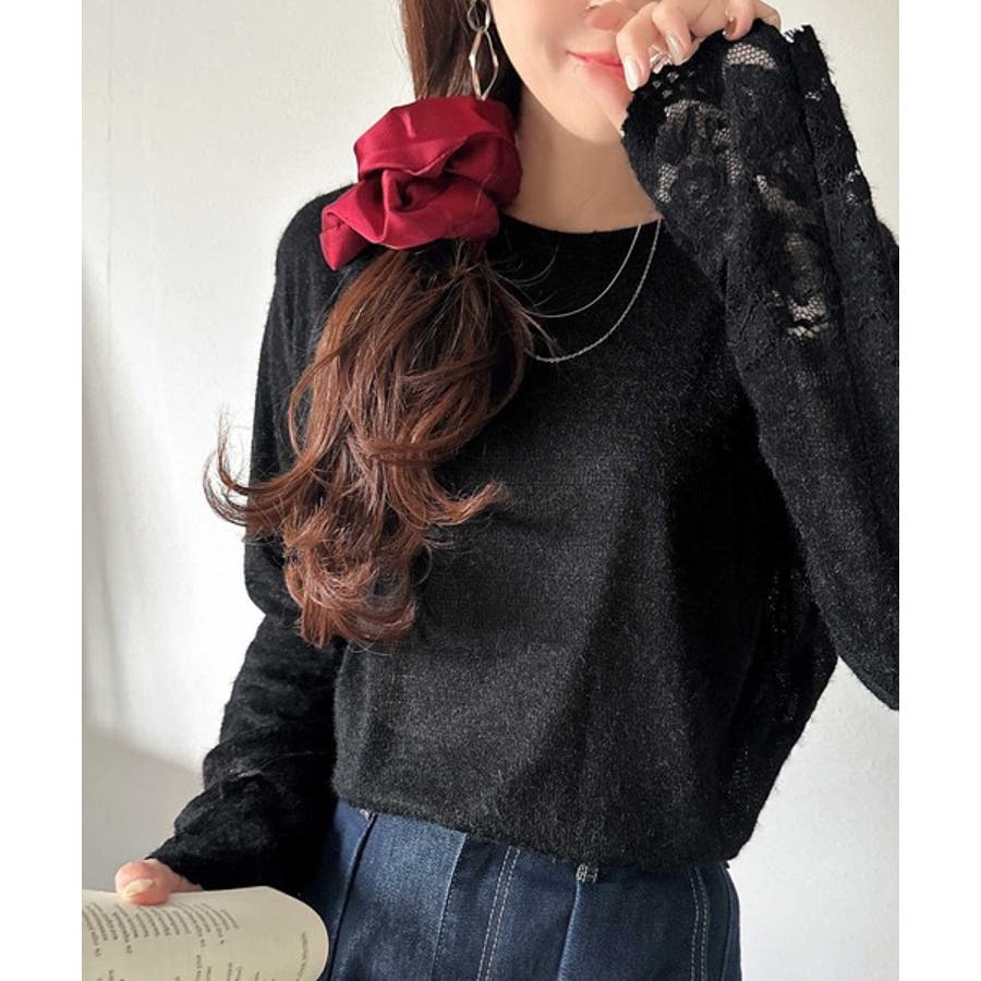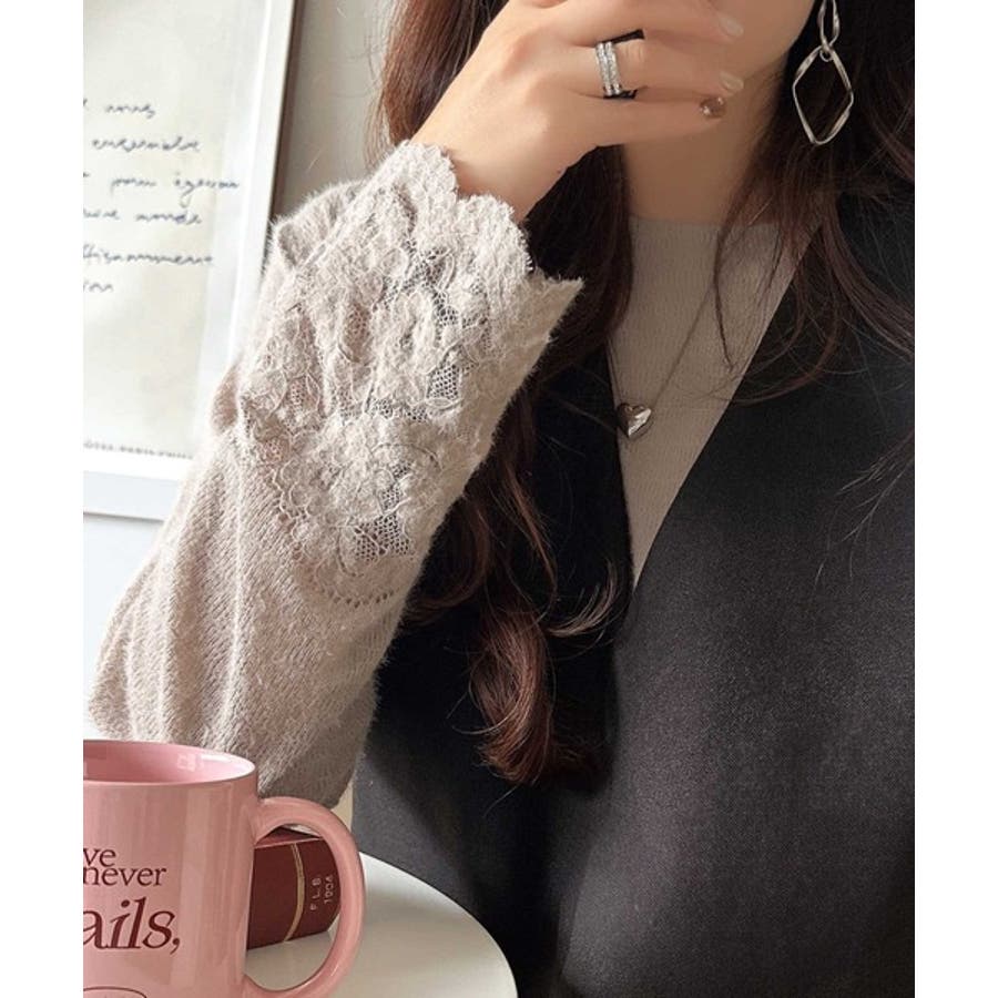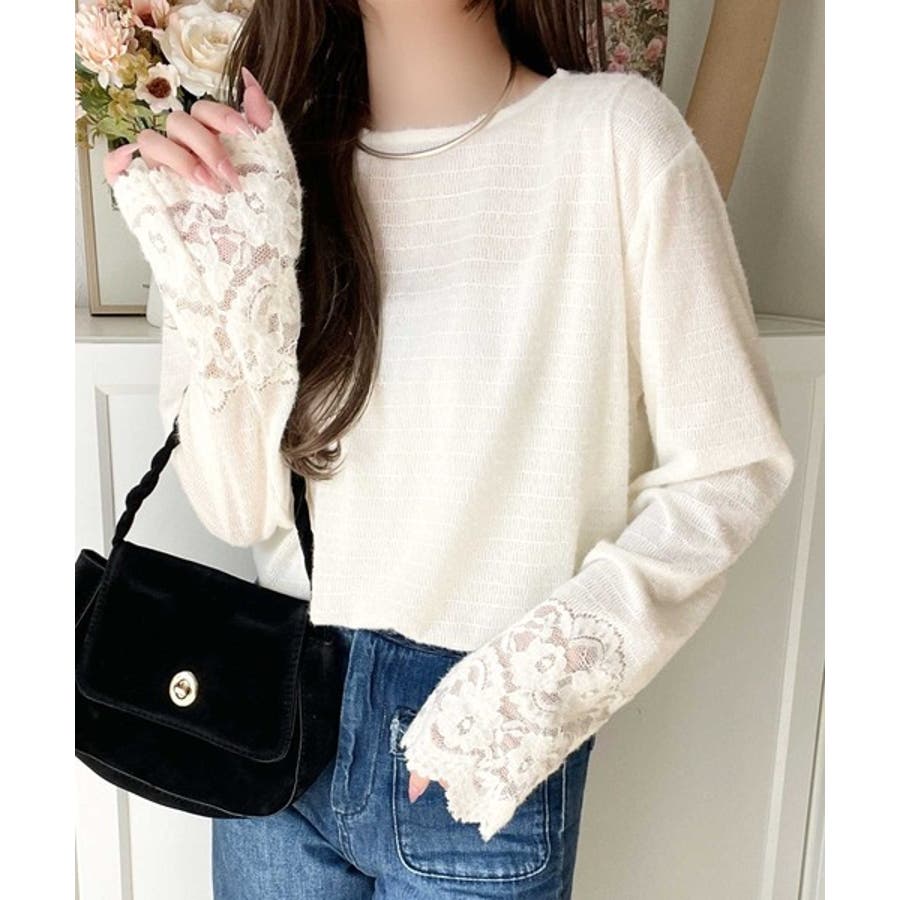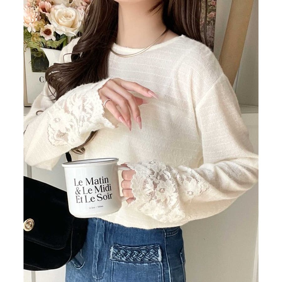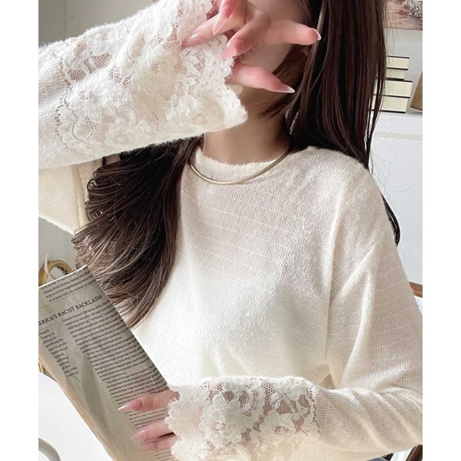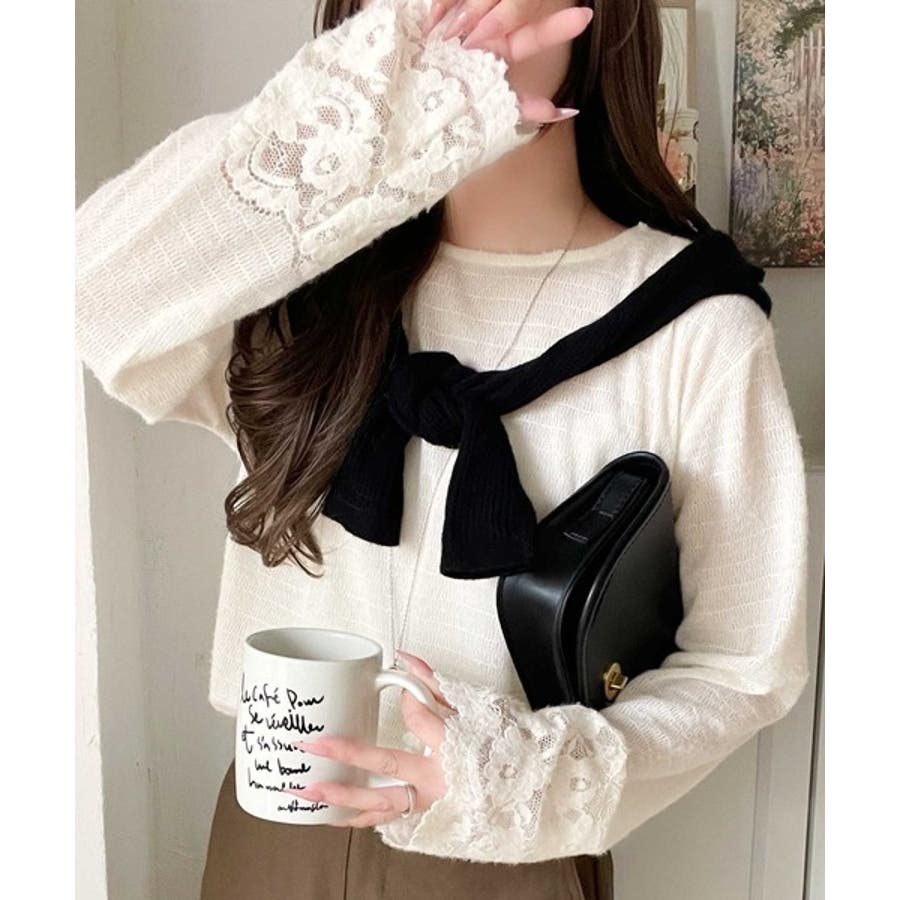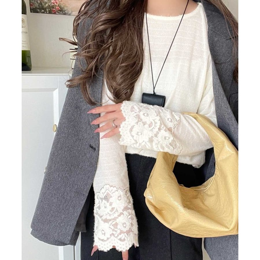 袖口に繊細な花柄レースをスカラップ仕立てであしらい、手元を華やかに彩るニットソー。
