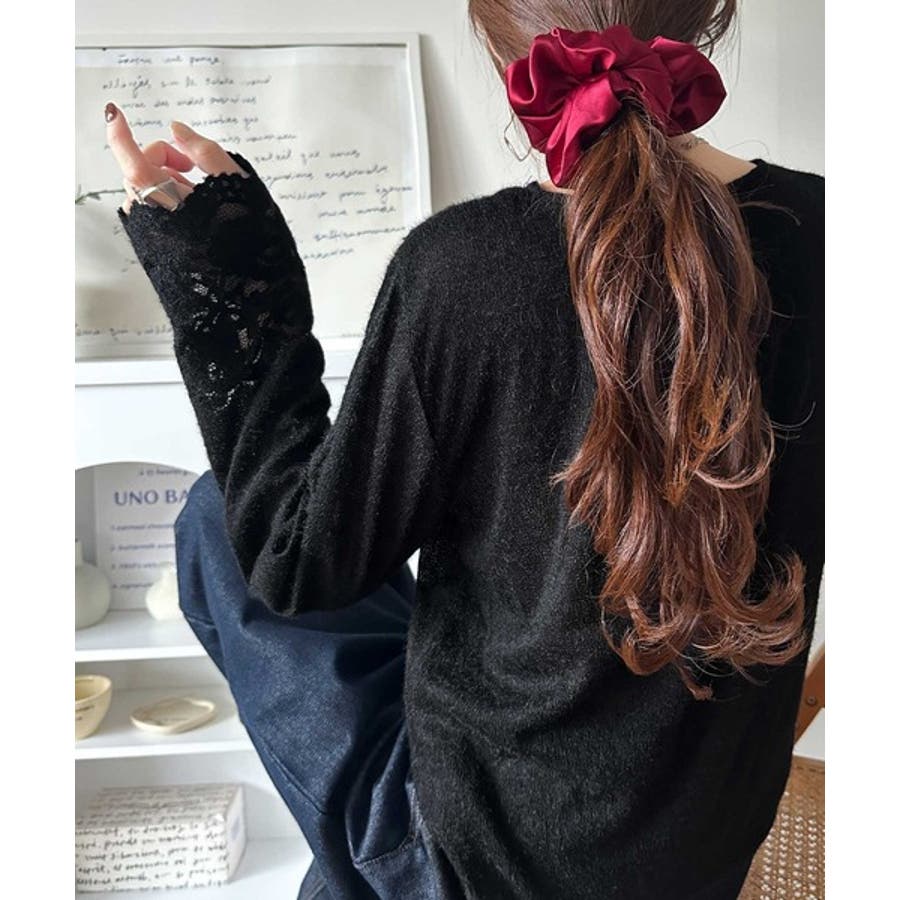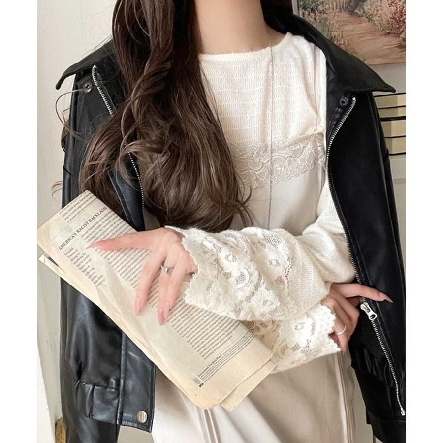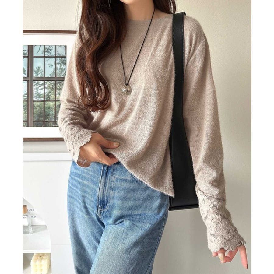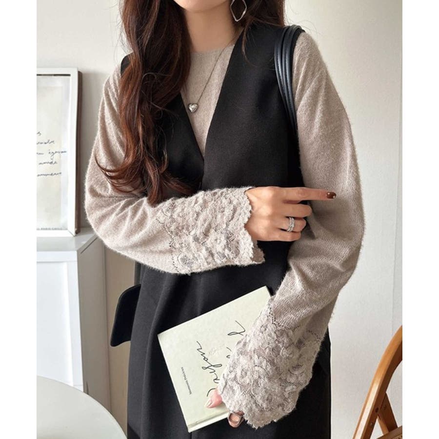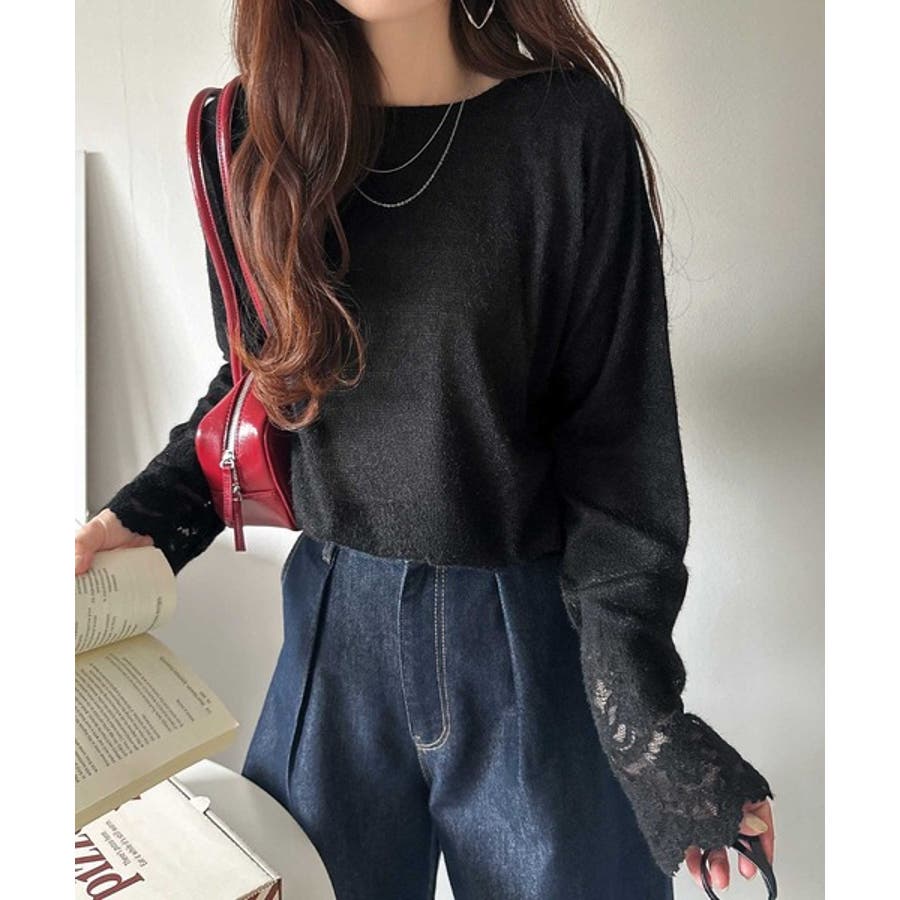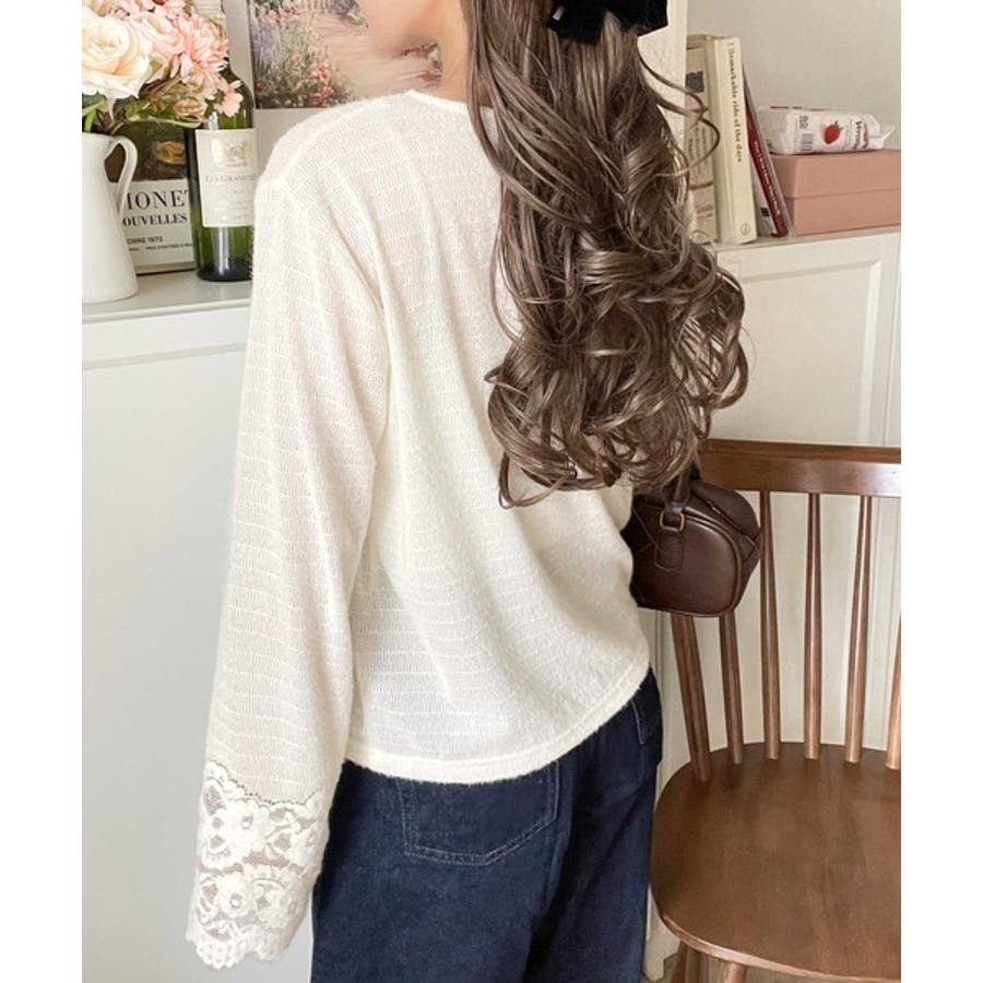 袖口に繊細な花柄レースをスカラップ仕立てであしらい、手元を華やかに彩るニットソー。