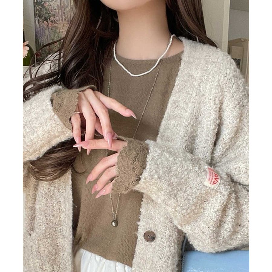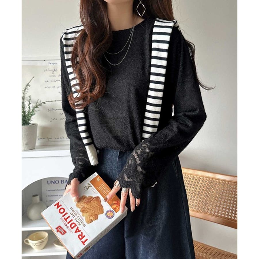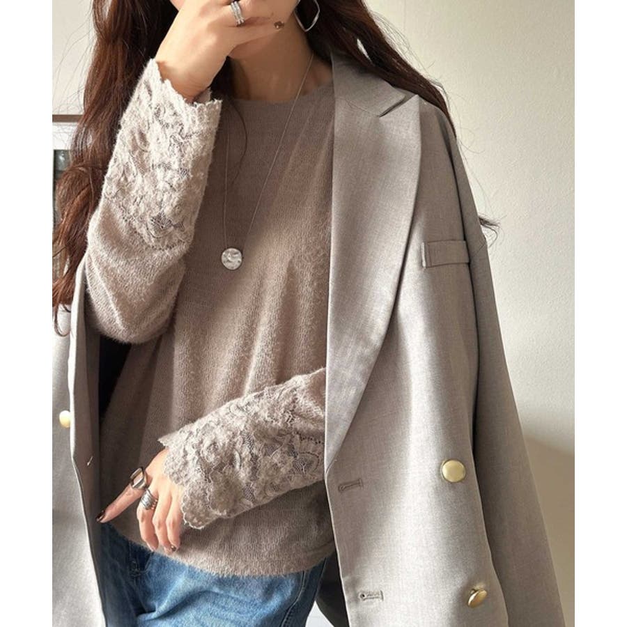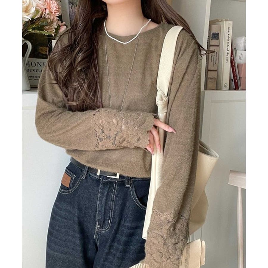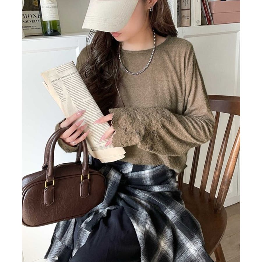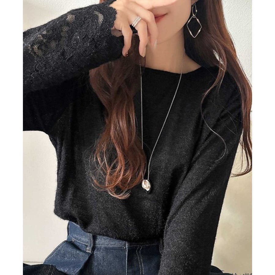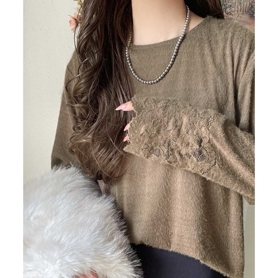 袖口に繊細な花柄レースをスカラップ仕立てであしらい、手元を華やかに彩るニットソー。