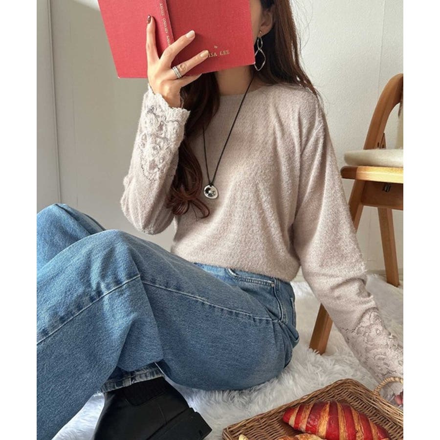 手元から華やぐ♪シーズンムード抜群、袖フラワーレース起毛トップス