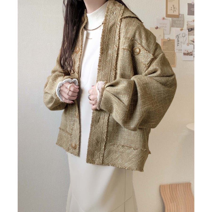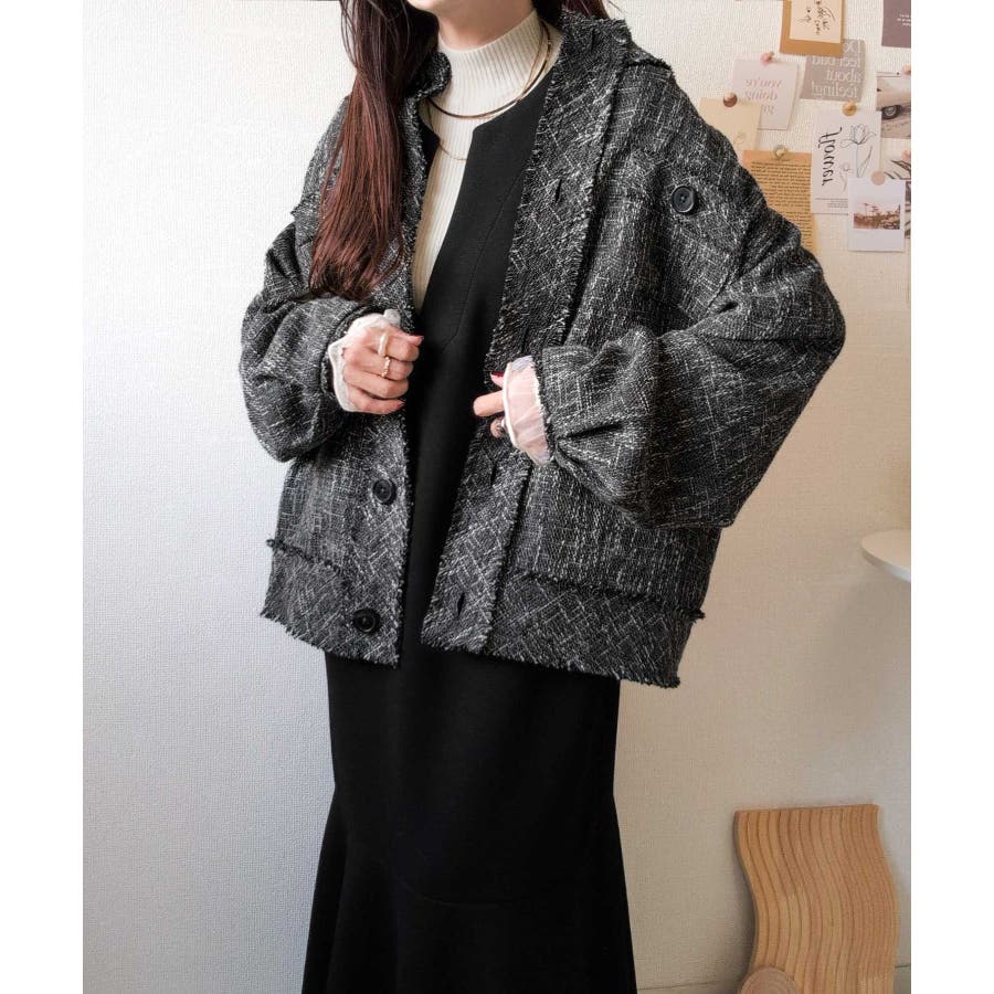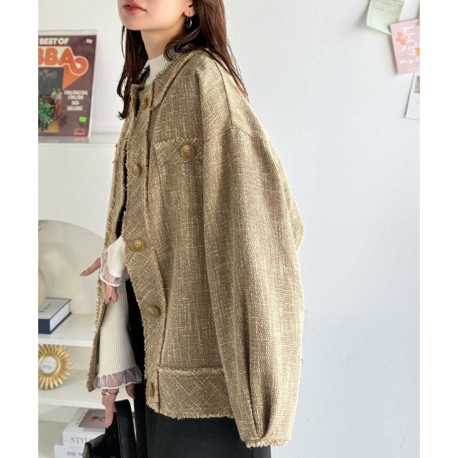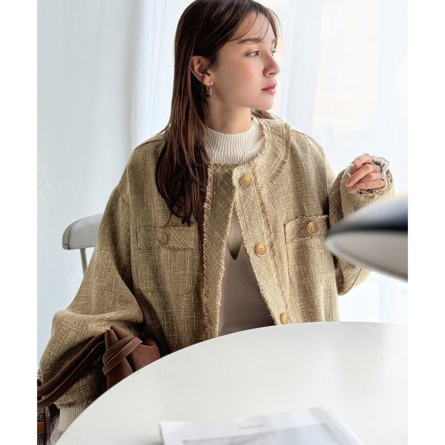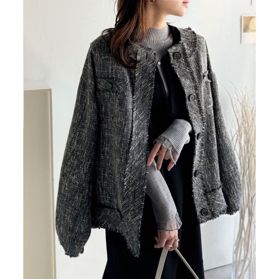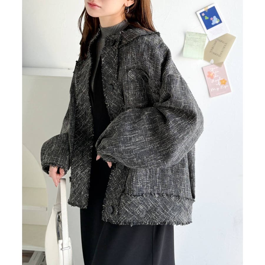 ふんわりとしたコクーンシルエットが女性らしい柔らかさを引き立てるツイードジャケット。