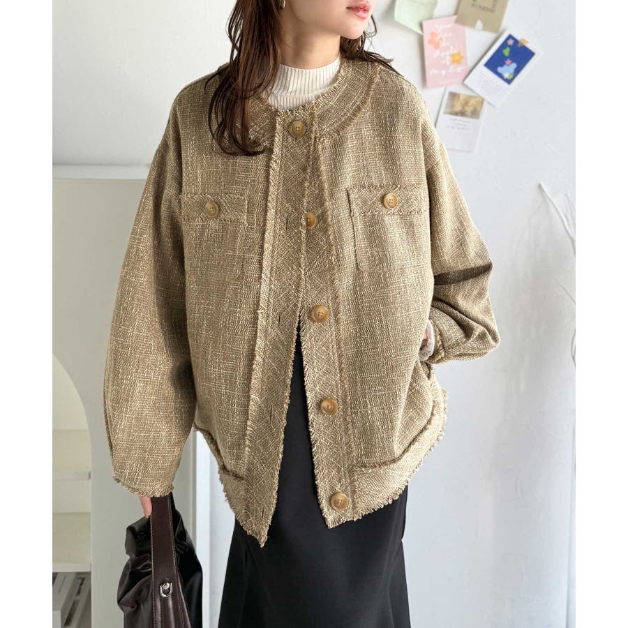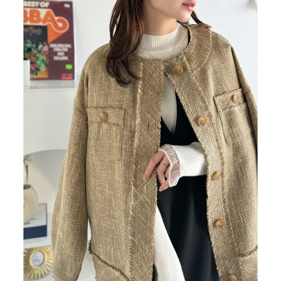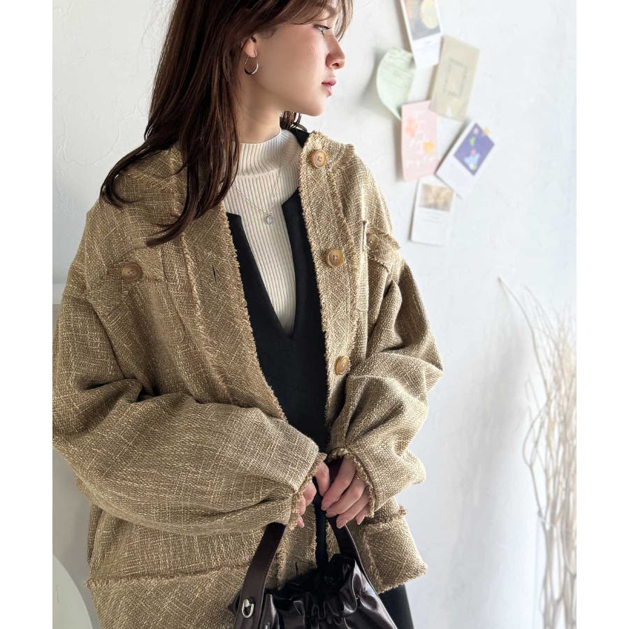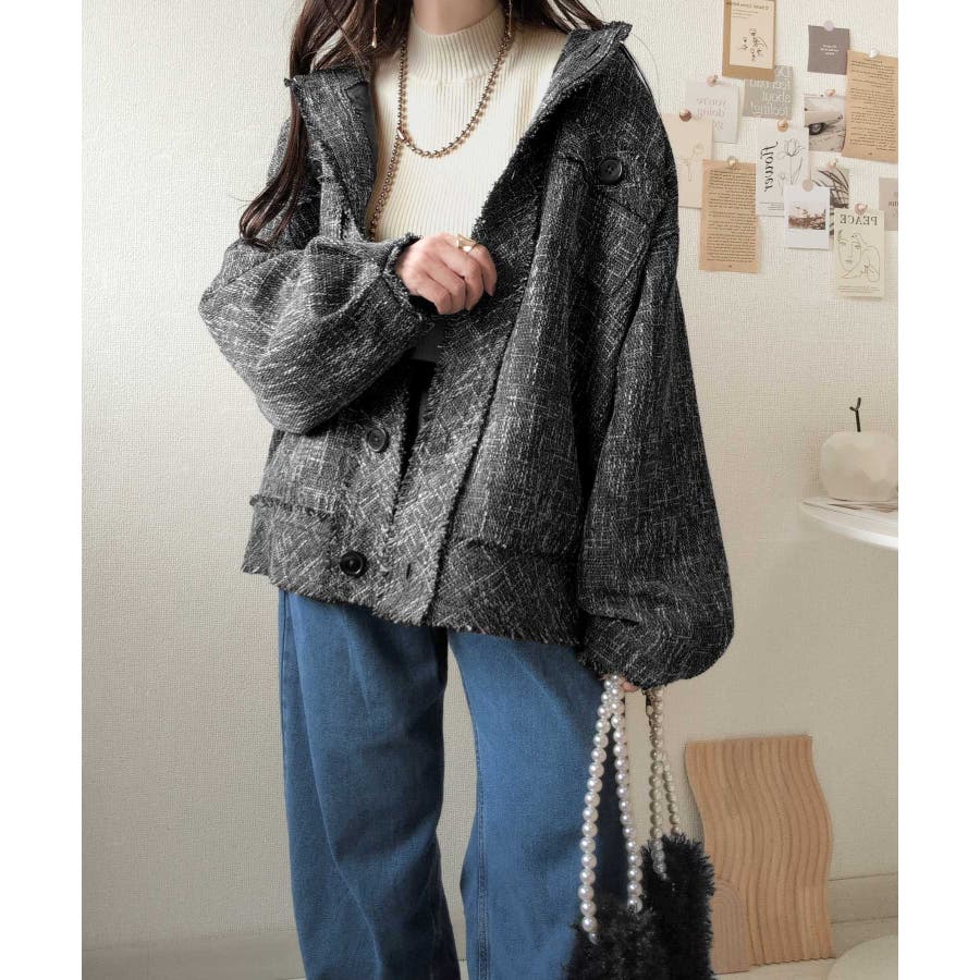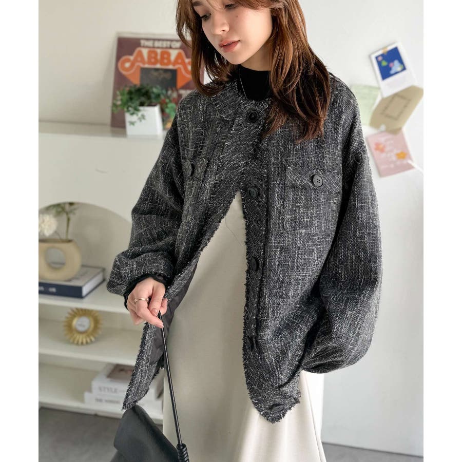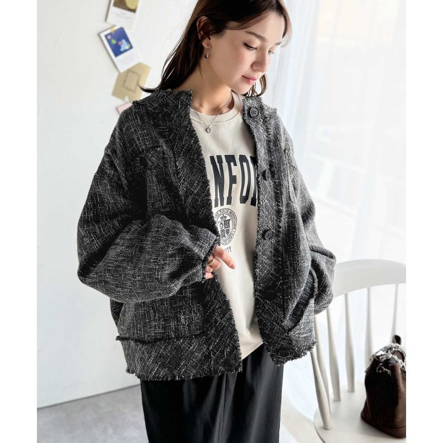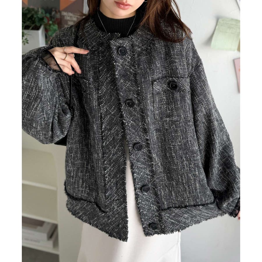 ふんわりとしたコクーンシルエットが女性らしい柔らかさを引き立てるツイードジャケット。