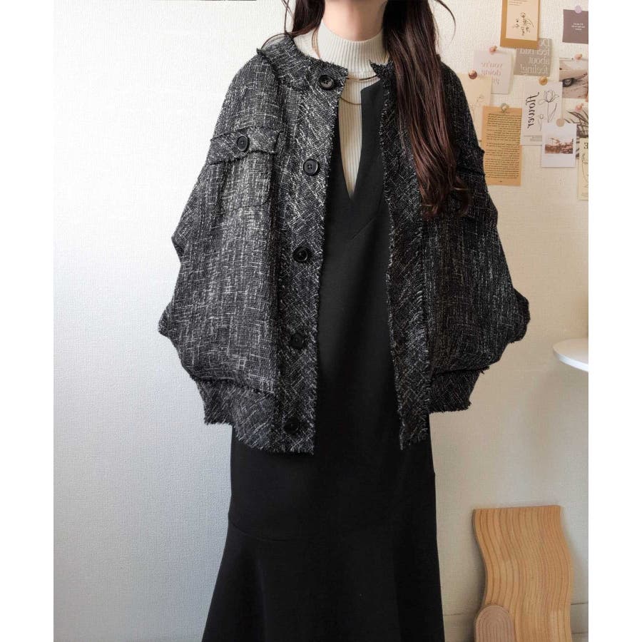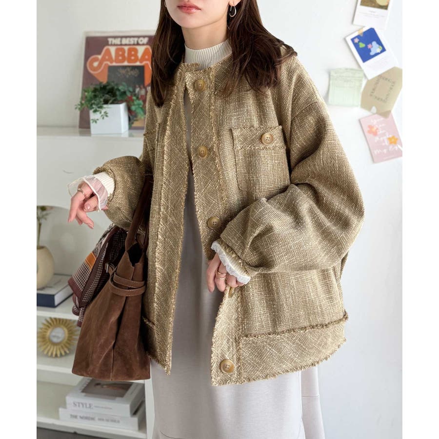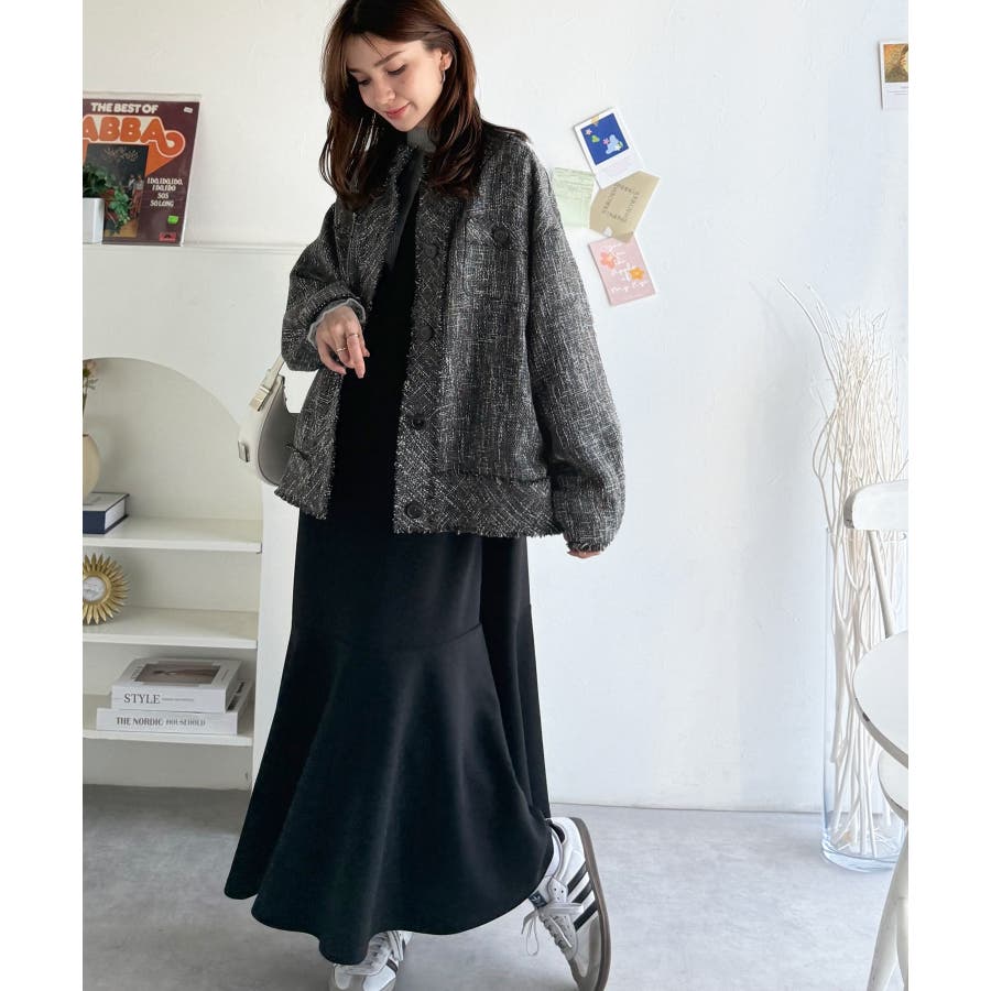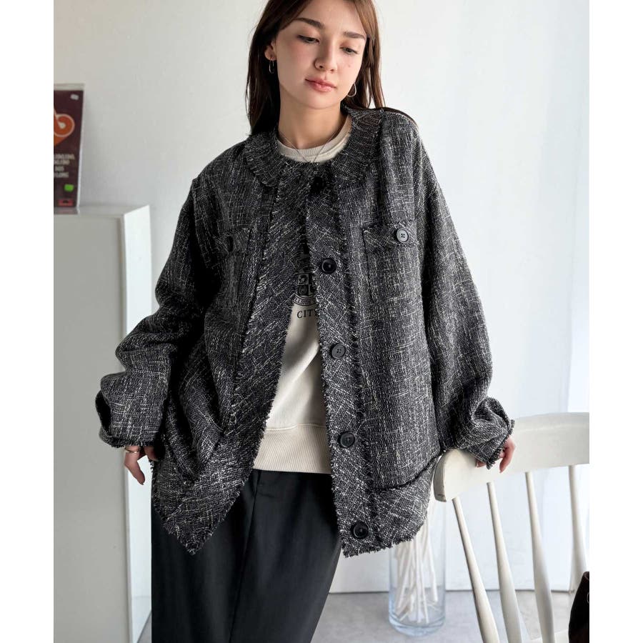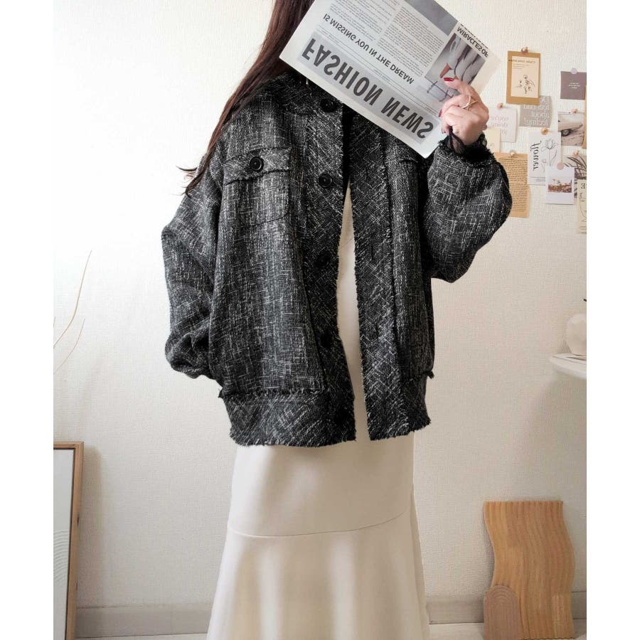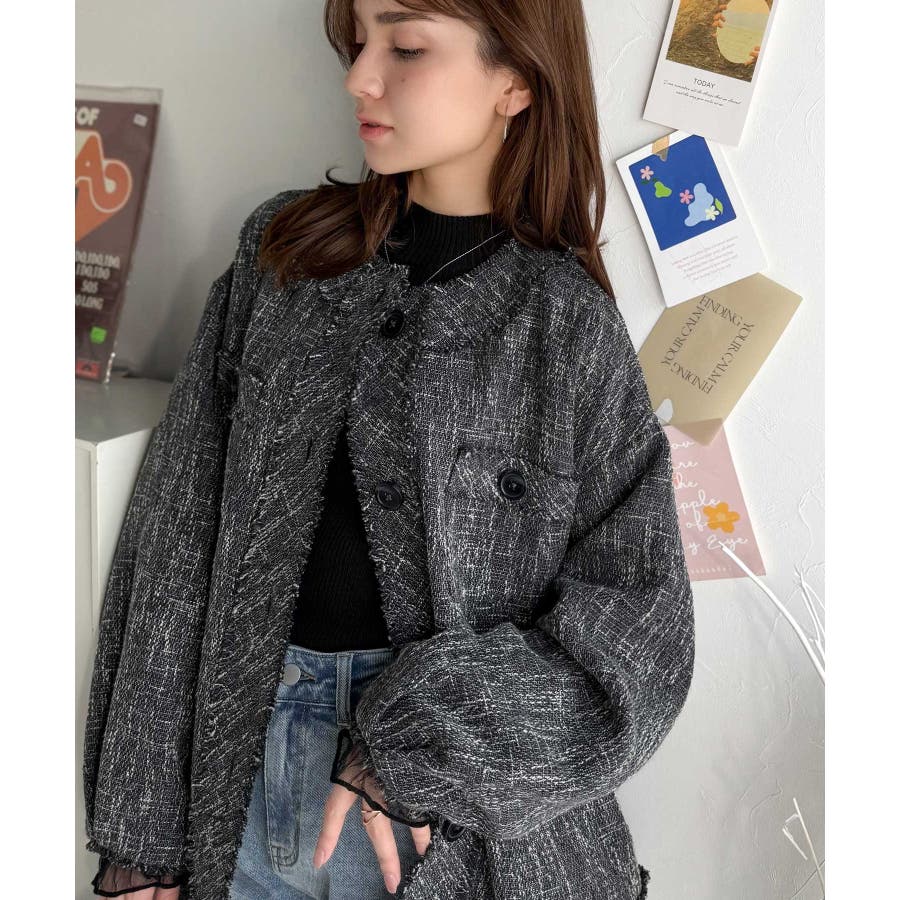 ふんわりとしたコクーンシルエットが女性らしい柔らかさを引き立てるツイードジャケット。