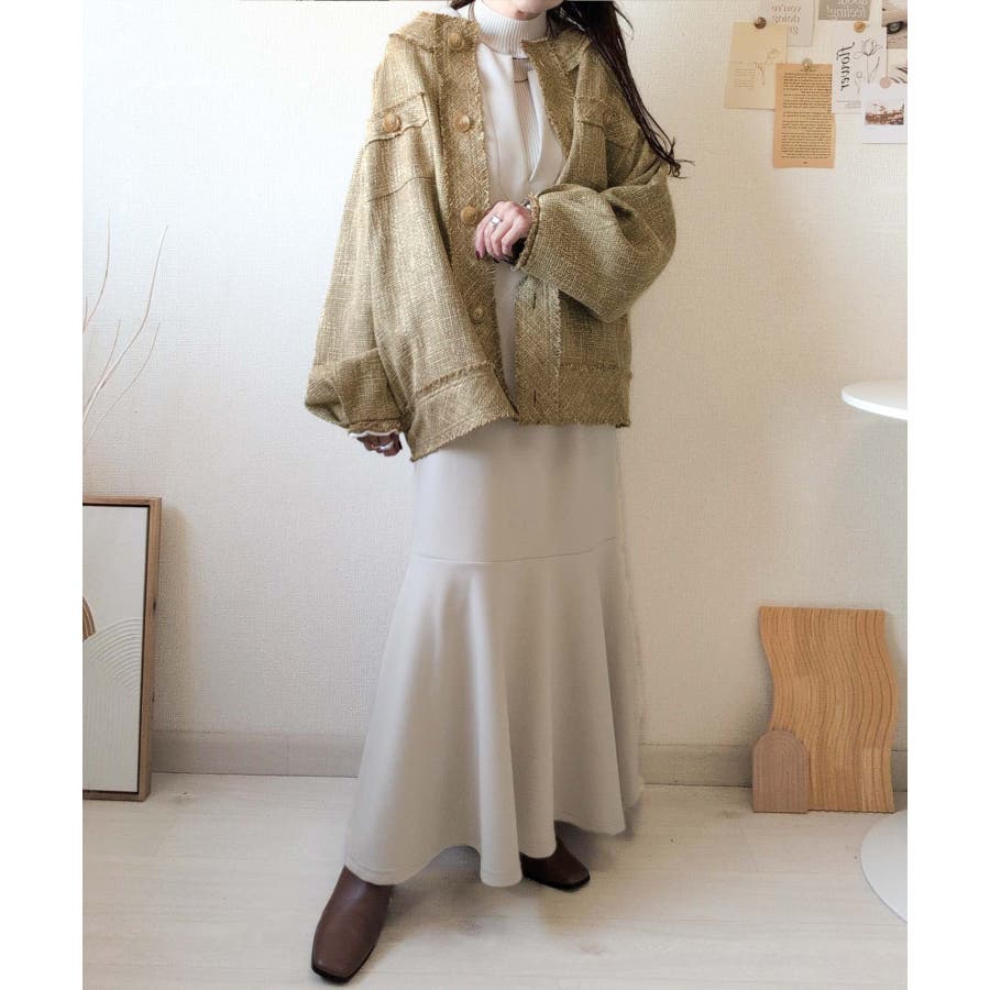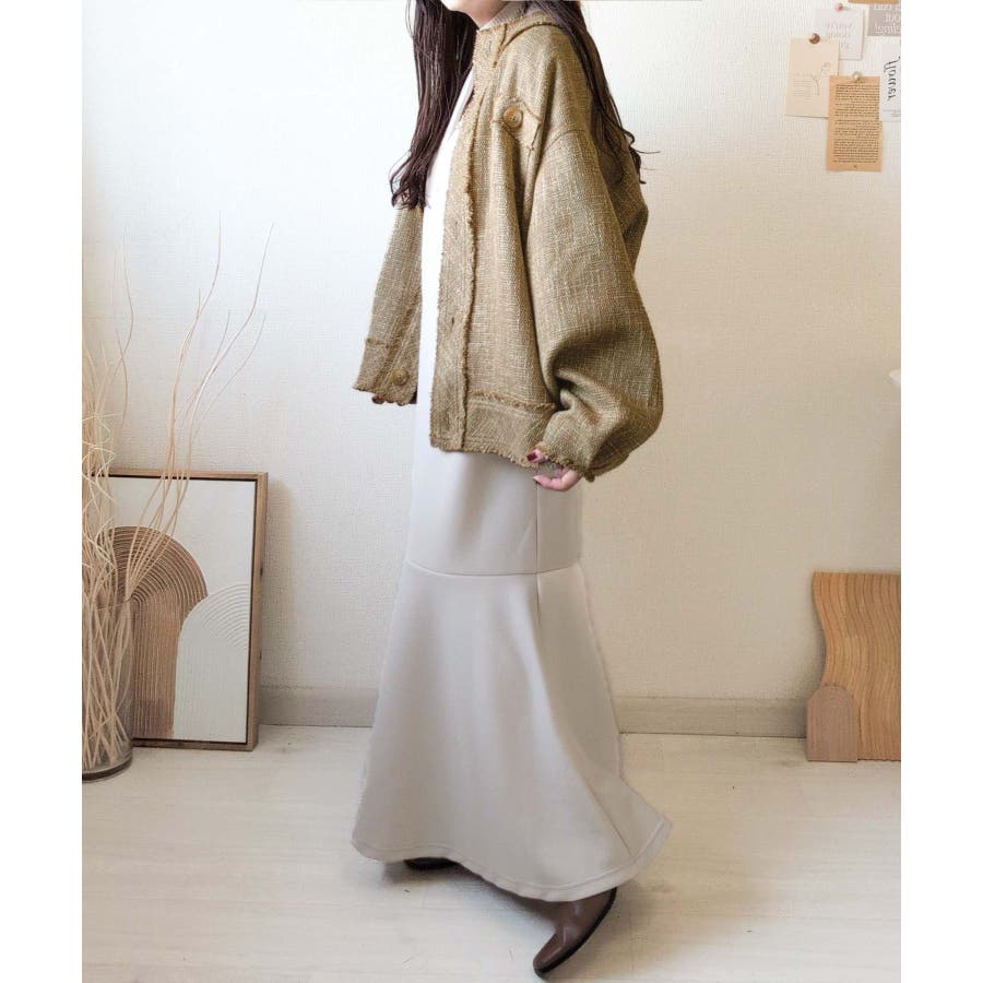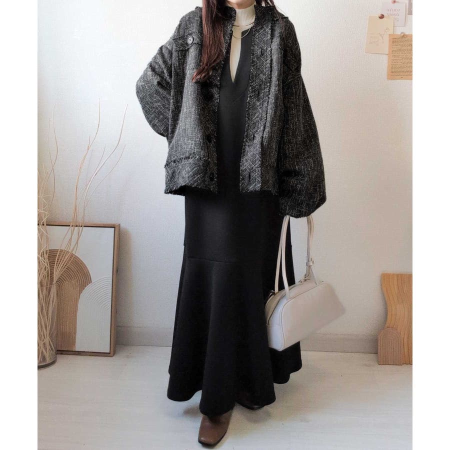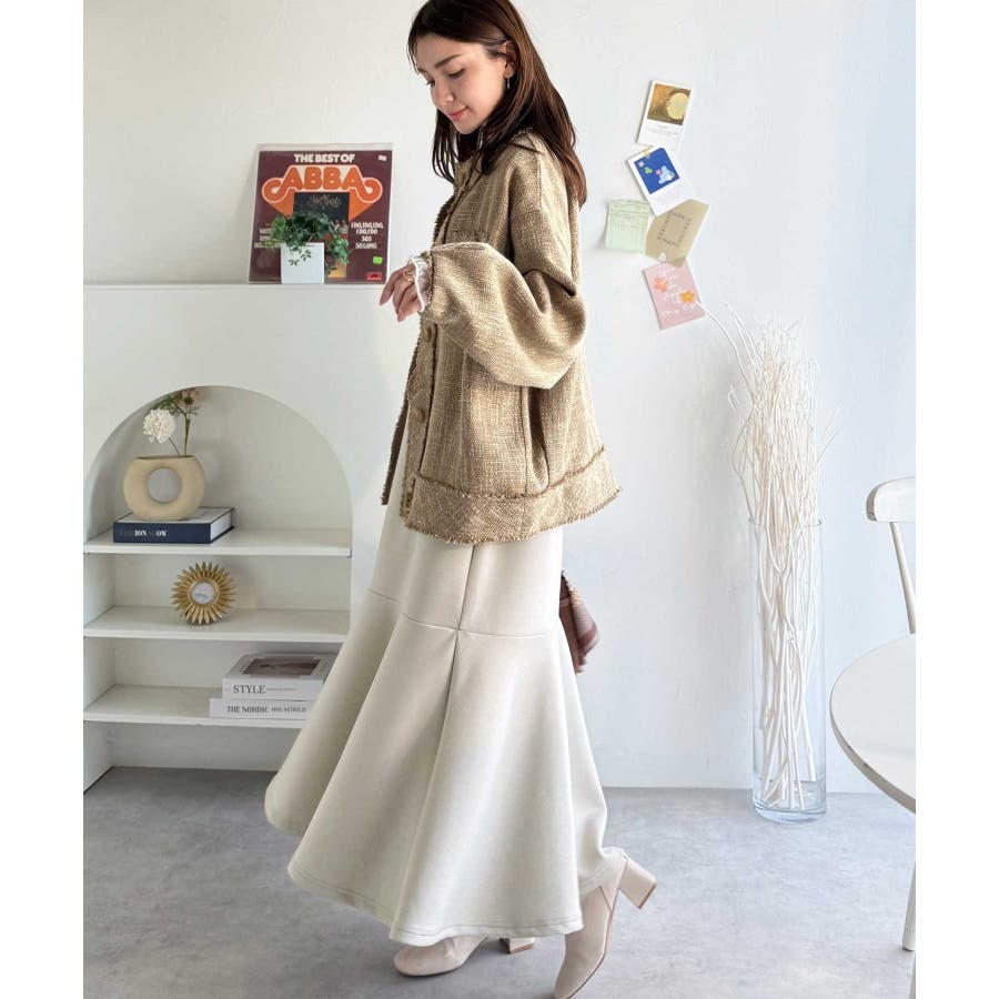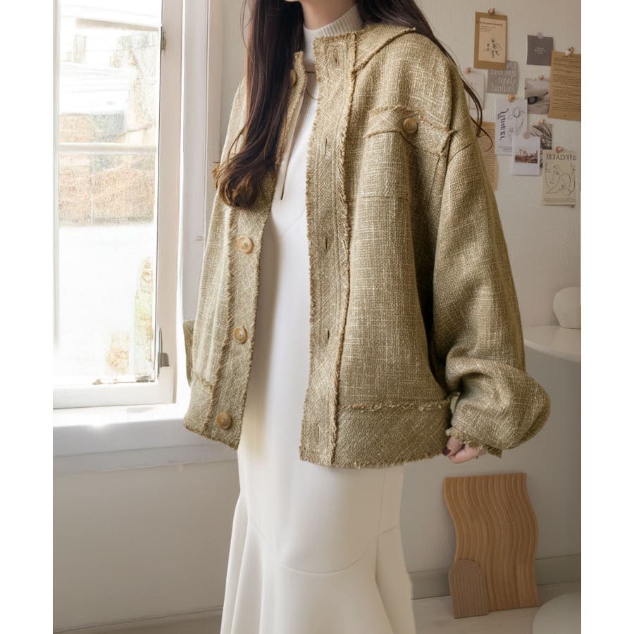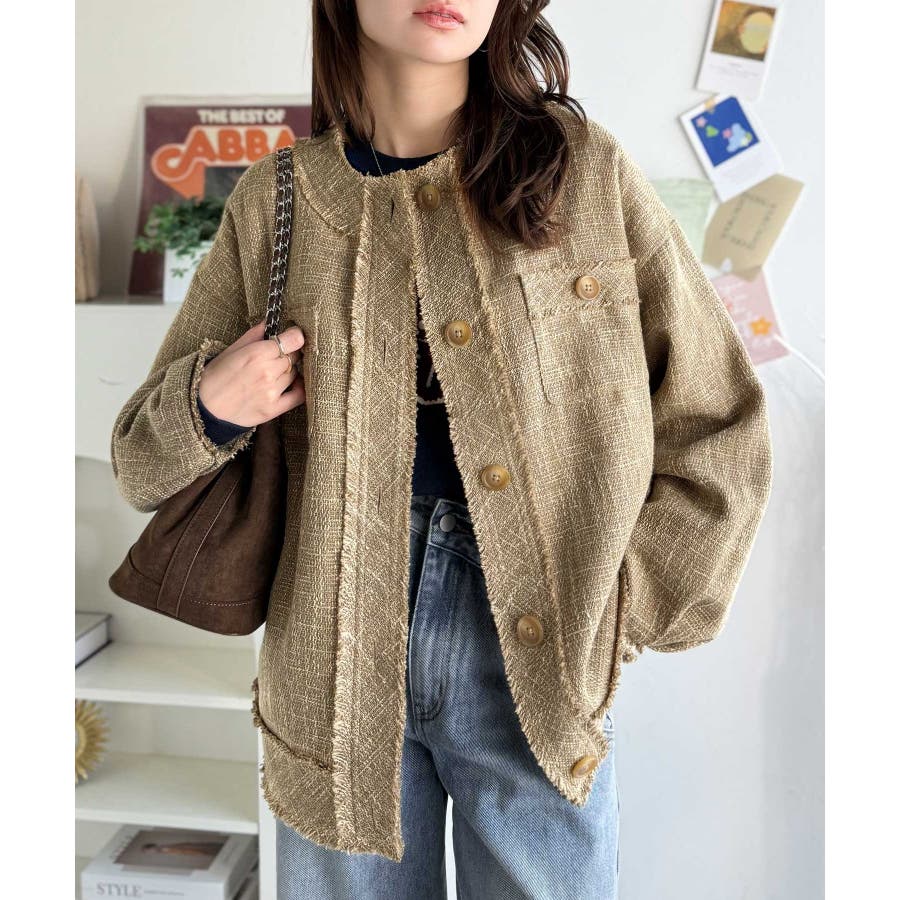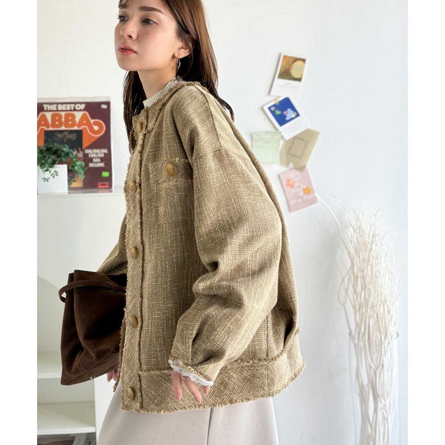 ふんわりとしたコクーンシルエットが女性らしい柔らかさを引き立てるツイードジャケット。