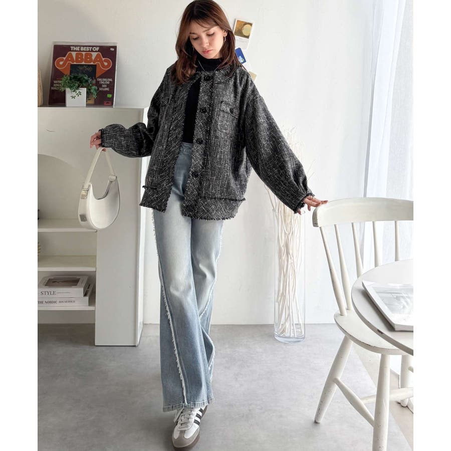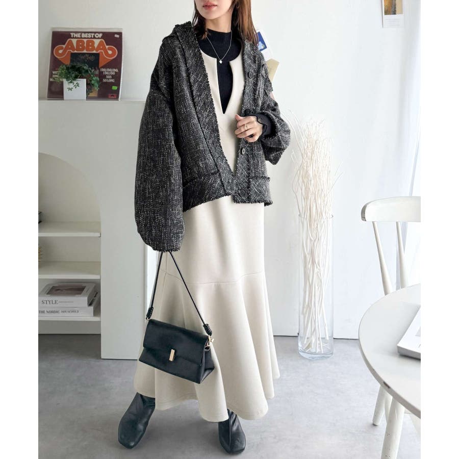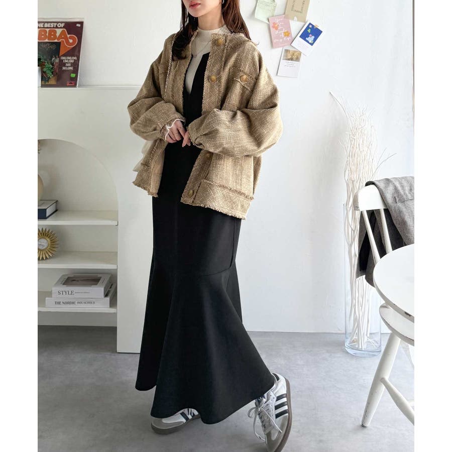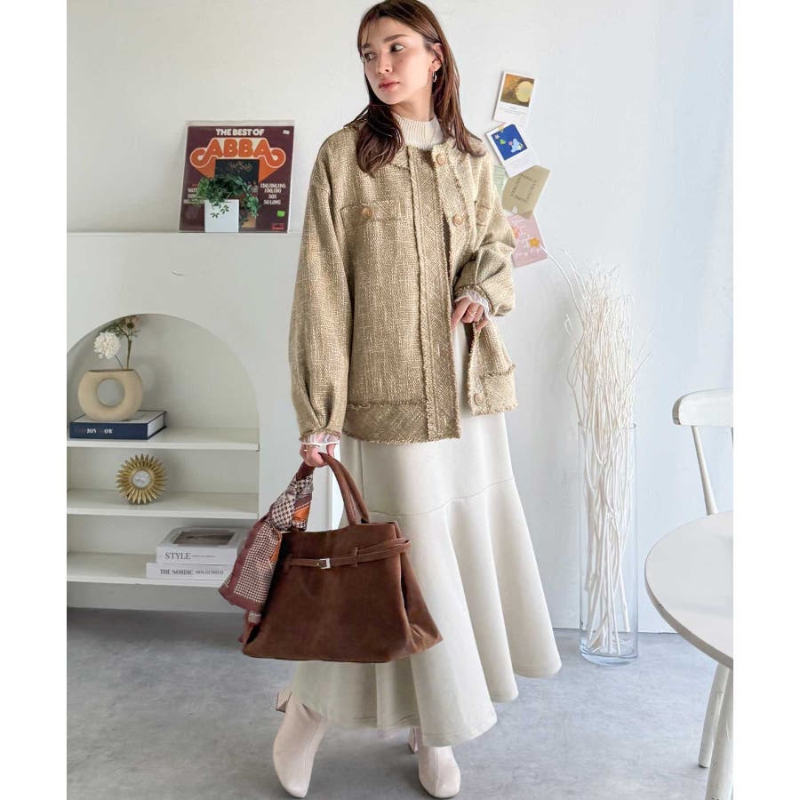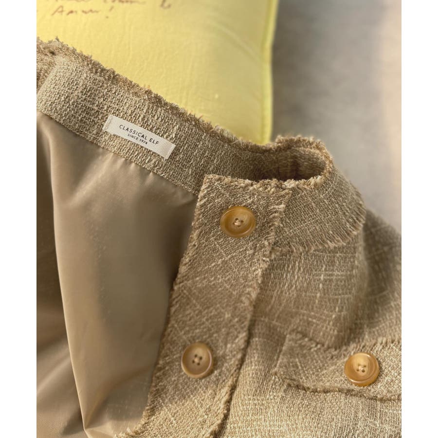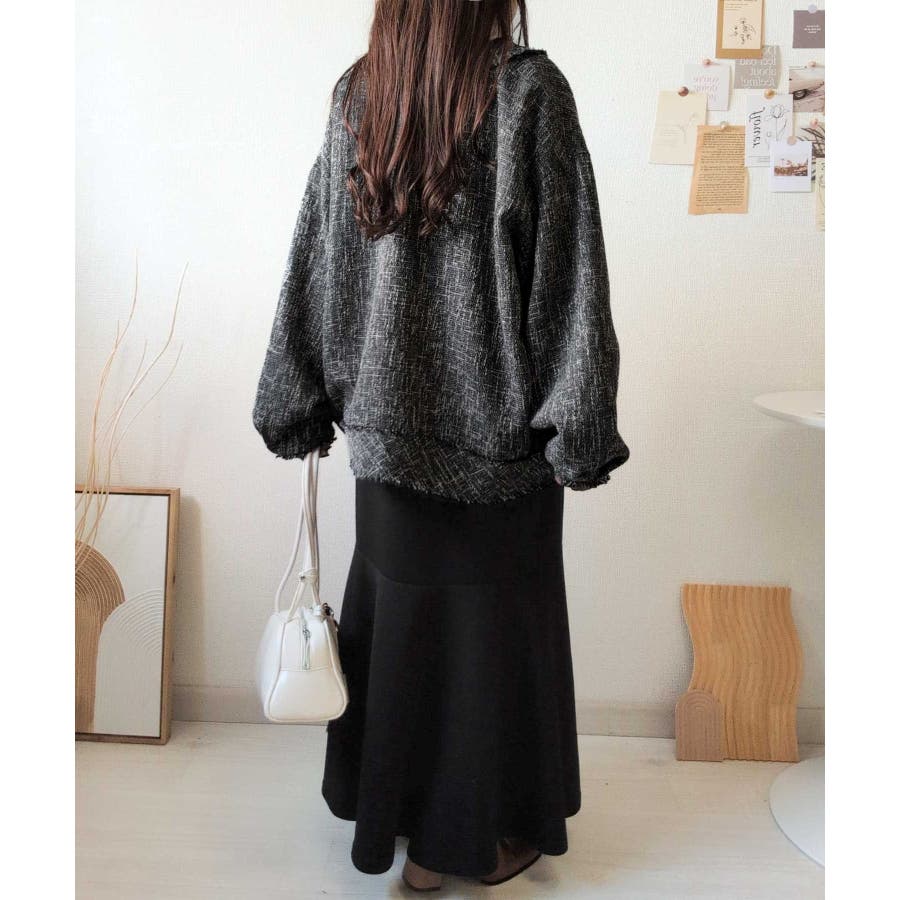 ふんわりとしたコクーンシルエットが女性らしい柔らかさを引き立てるツイードジャケット。