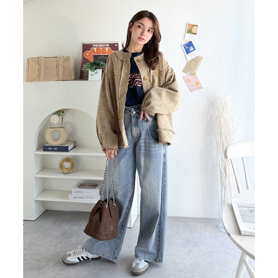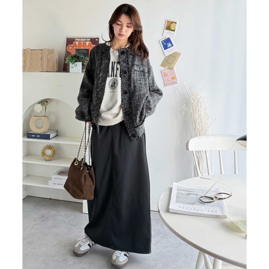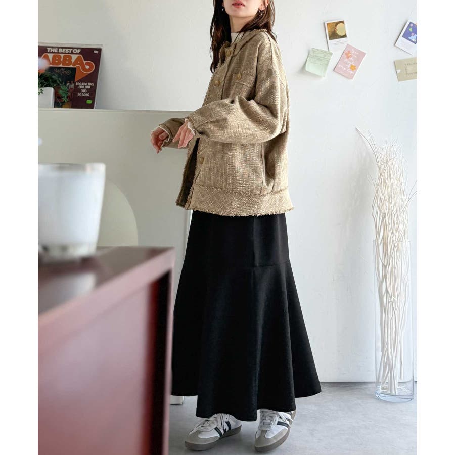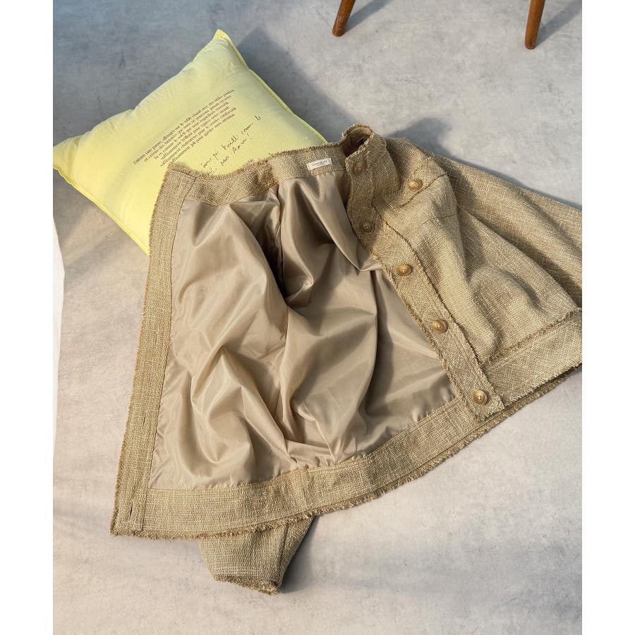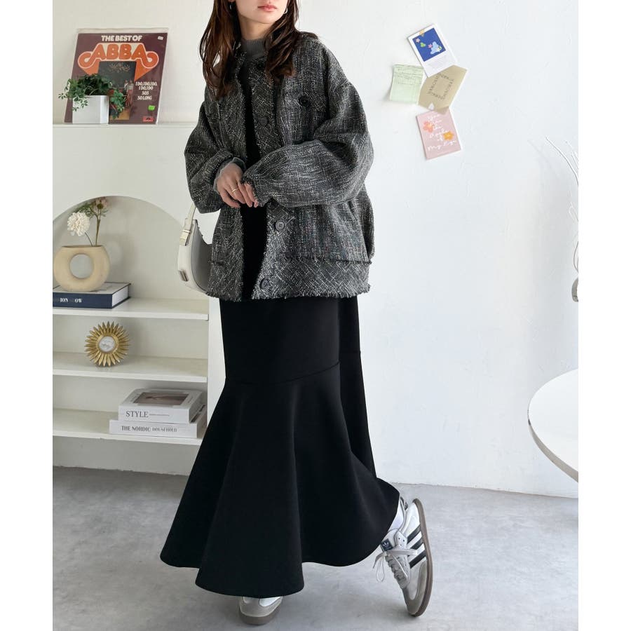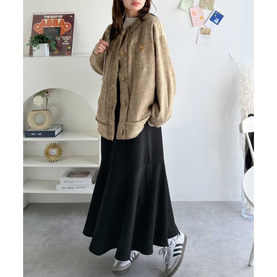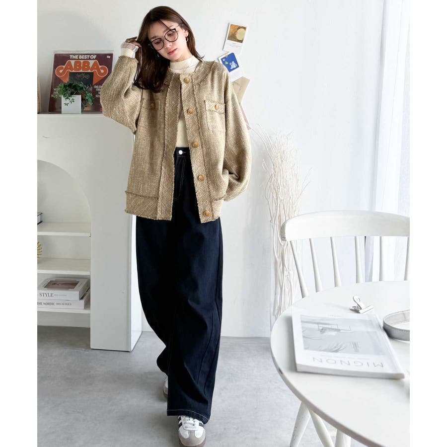 ふんわりとしたコクーンシルエットが女性らしい柔らかさを引き立てるツイードジャケット。