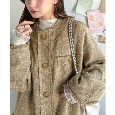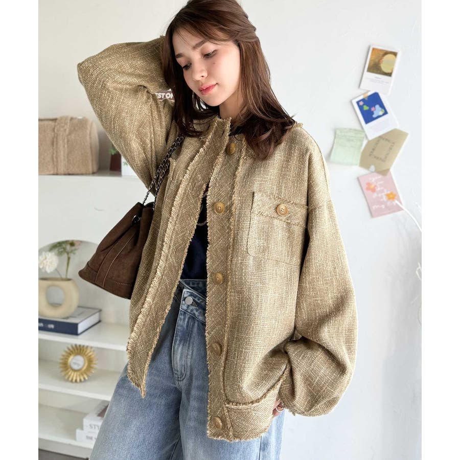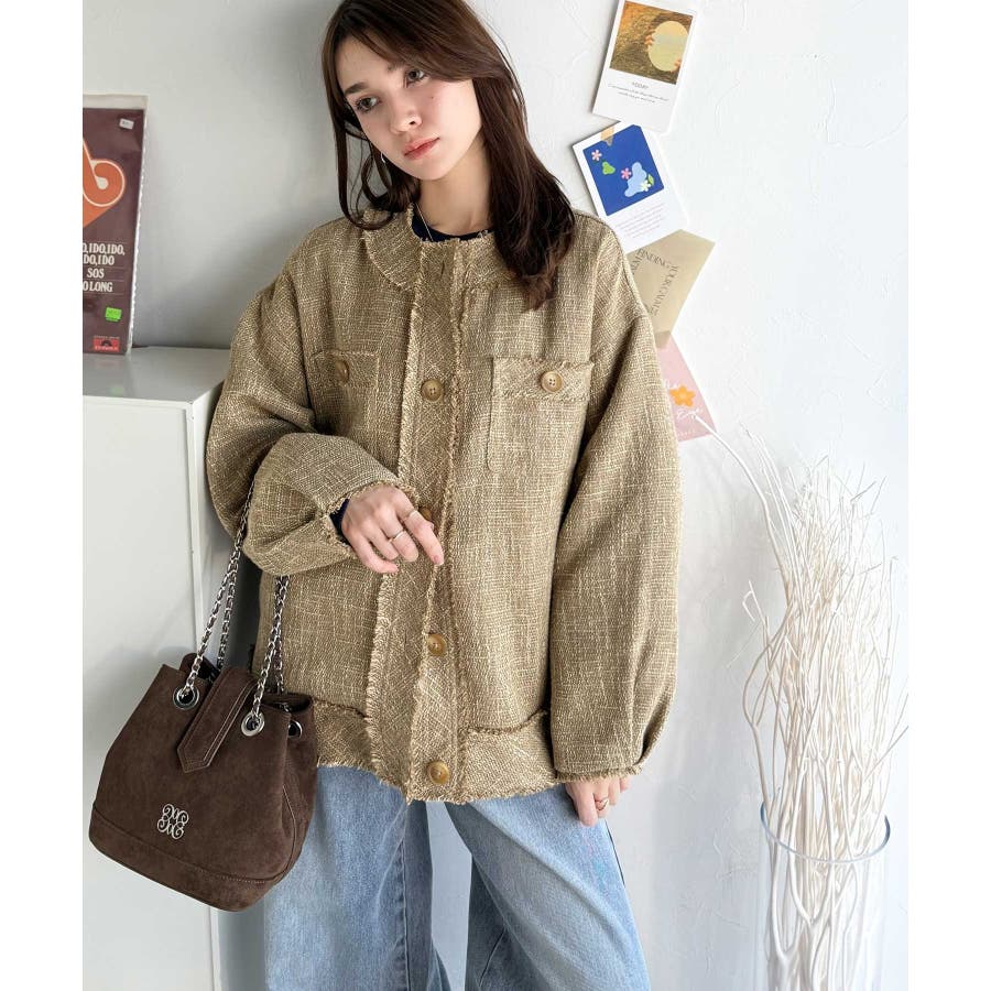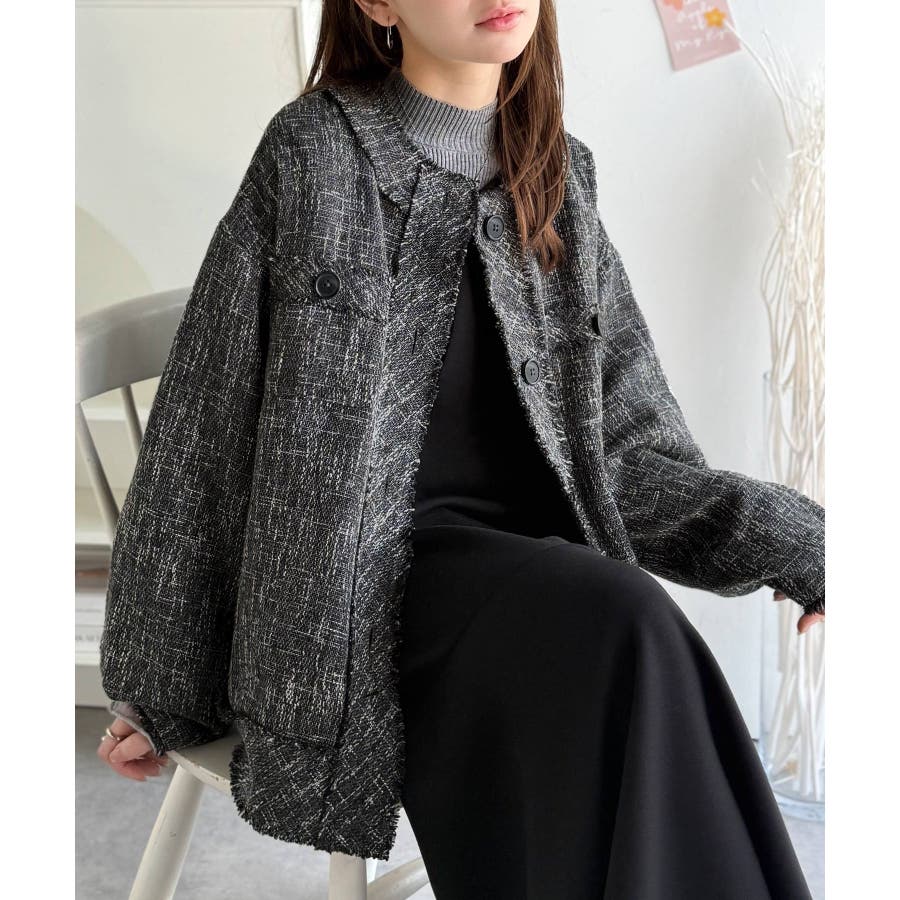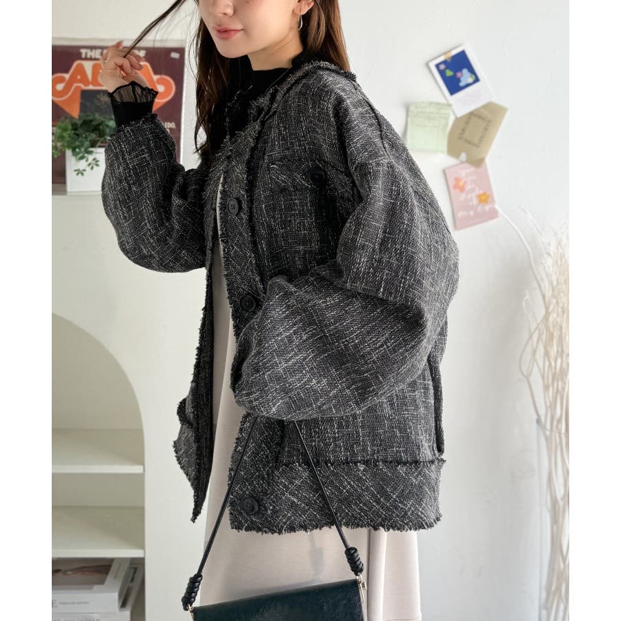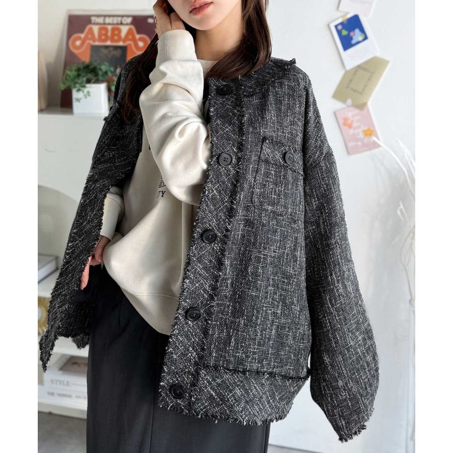 羽織るだけで華やかな存在感♪ポケットデザインコクーンツイードオーバーサイズジャケ…