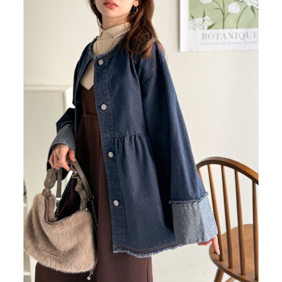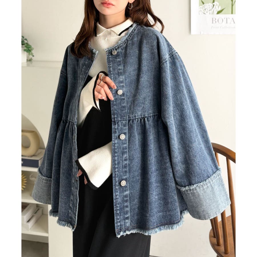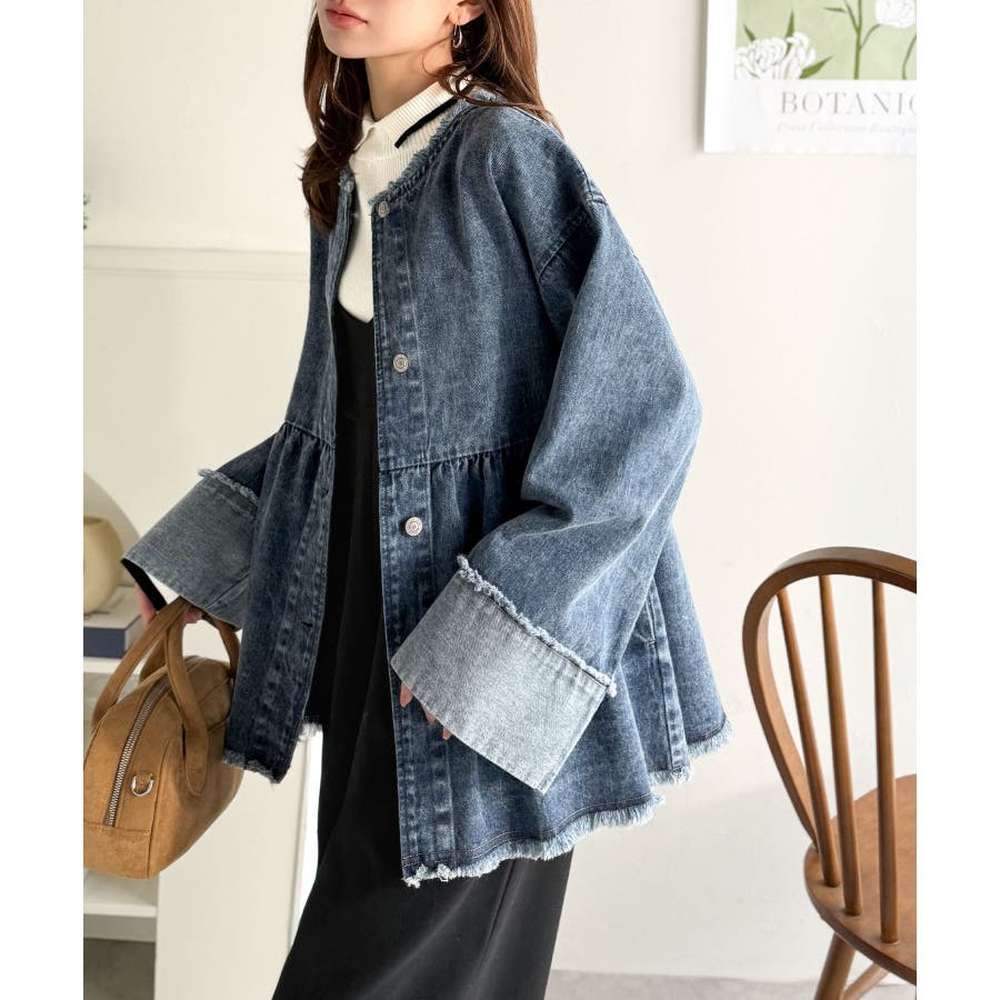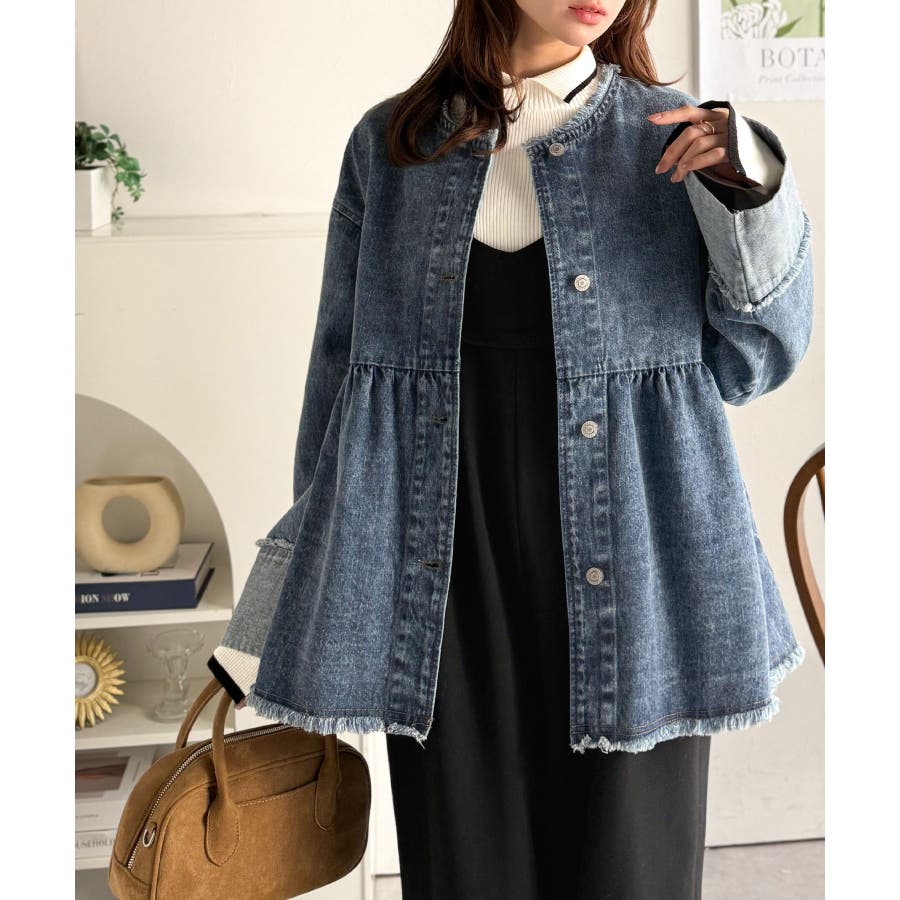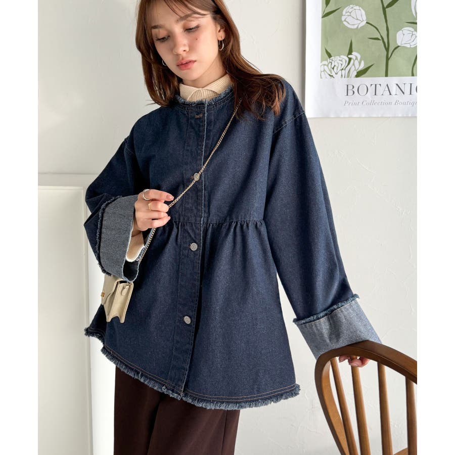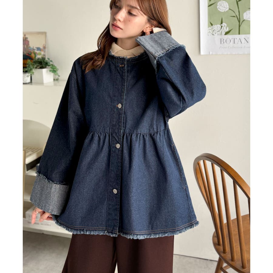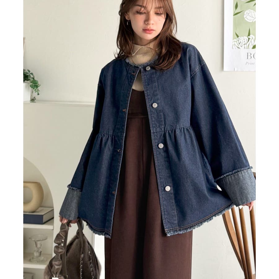 フリンジ×デニムの最強コンビ!綿100%ペプラムノーカラーデニムジャケット