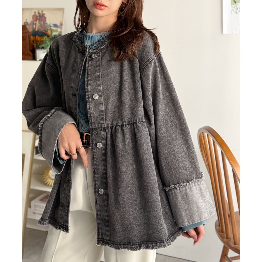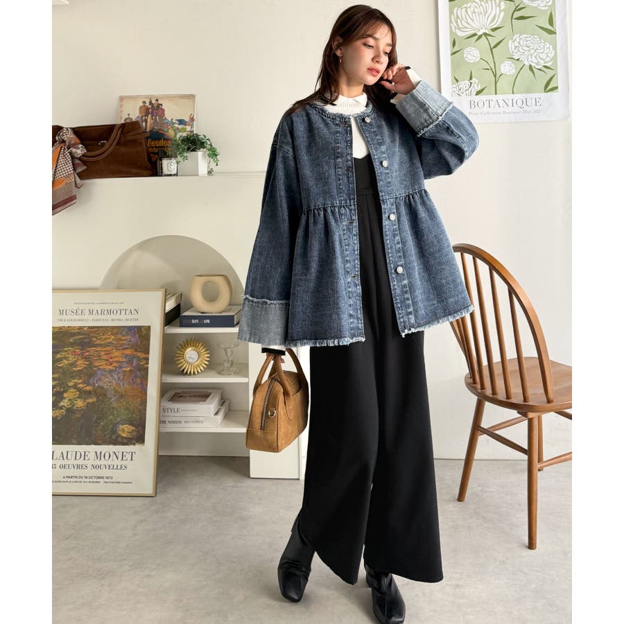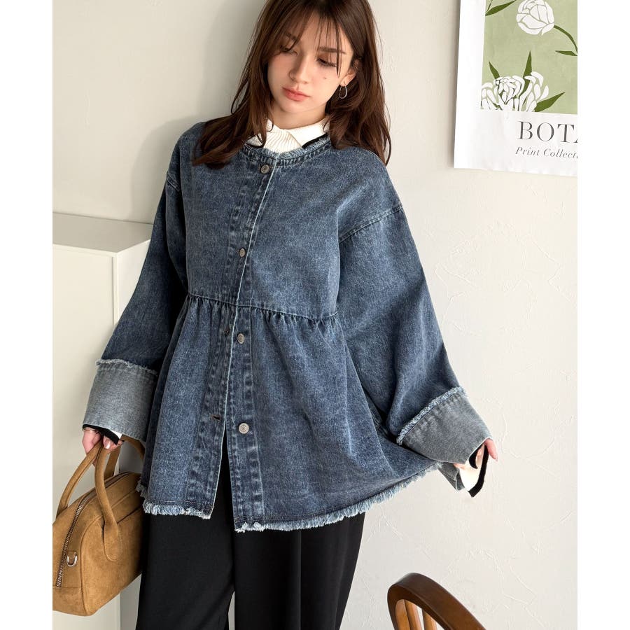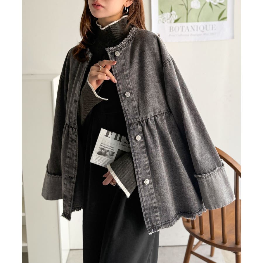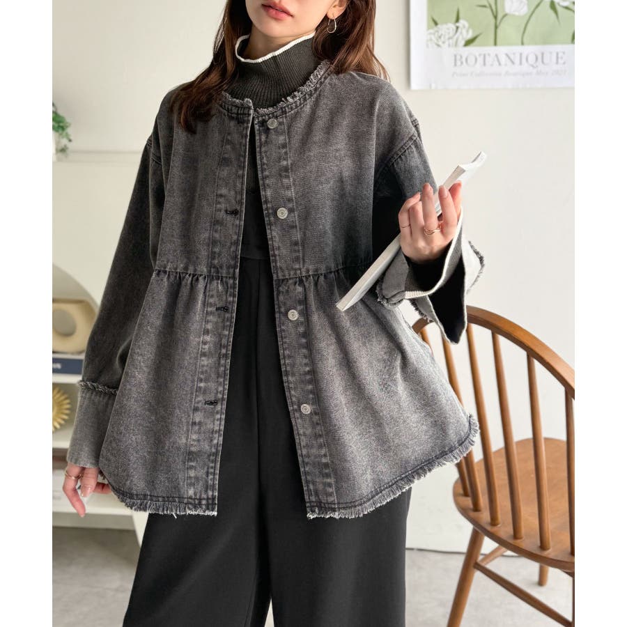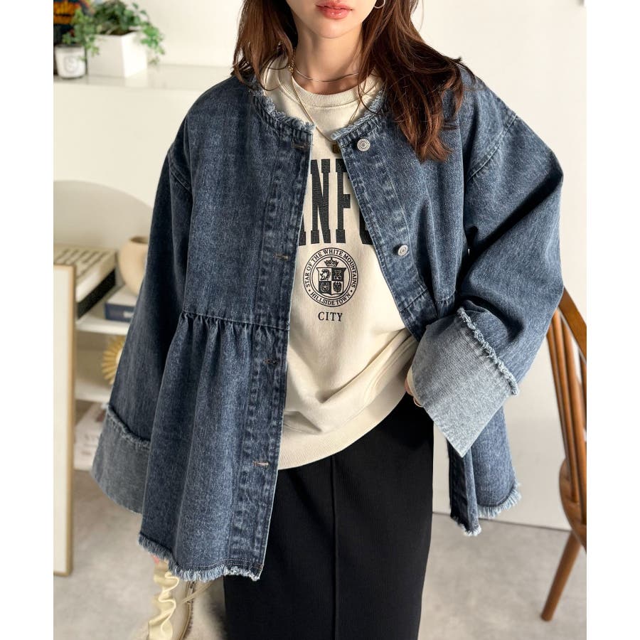 フリンジ×デニムの最強コンビ!綿100%ペプラムノーカラーデニムジャケット