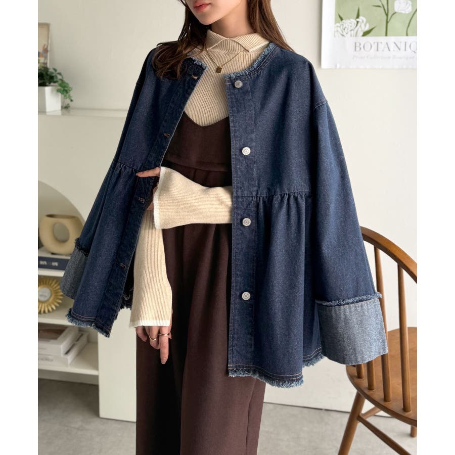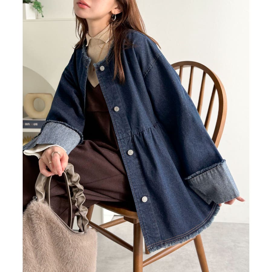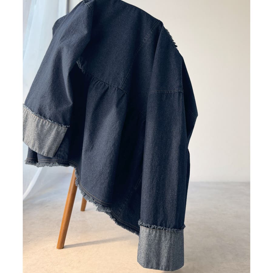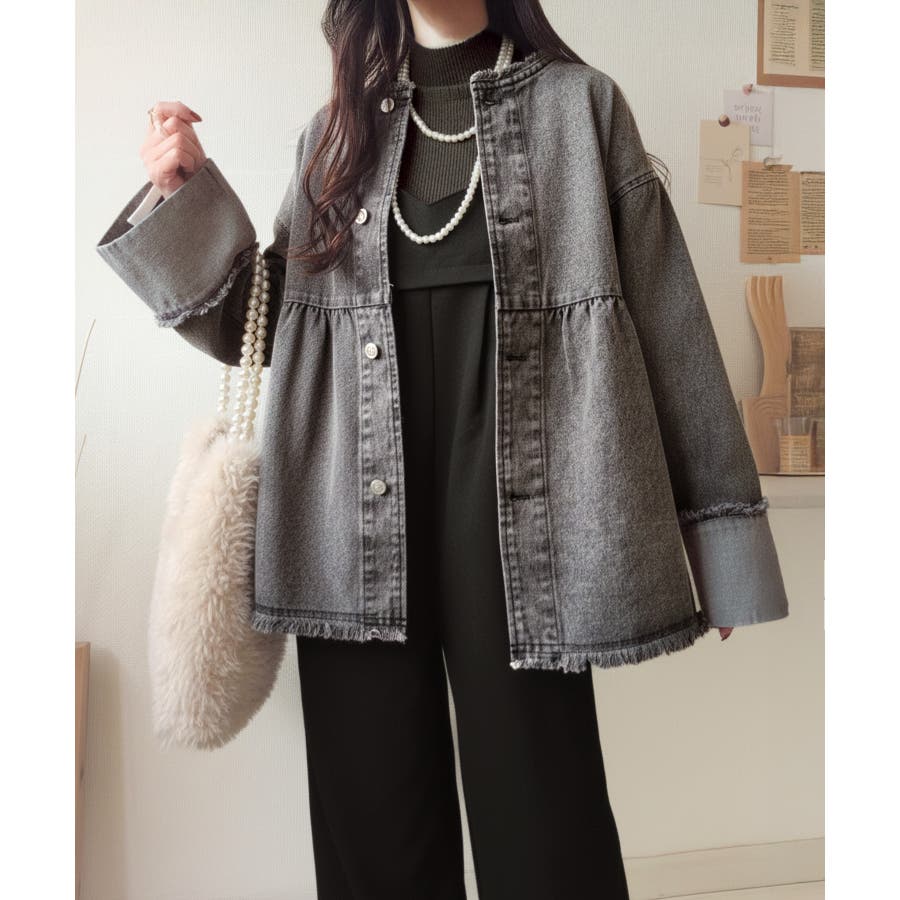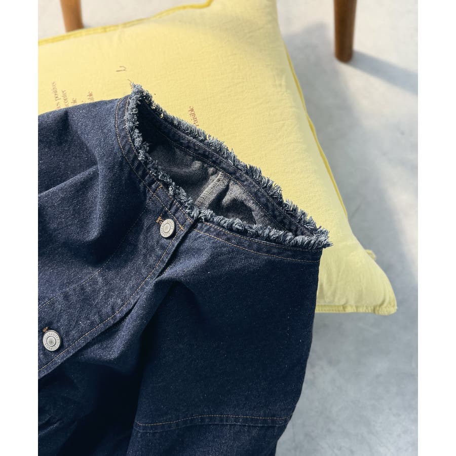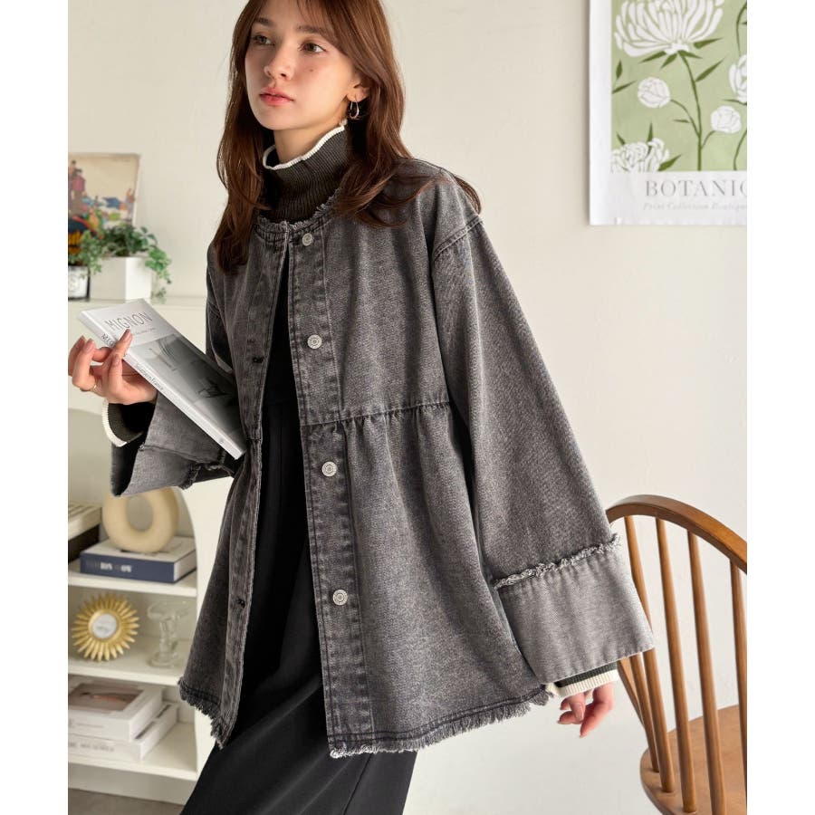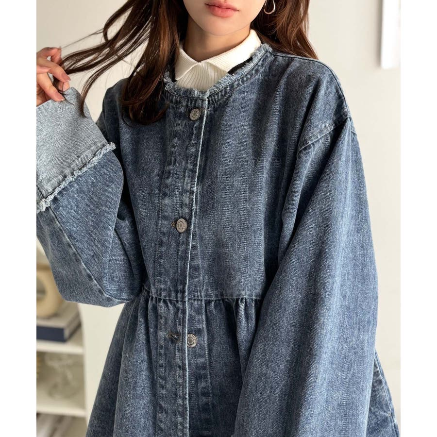 フリンジ×デニムの最強コンビ!綿100%ペプラムノーカラーデニムジャケット
