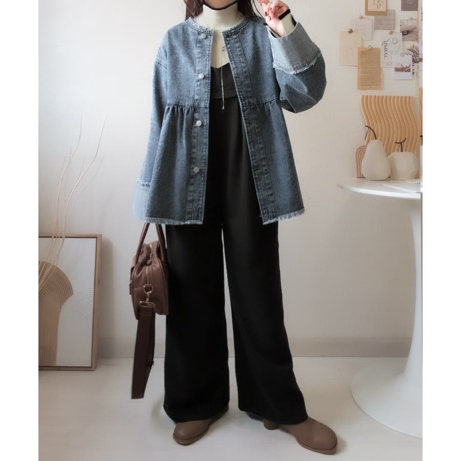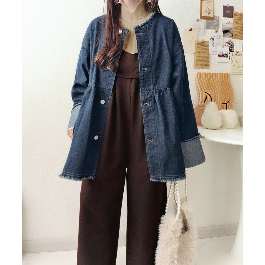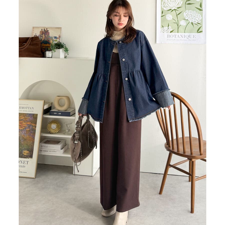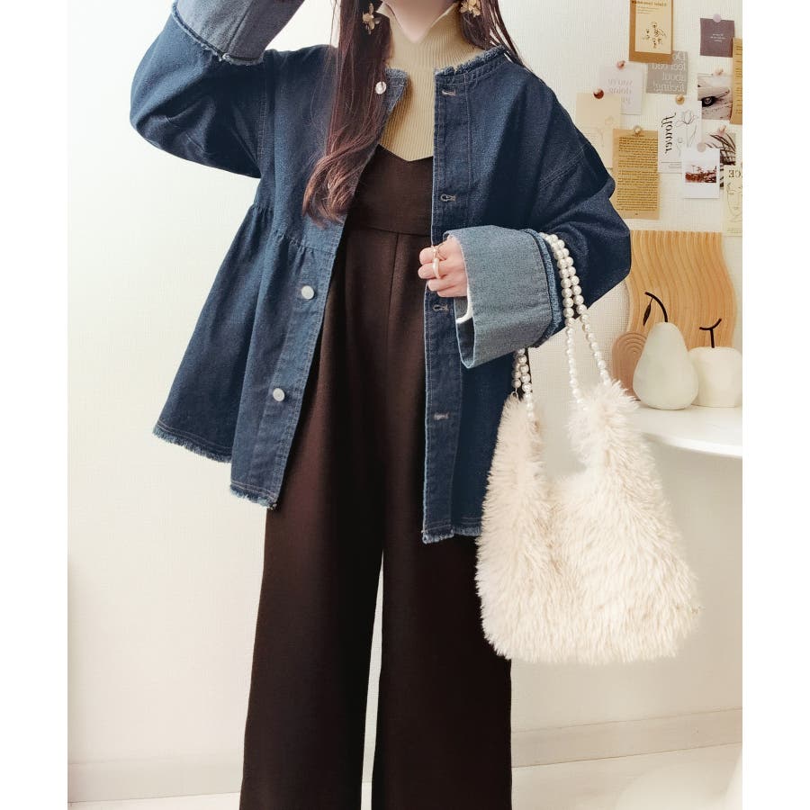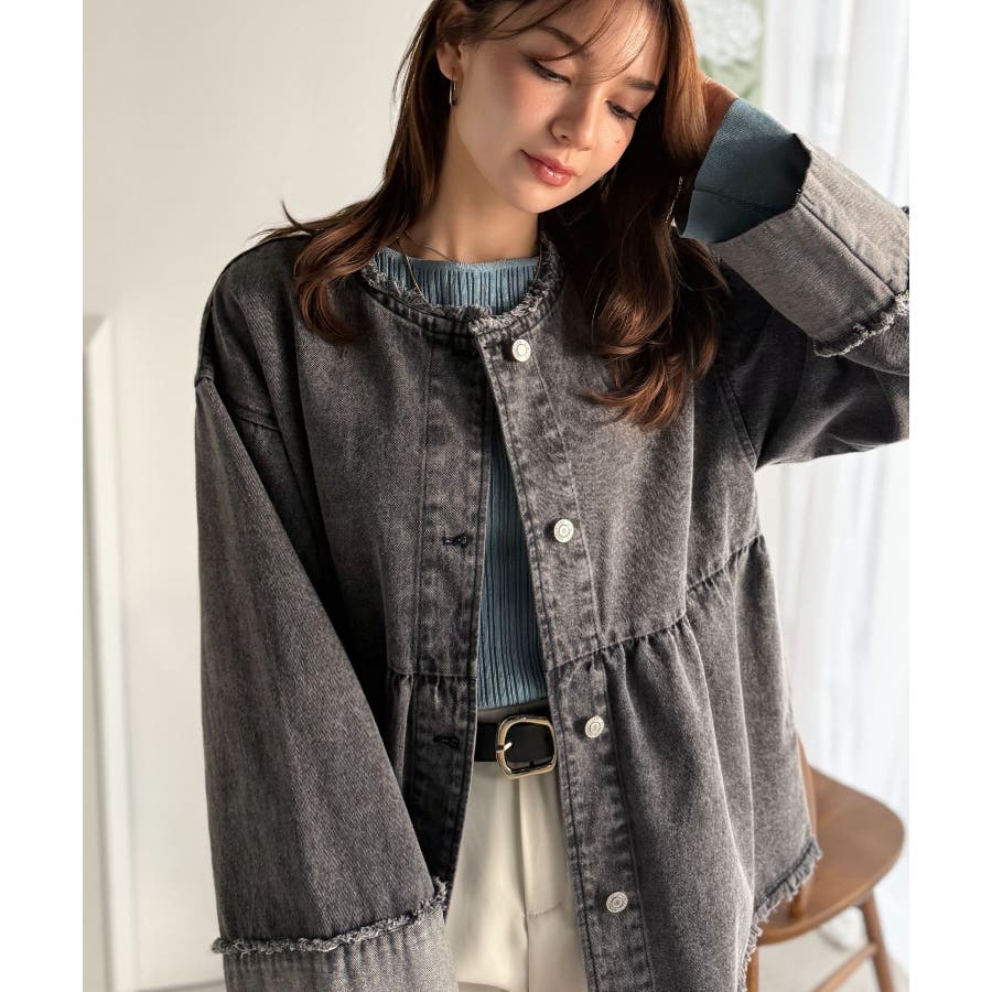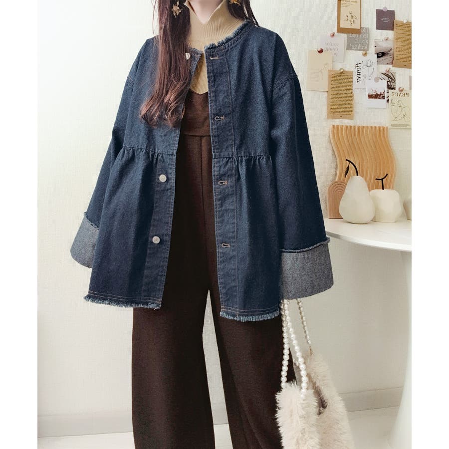 フリンジ×デニムの最強コンビ!綿100%ペプラムノーカラーデニムジャケット