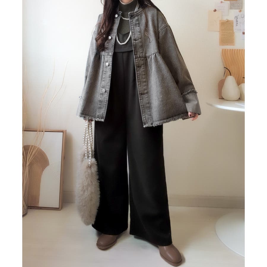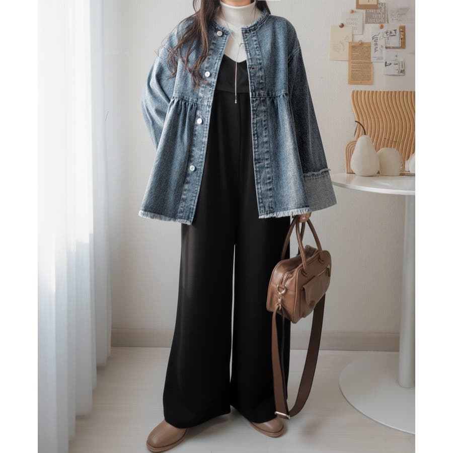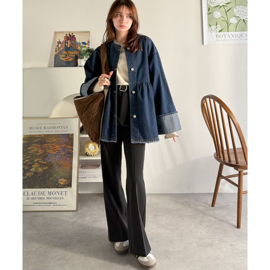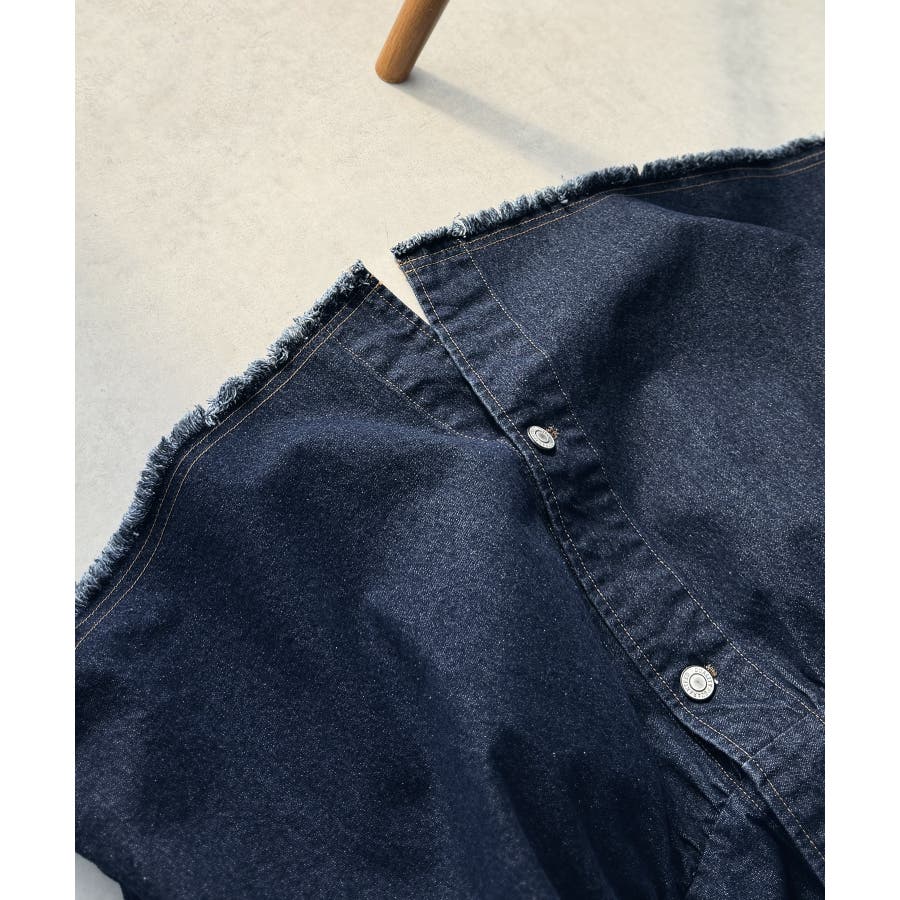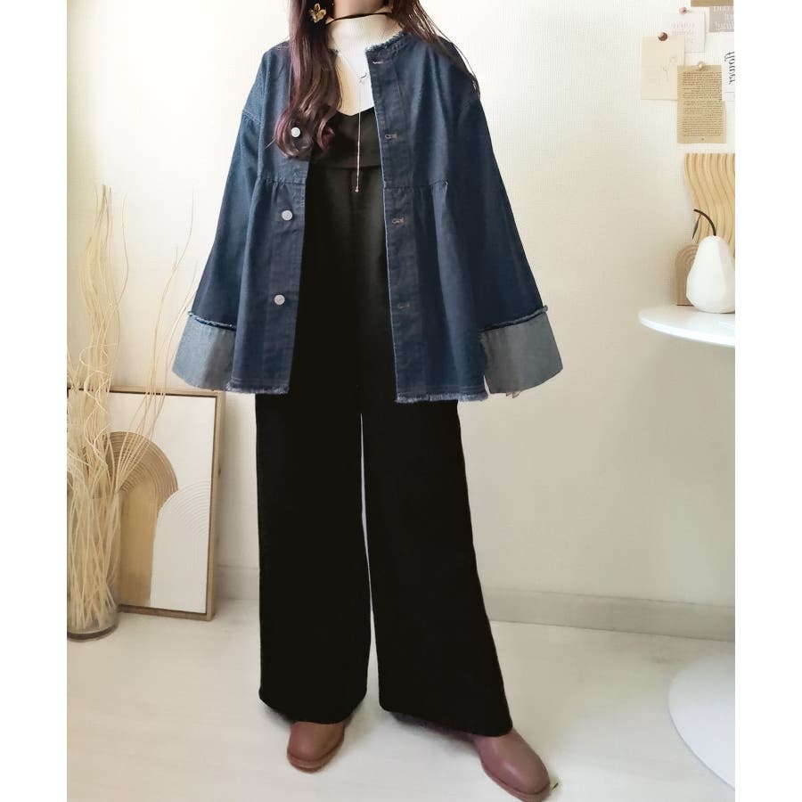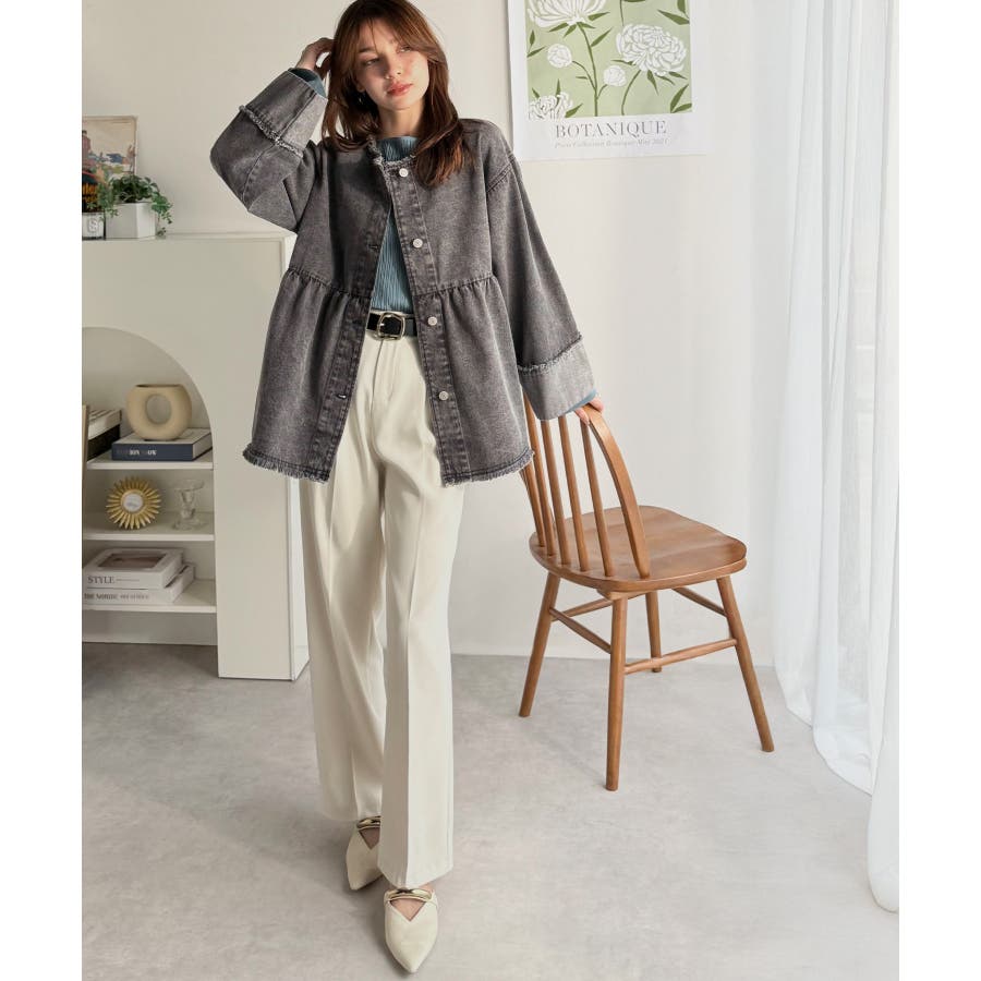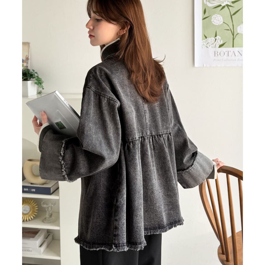 フリンジ×デニムの最強コンビ!綿100%ペプラムノーカラーデニムジャケット