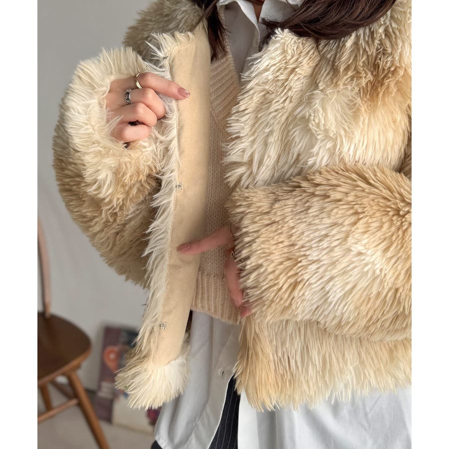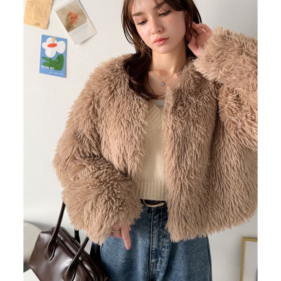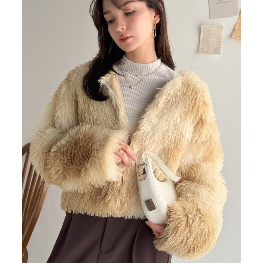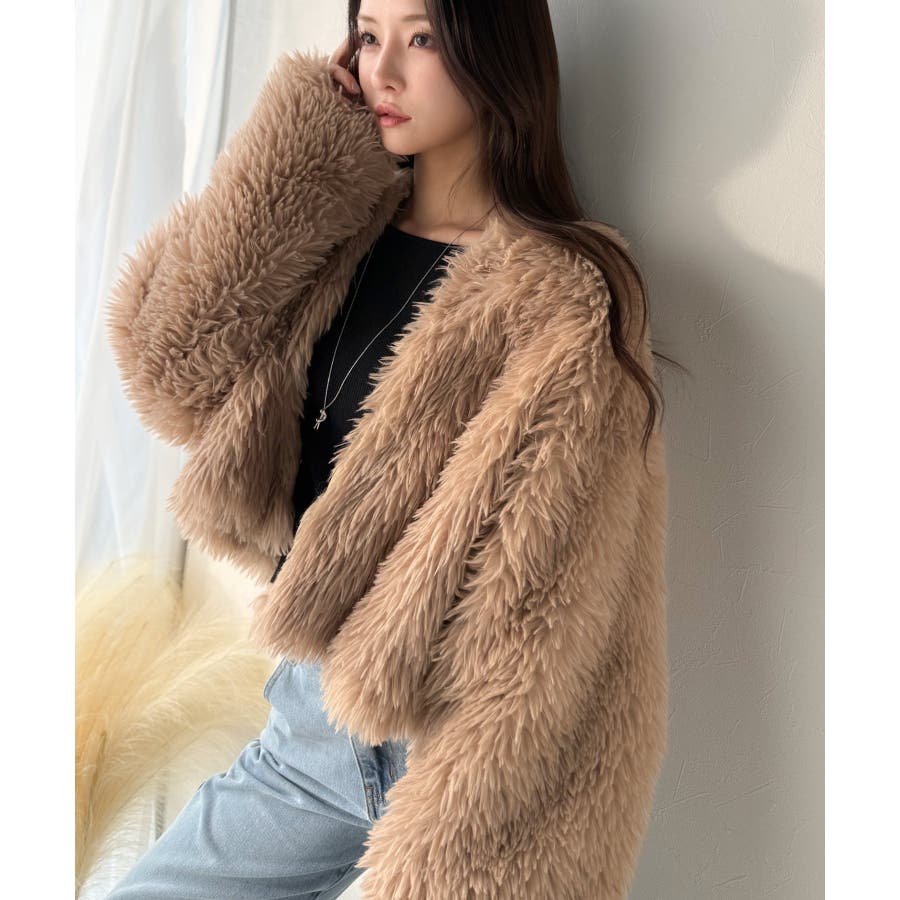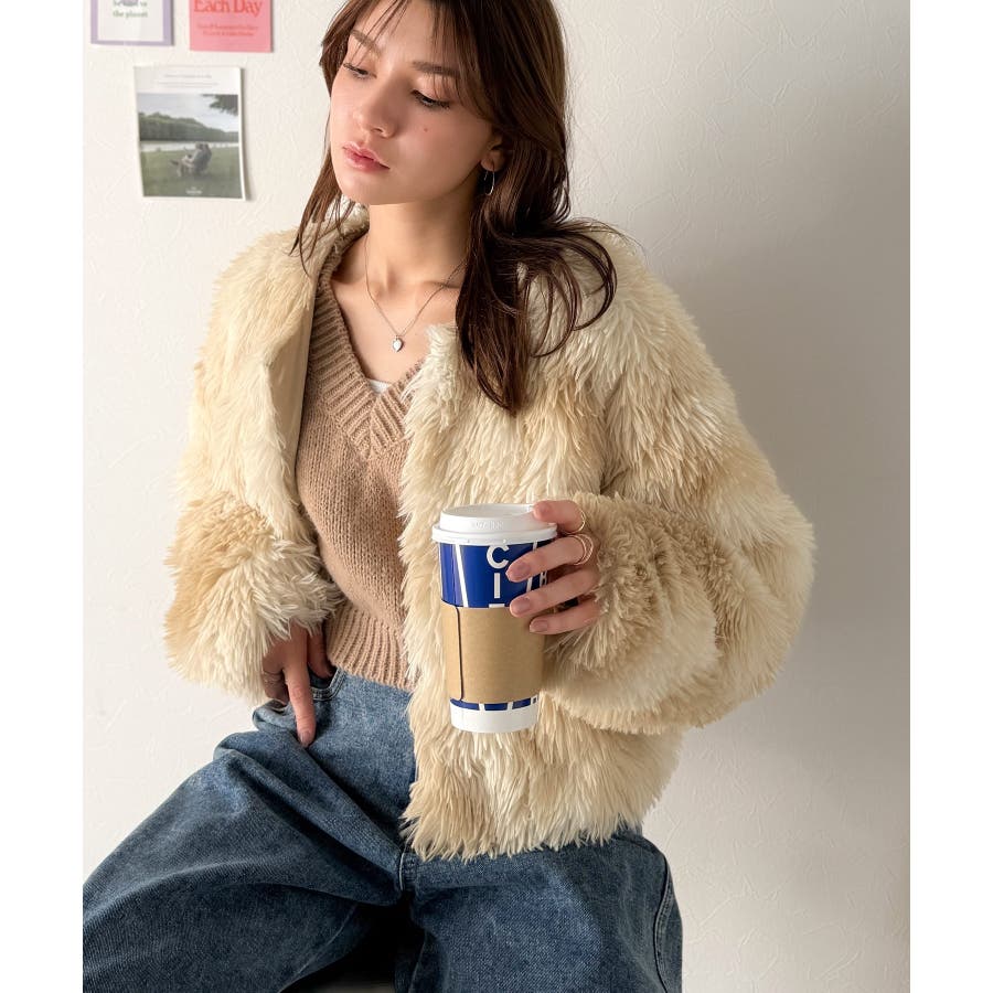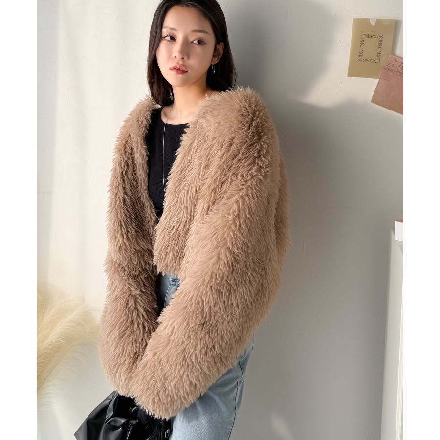 ブランディングされたAYAコラボのノーカラーショートファーコート。