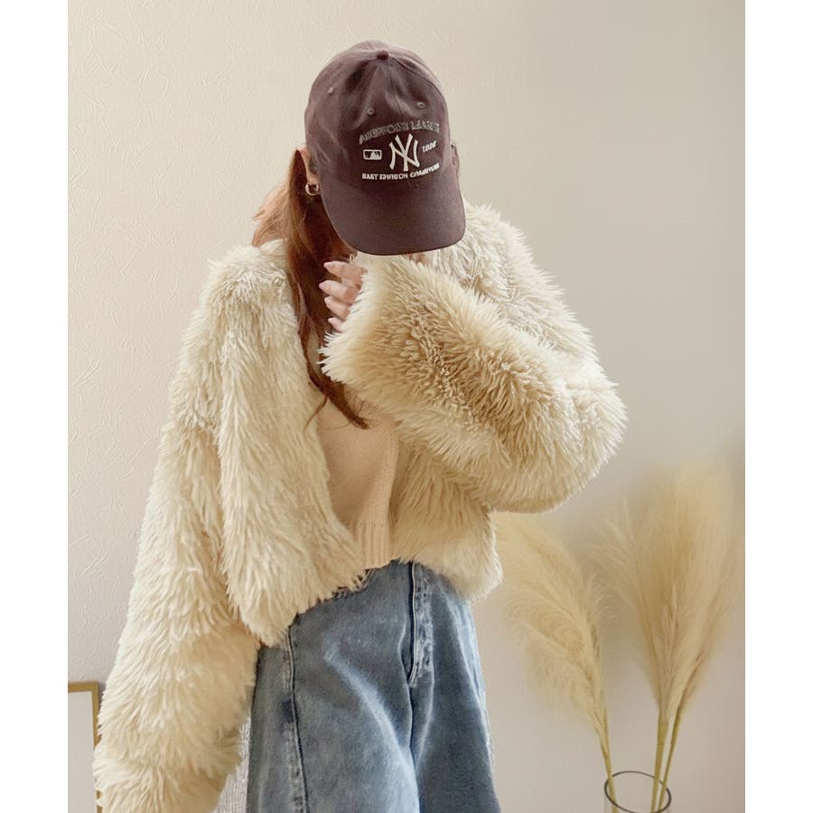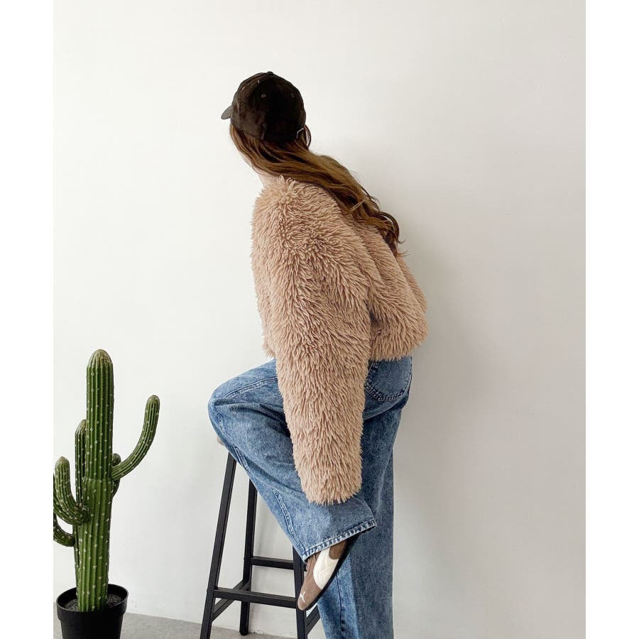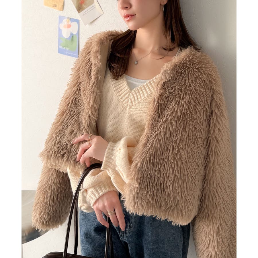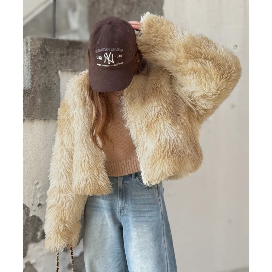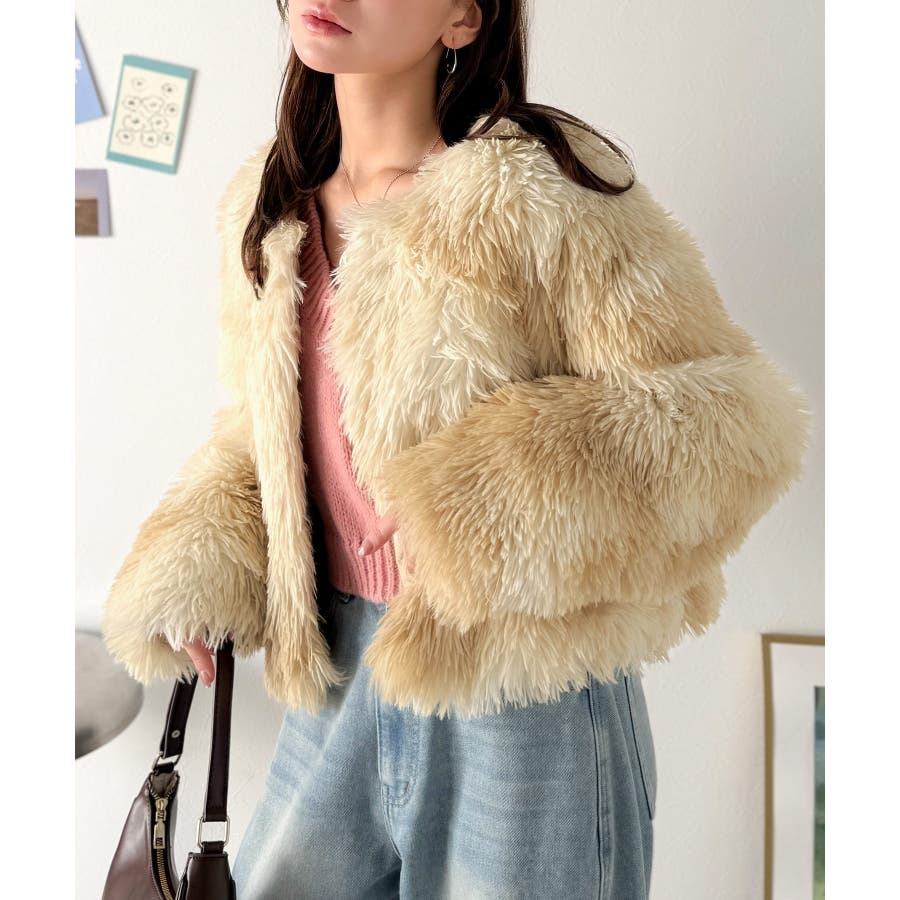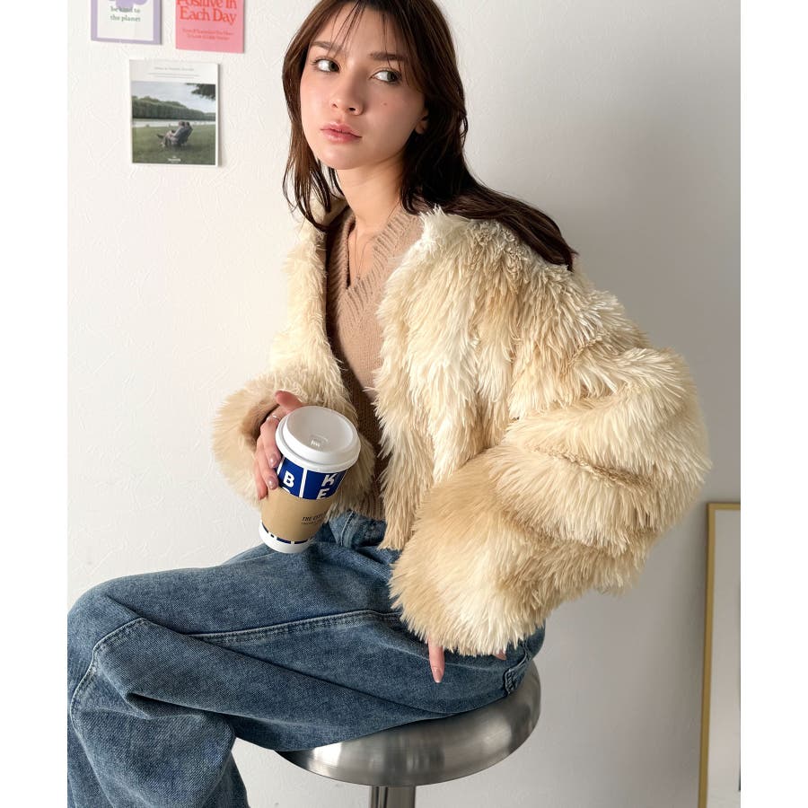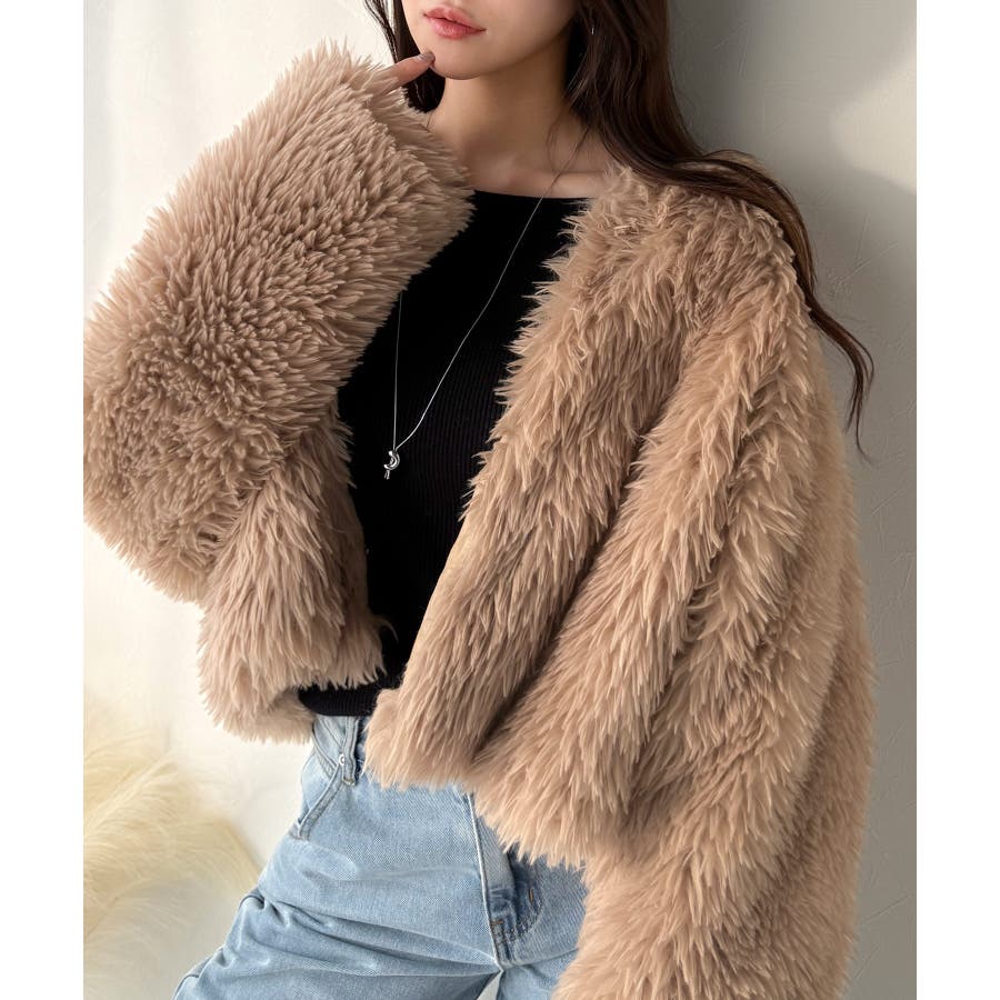 ブランディングされたAYAコラボのノーカラーショートファーコート。