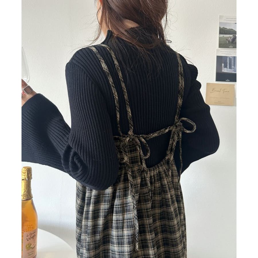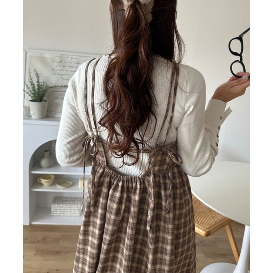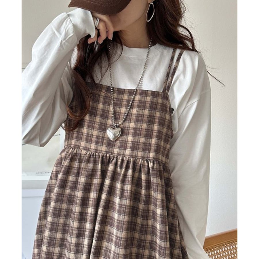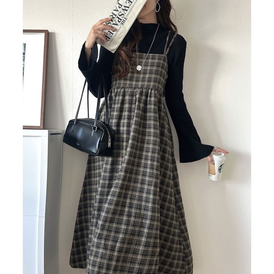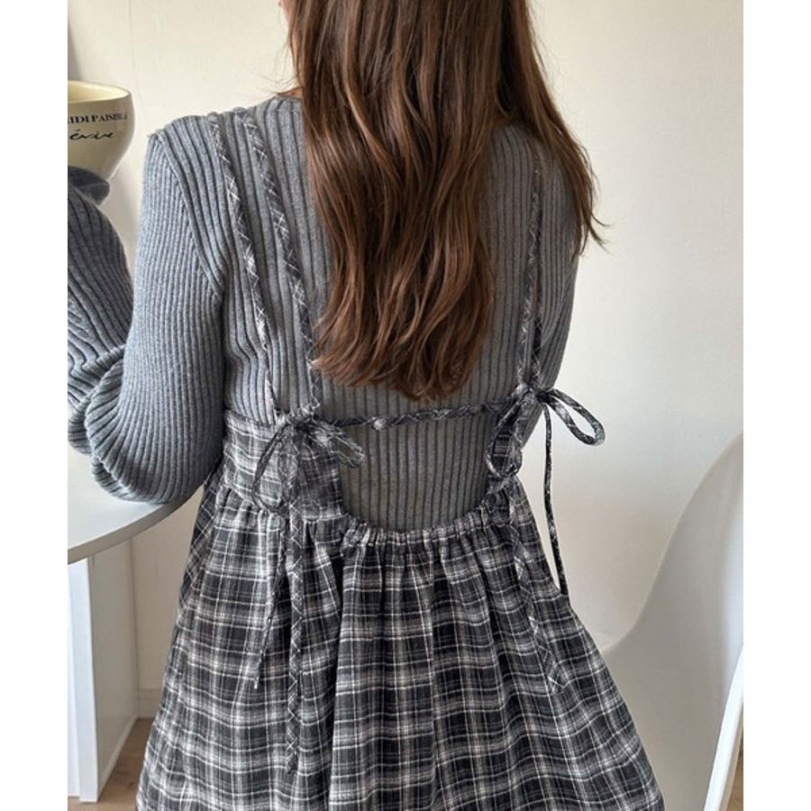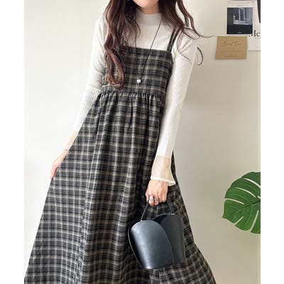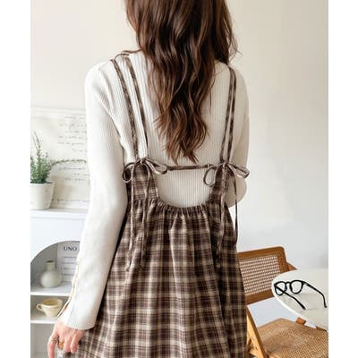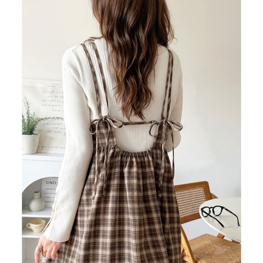 微起毛素材で秋冬にぴったり♪チェック柄ダブルストラップバックリボンキャミワンピ