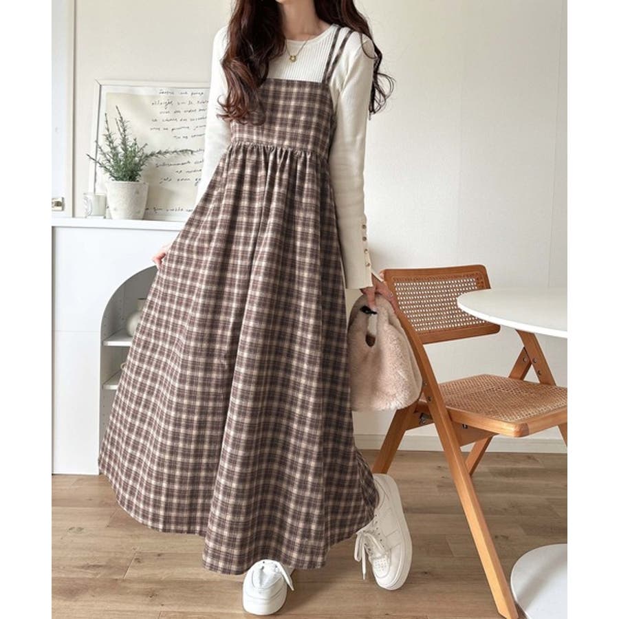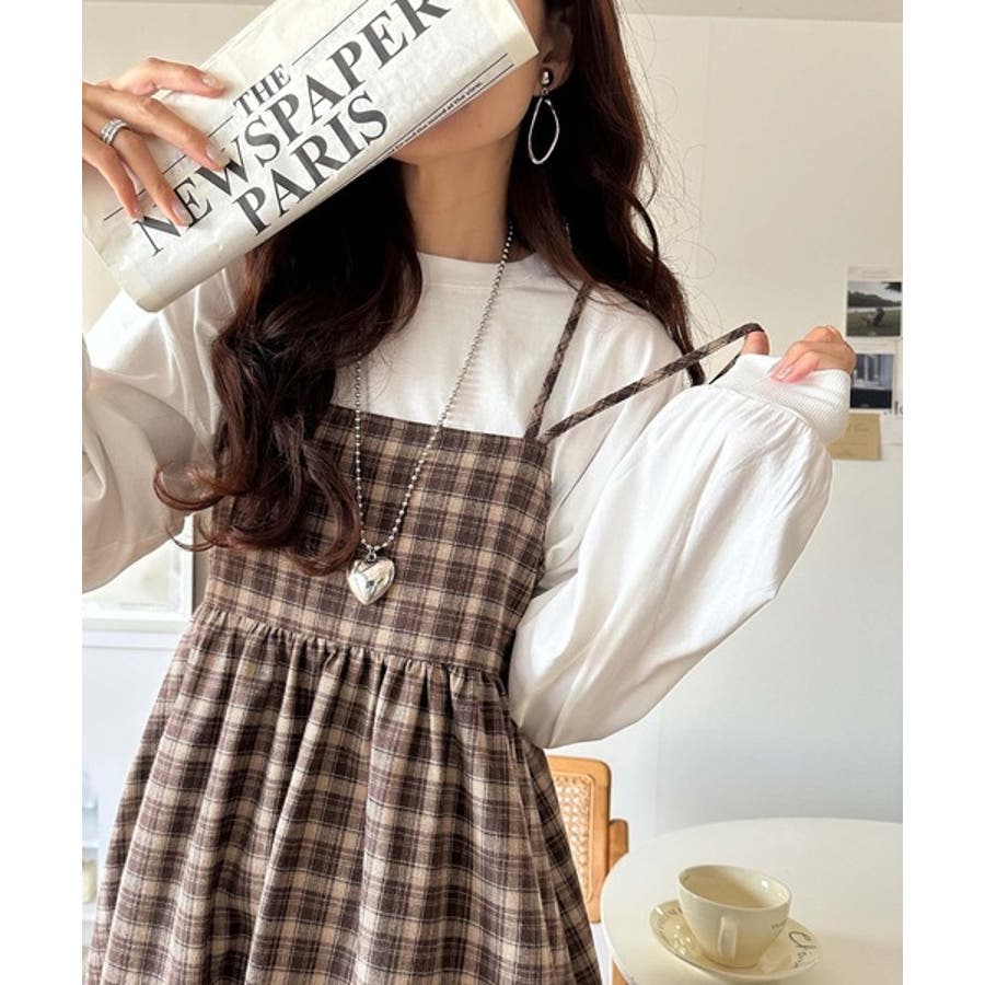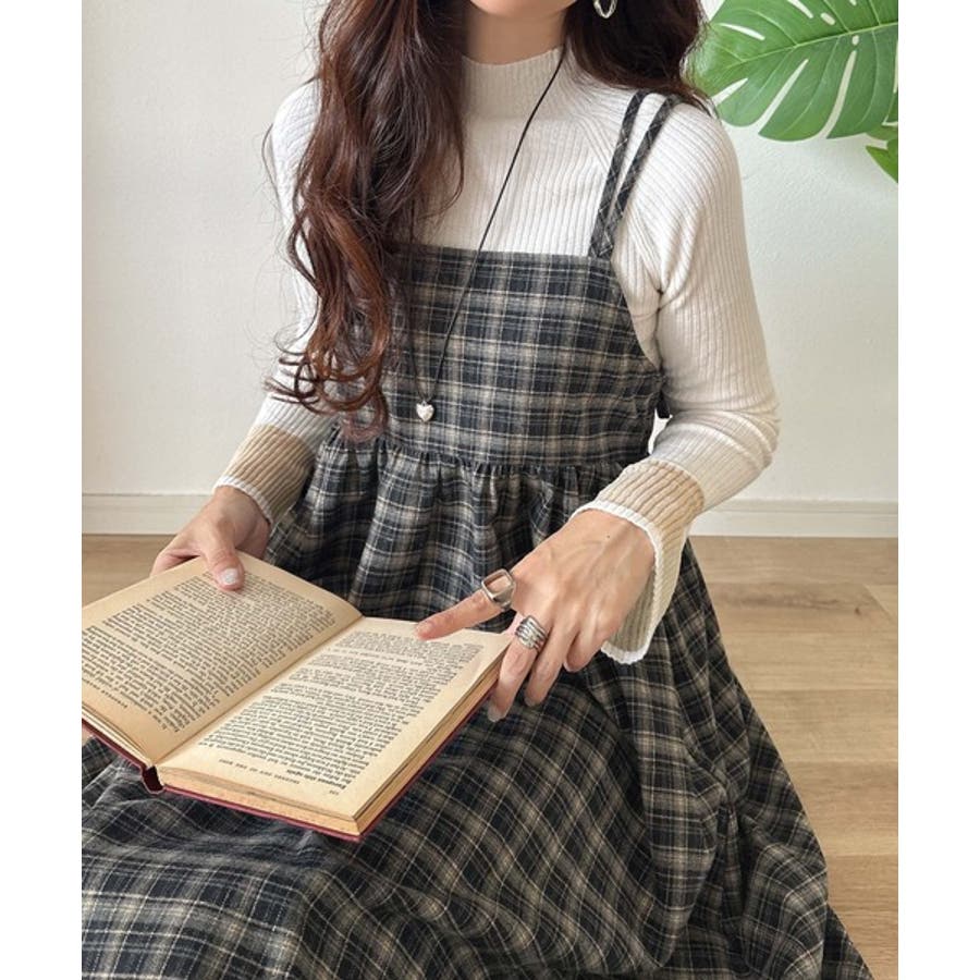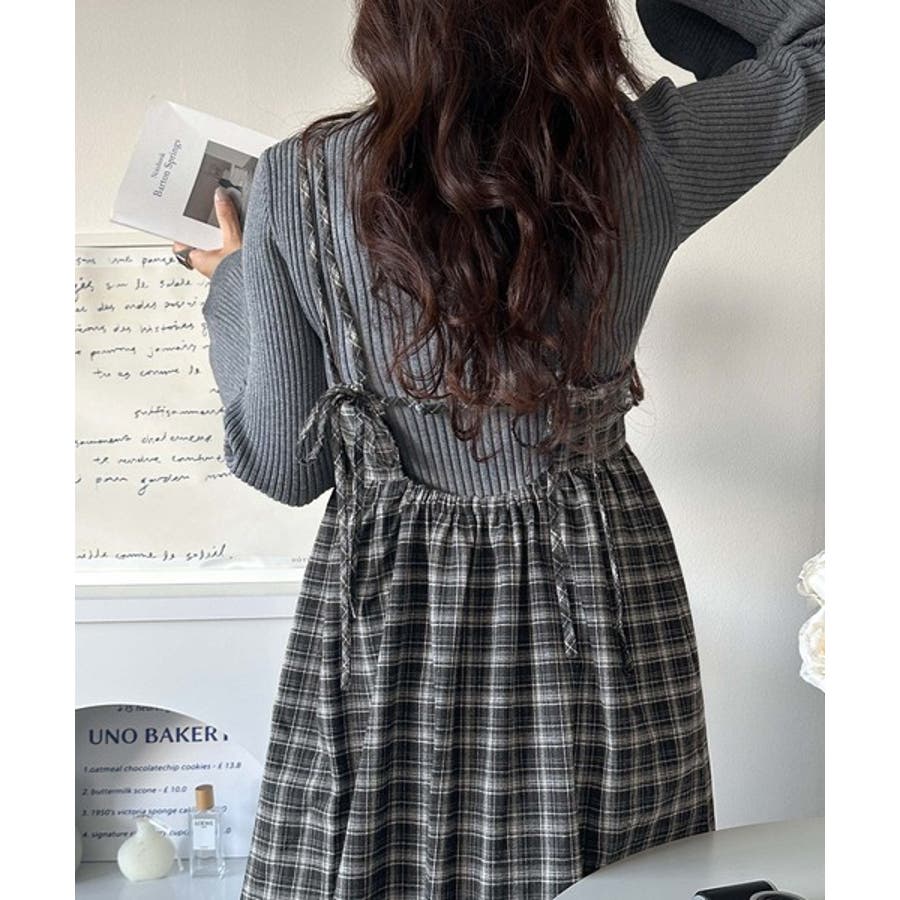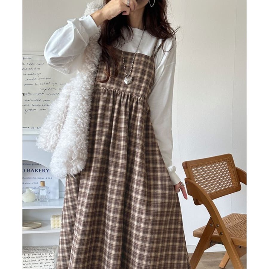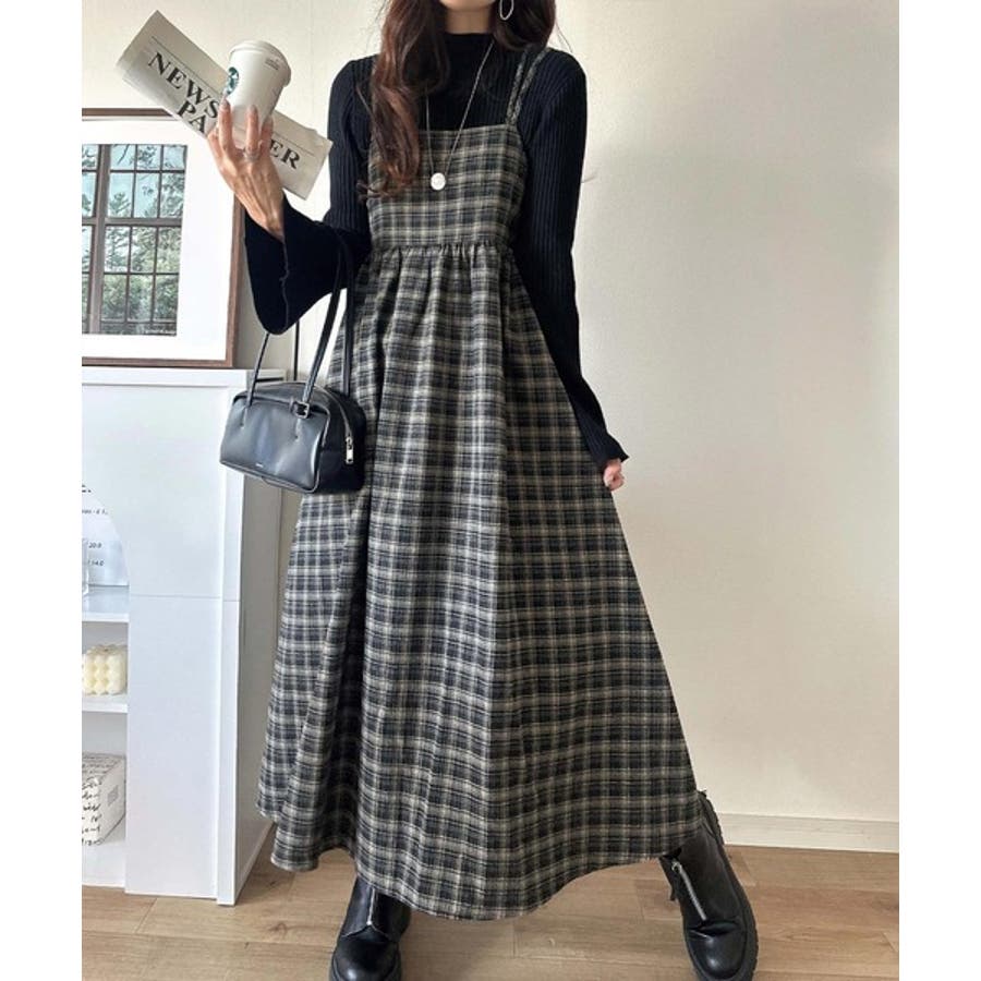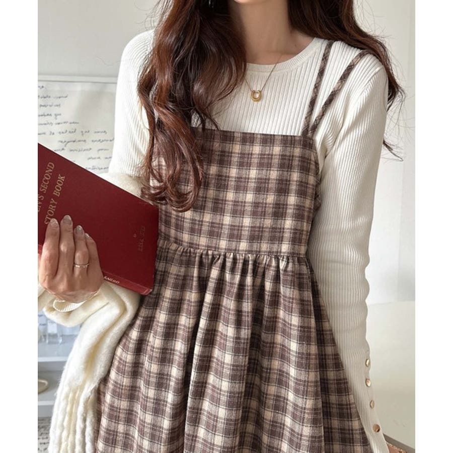 微起毛素材で秋冬にぴったり♪チェック柄ダブルストラップバックリボンキャミワンピ