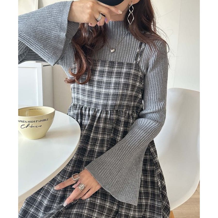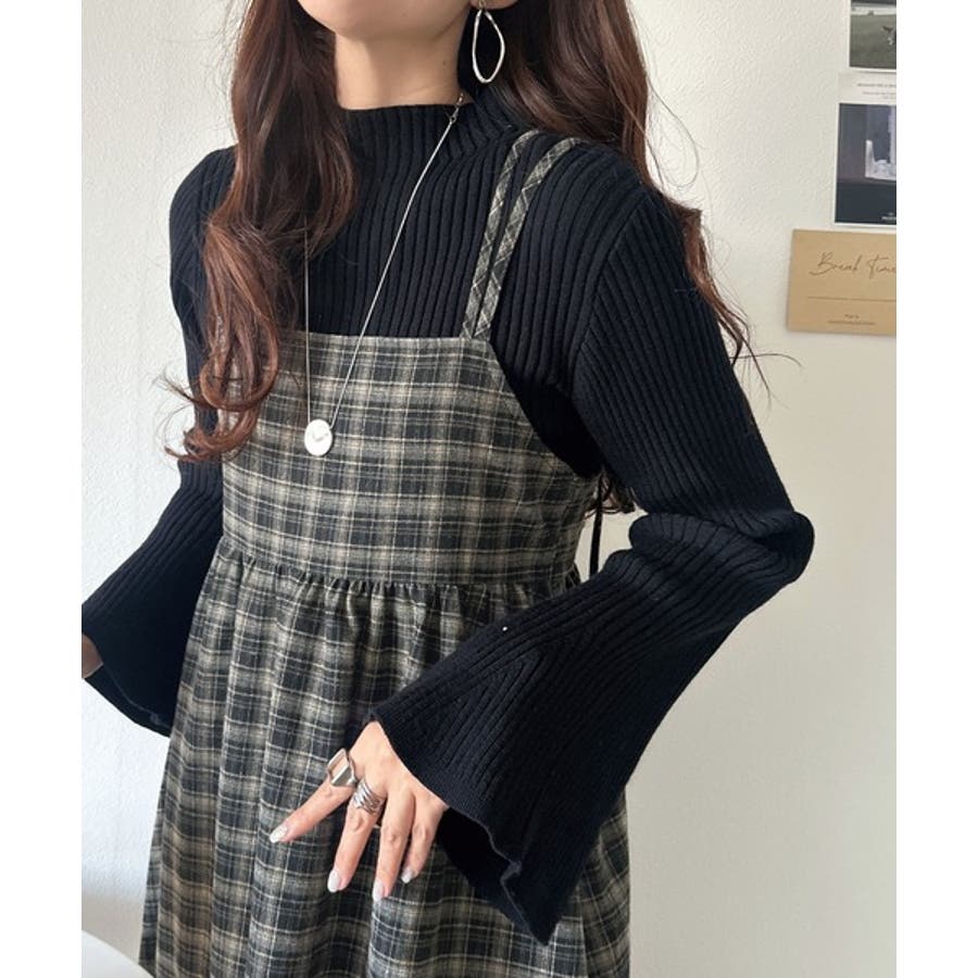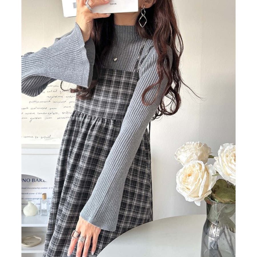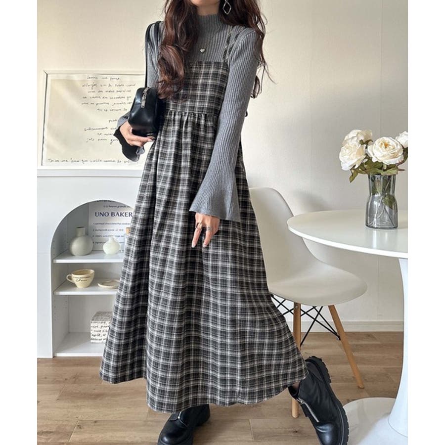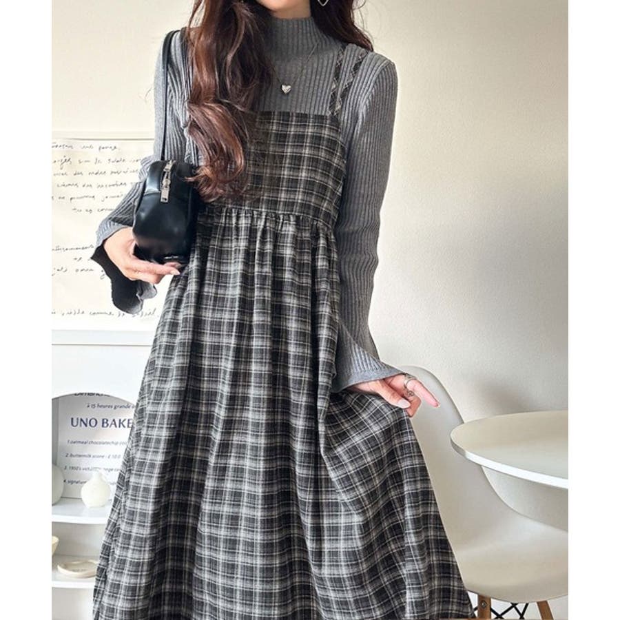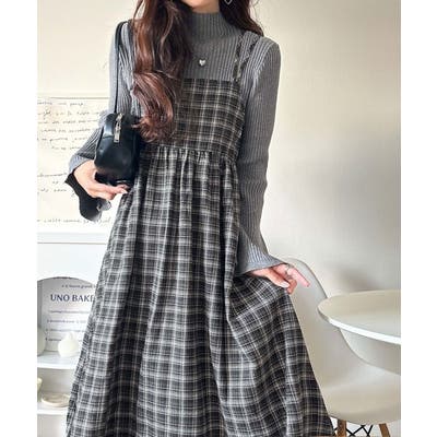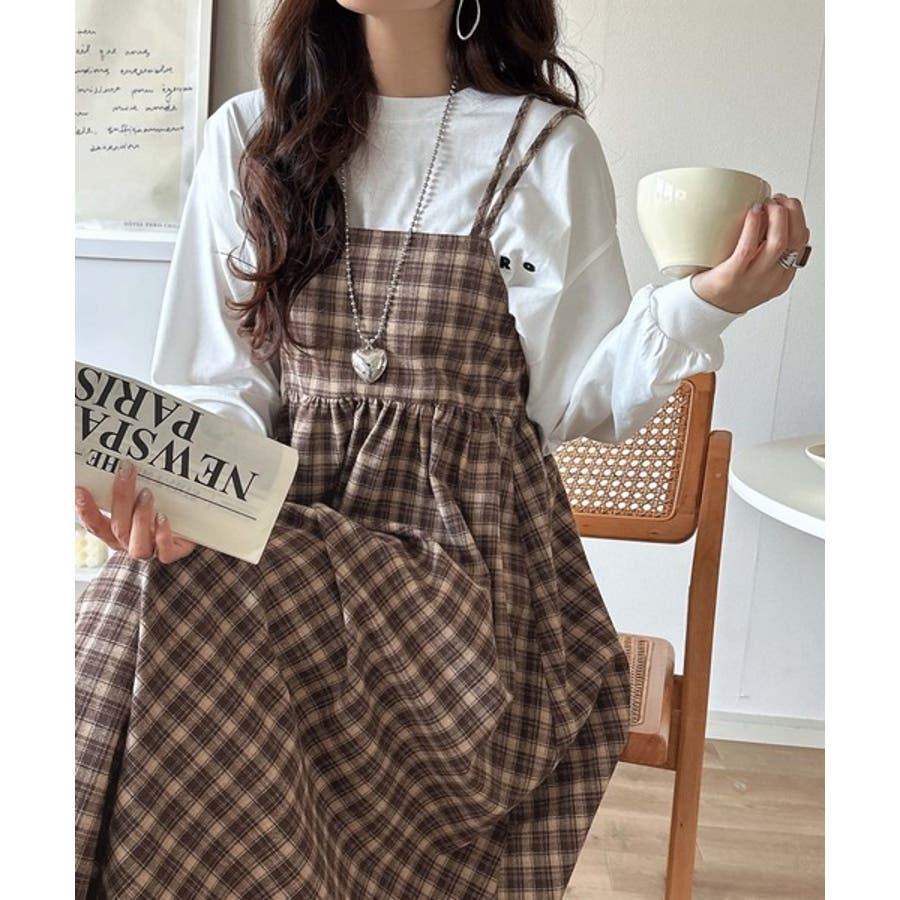 微起毛素材で秋冬にぴったり♪チェック柄ダブルストラップバックリボンキャミワンピ