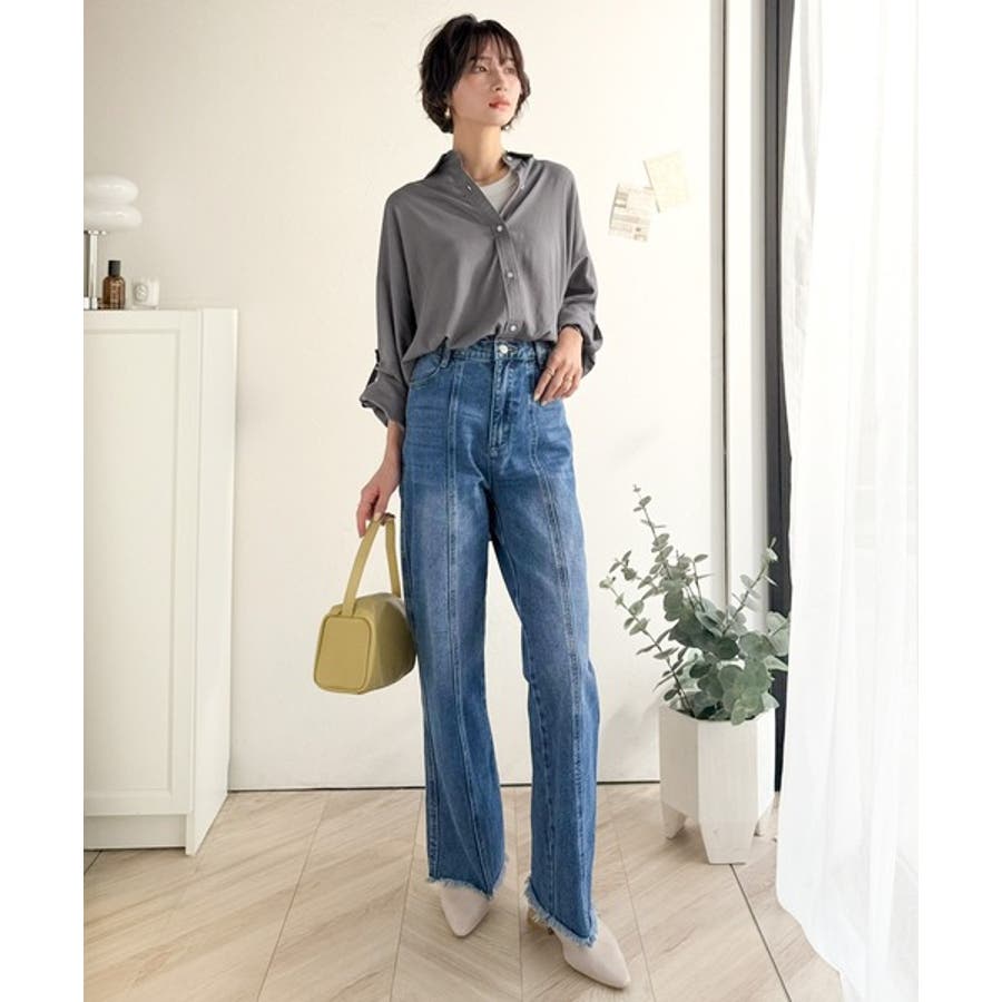 カジュアルコーデを楽しむならデニムやフレアパンツにタックインして合わせるのがオススメ!