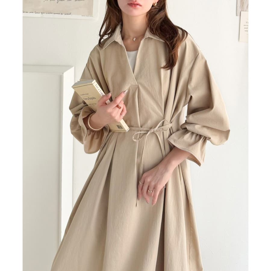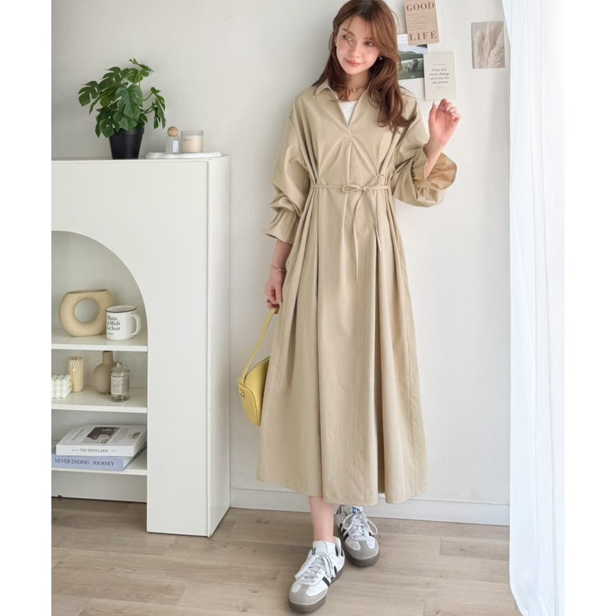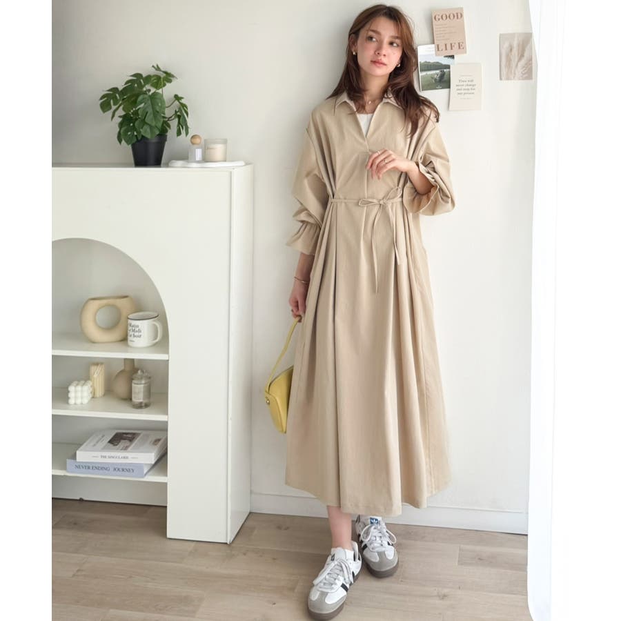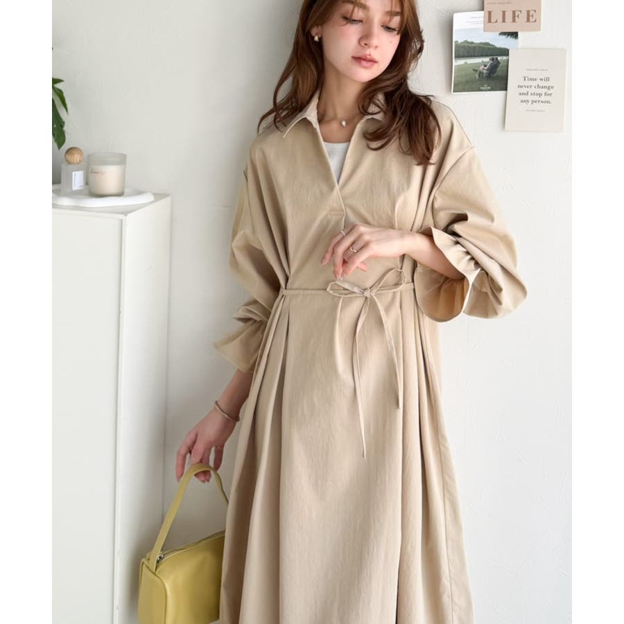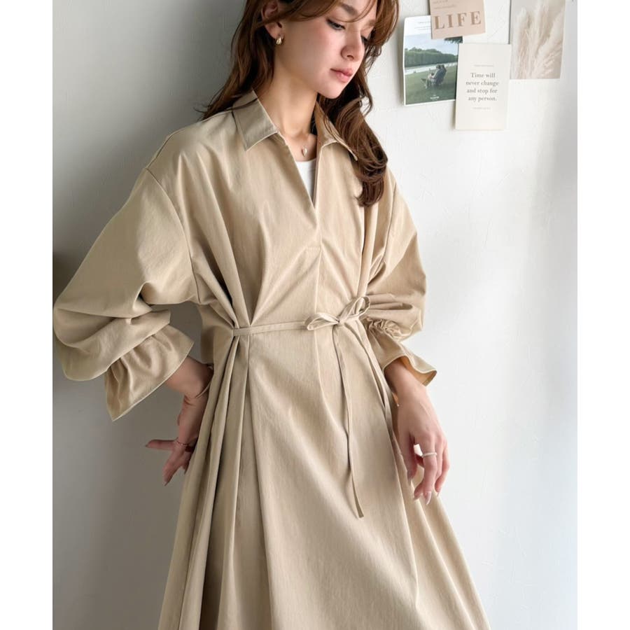 衿付きできちんと感を保ちつつ、ウエストのタックで腰まわりをすっきり見せます。