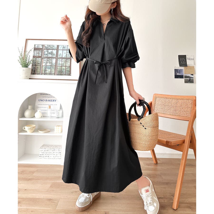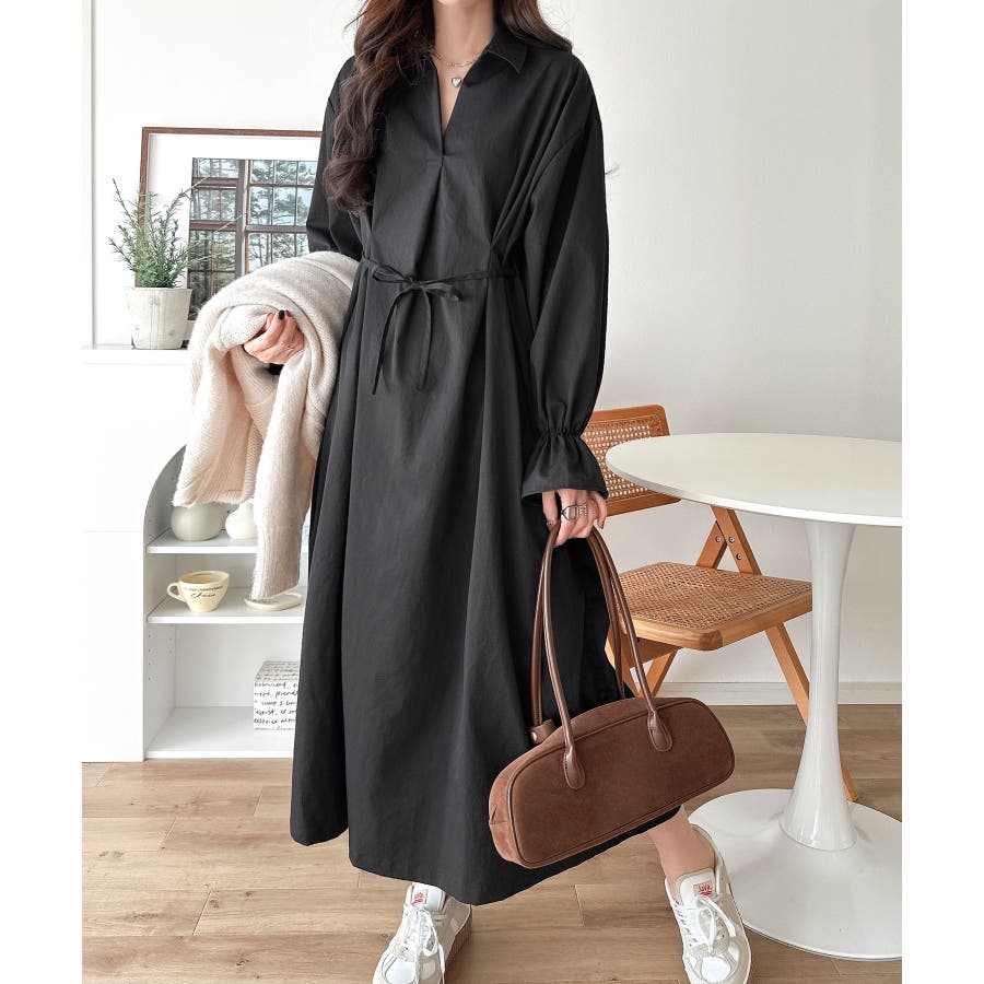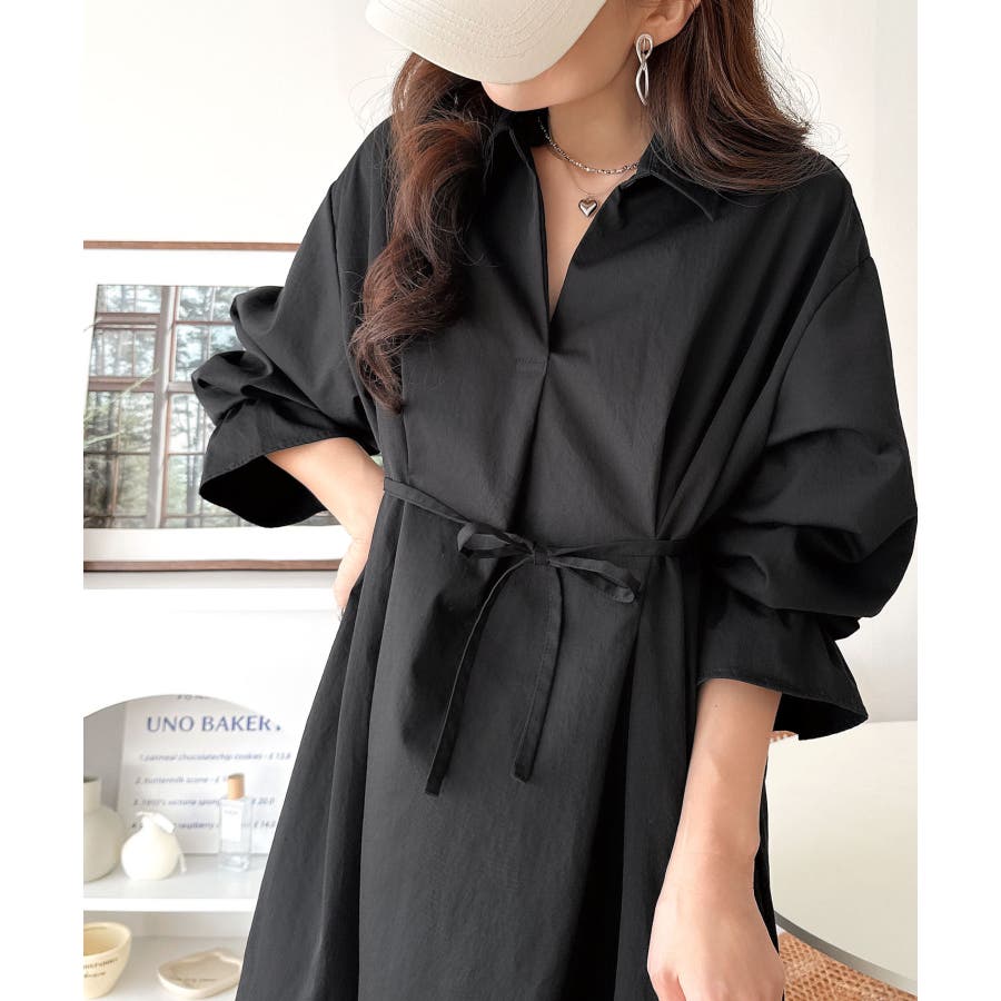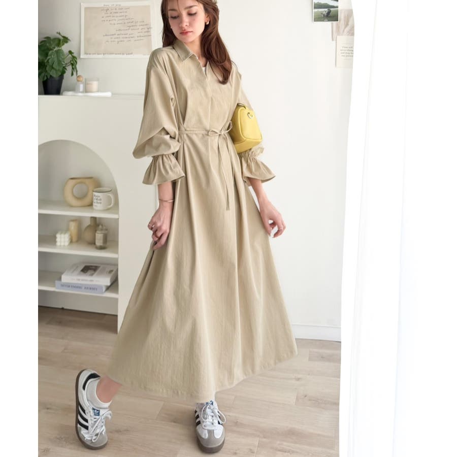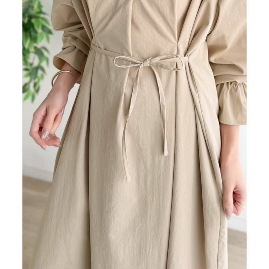 衿付きできちんと感を保ちつつ、ウエストのタックで腰まわりをすっきり見せます。