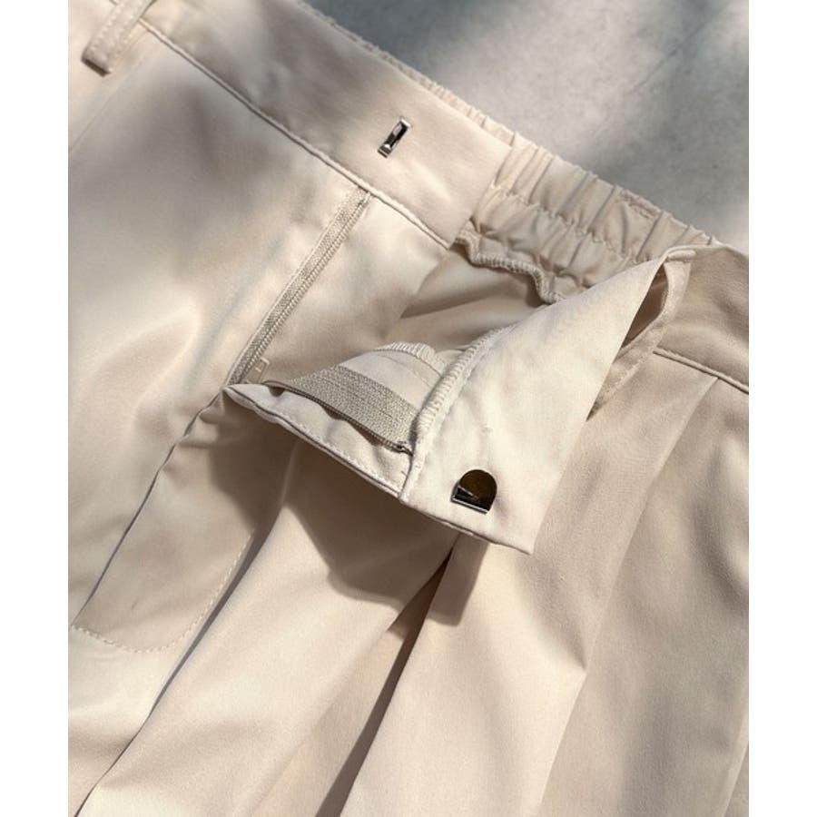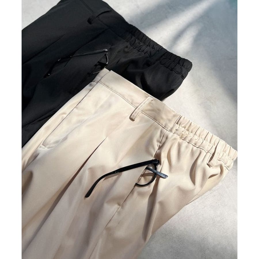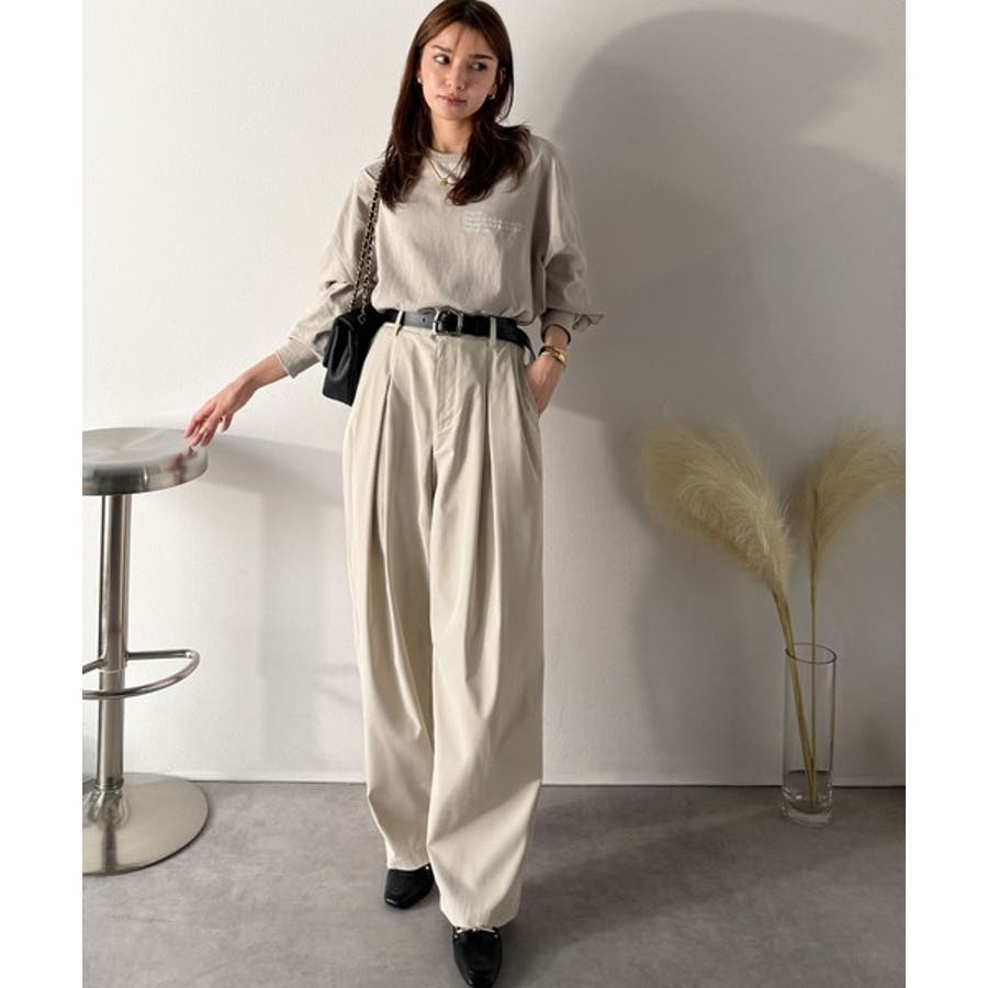 長時間の着用でも快適なリラックス感のあるタックパンツ。
