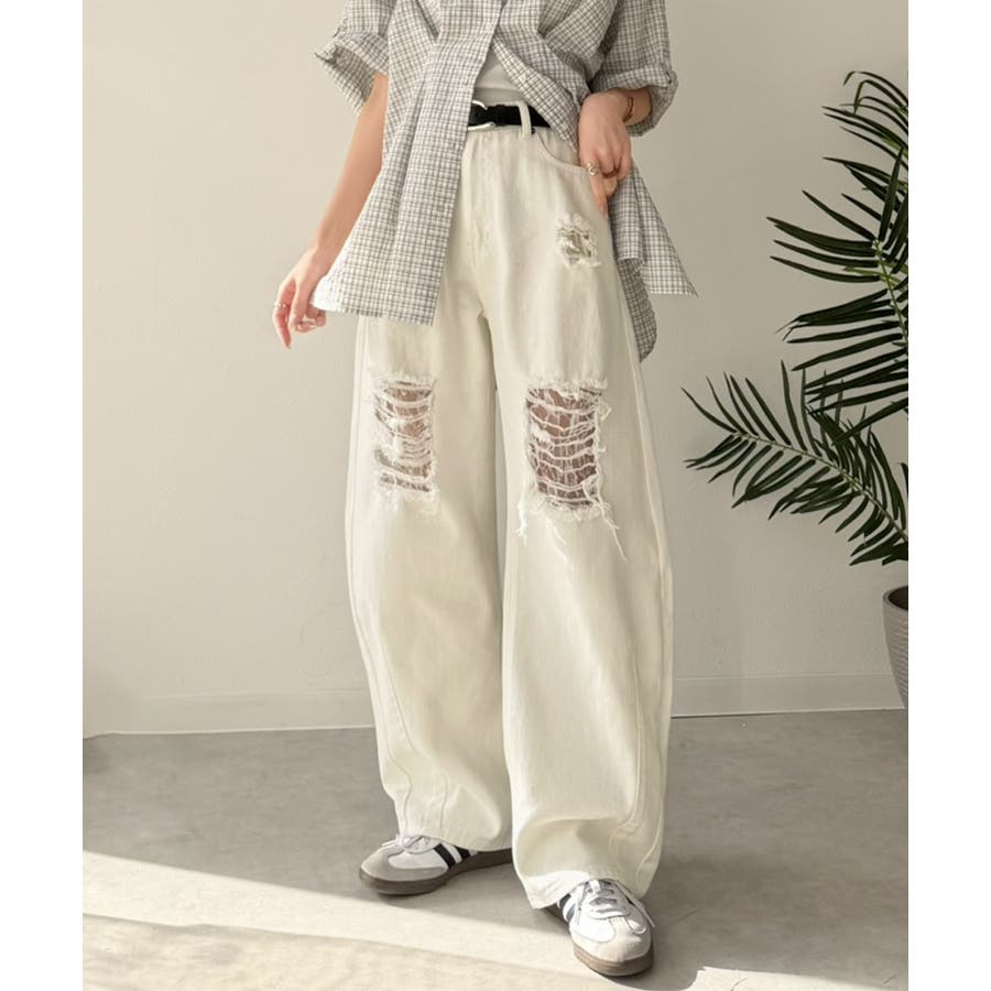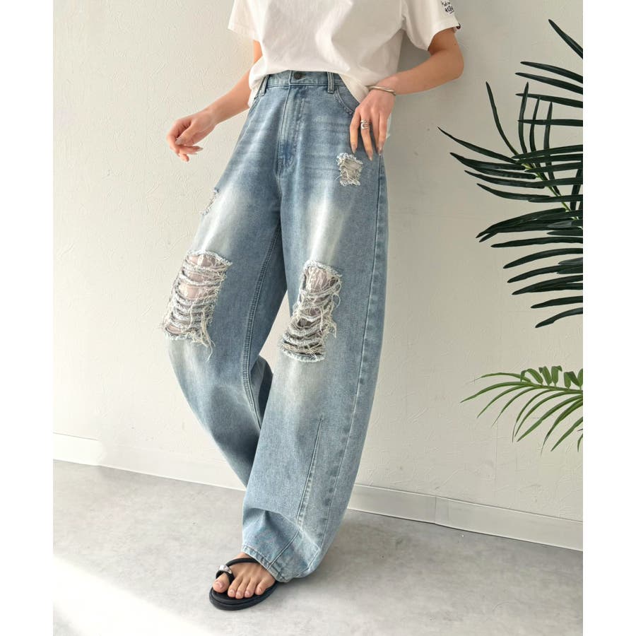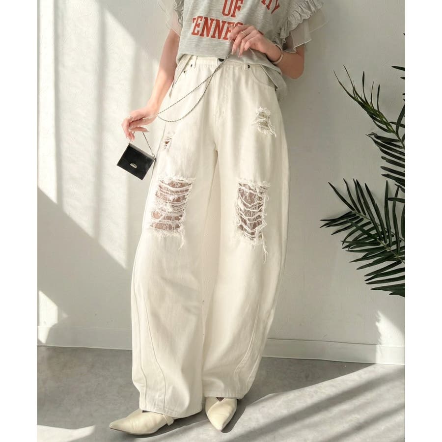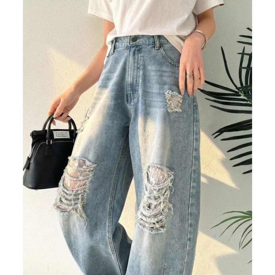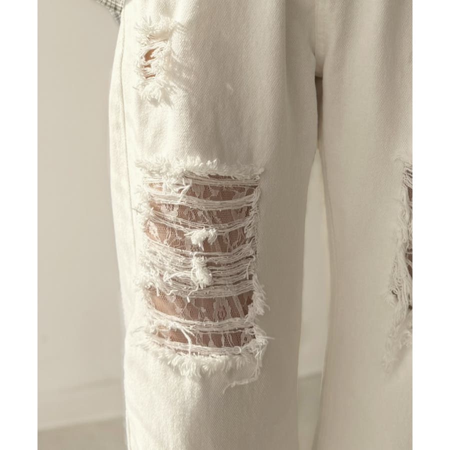 レースにキュン!ラフに攻めて。綿100% レース付きダメージデニムカーブパンツ