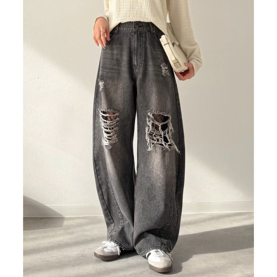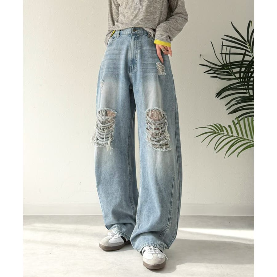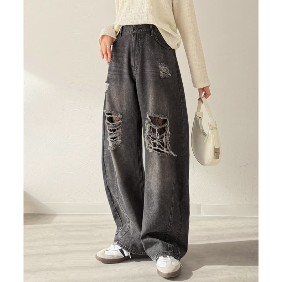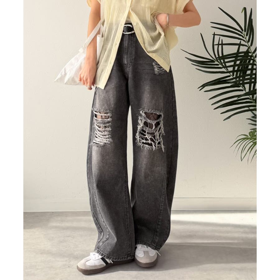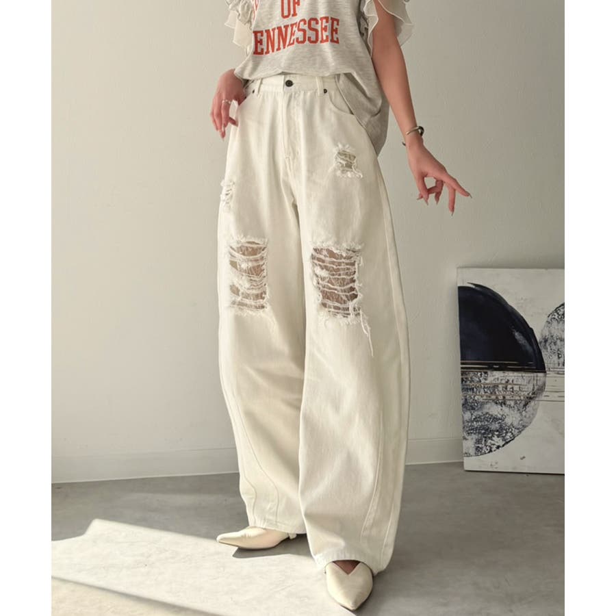 レースにキュン!ラフに攻めて。綿100% レース付きダメージデニムカーブパンツ