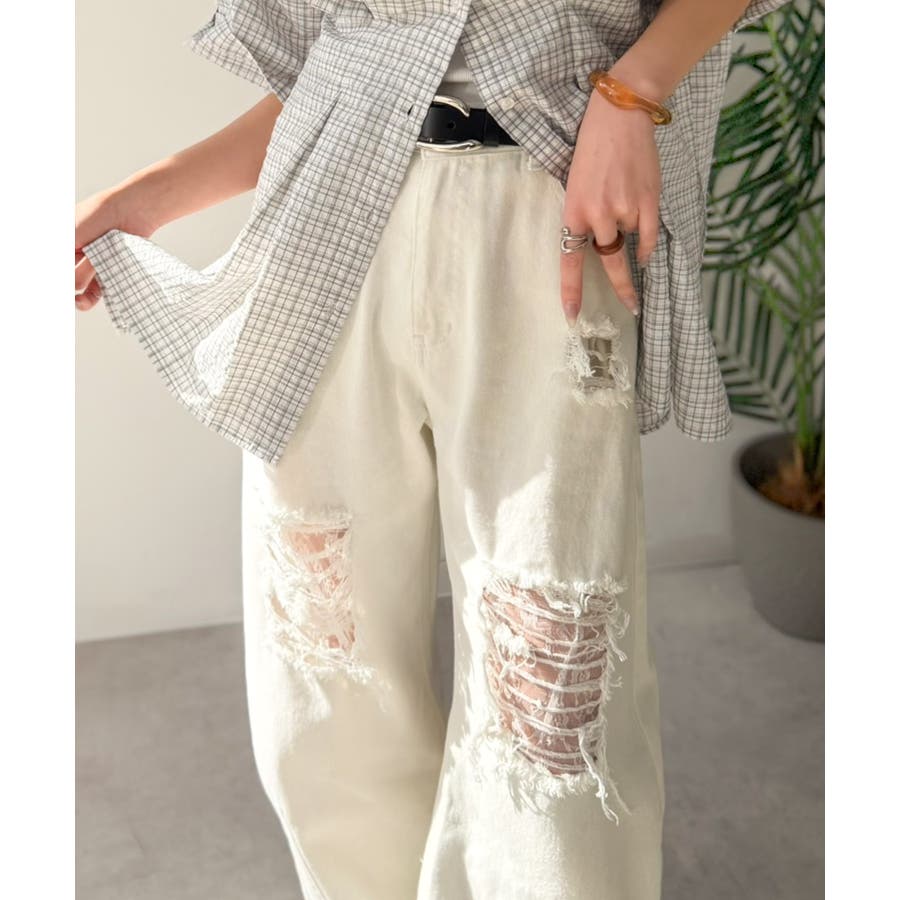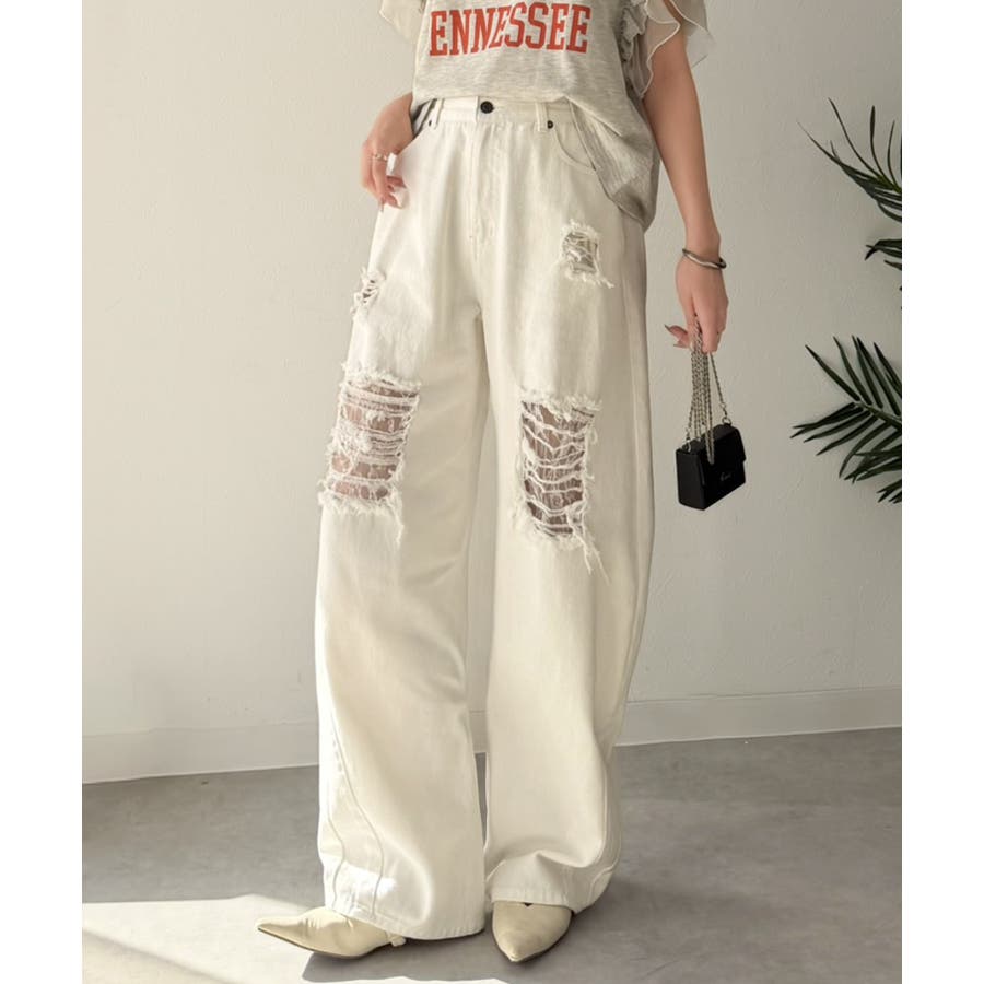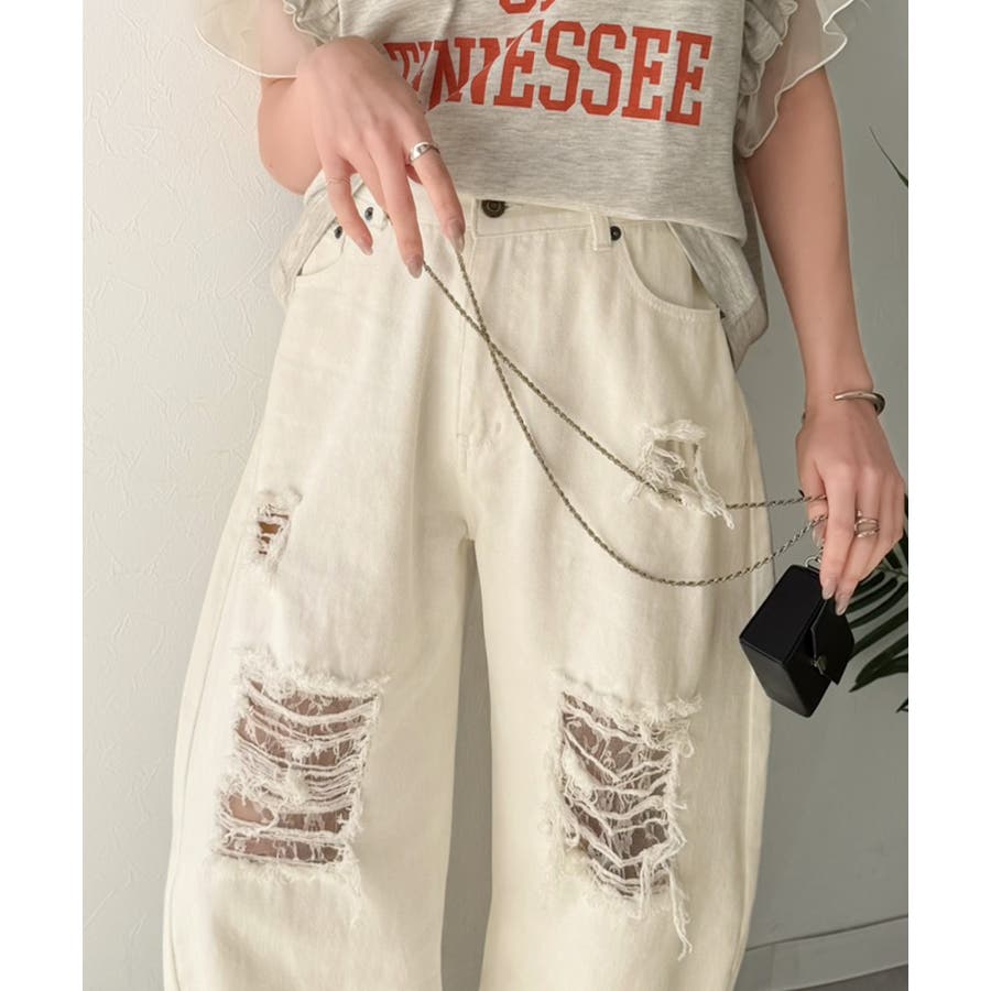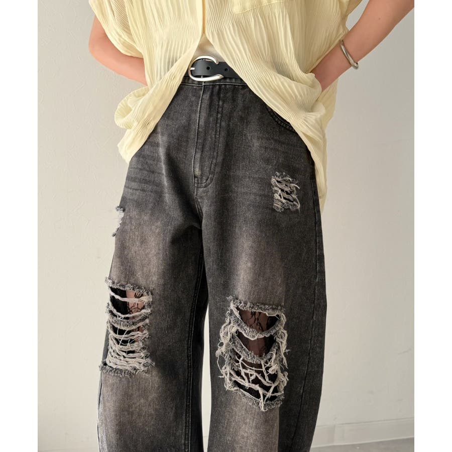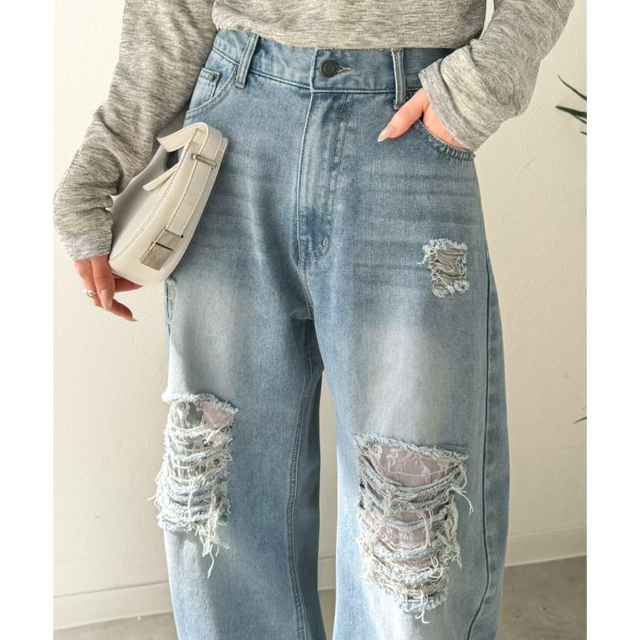 程よい厚みのデニムに、ダメージ部分は内側からレースを重ね、上品な肌見せを演出。