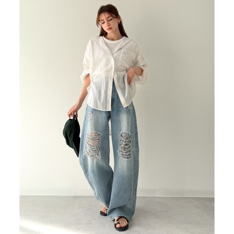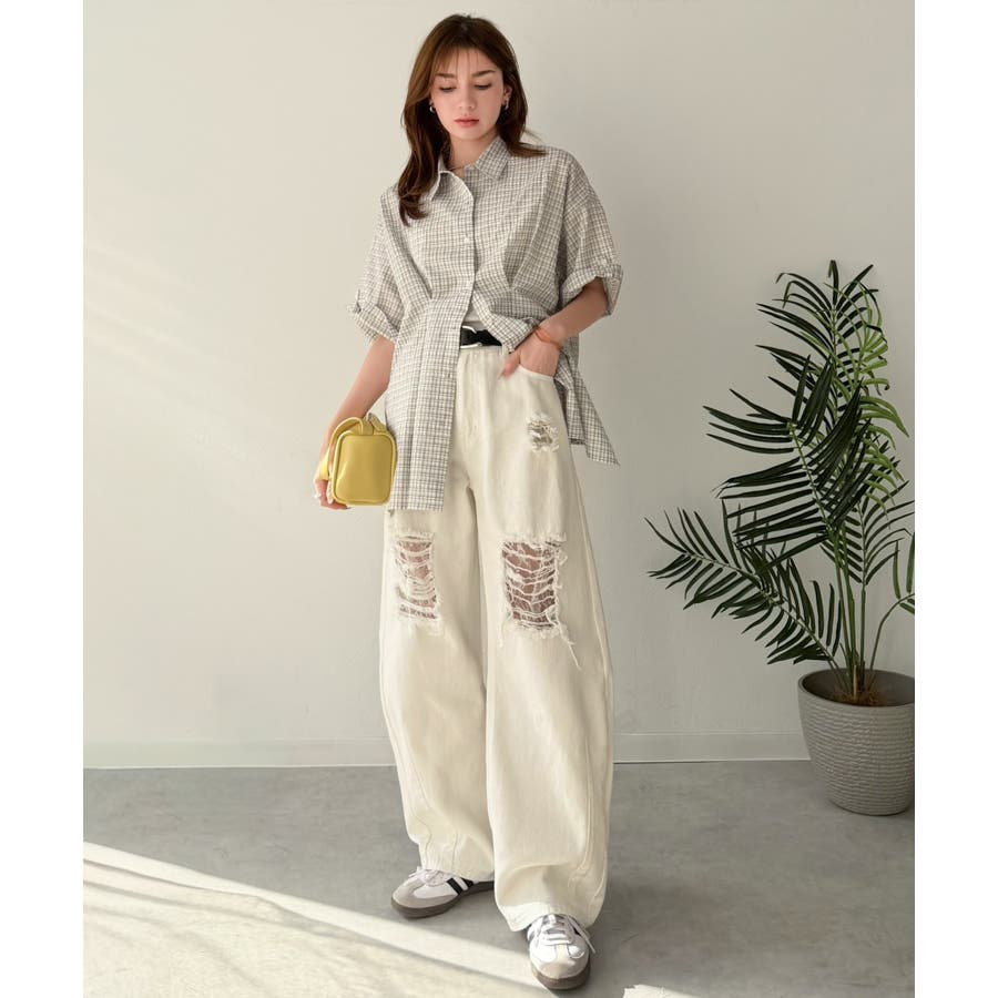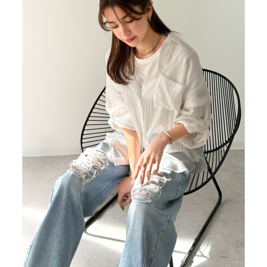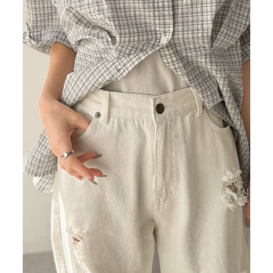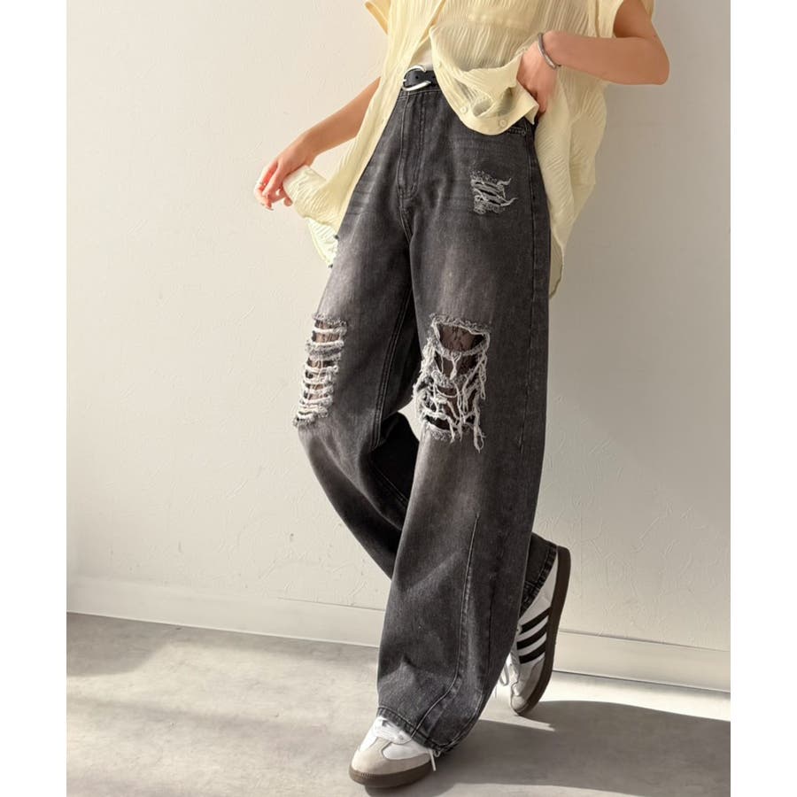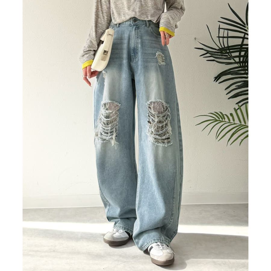 程よい厚みのデニムに、ダメージ部分は内側からレースを重ね、上品な肌見せを演出。