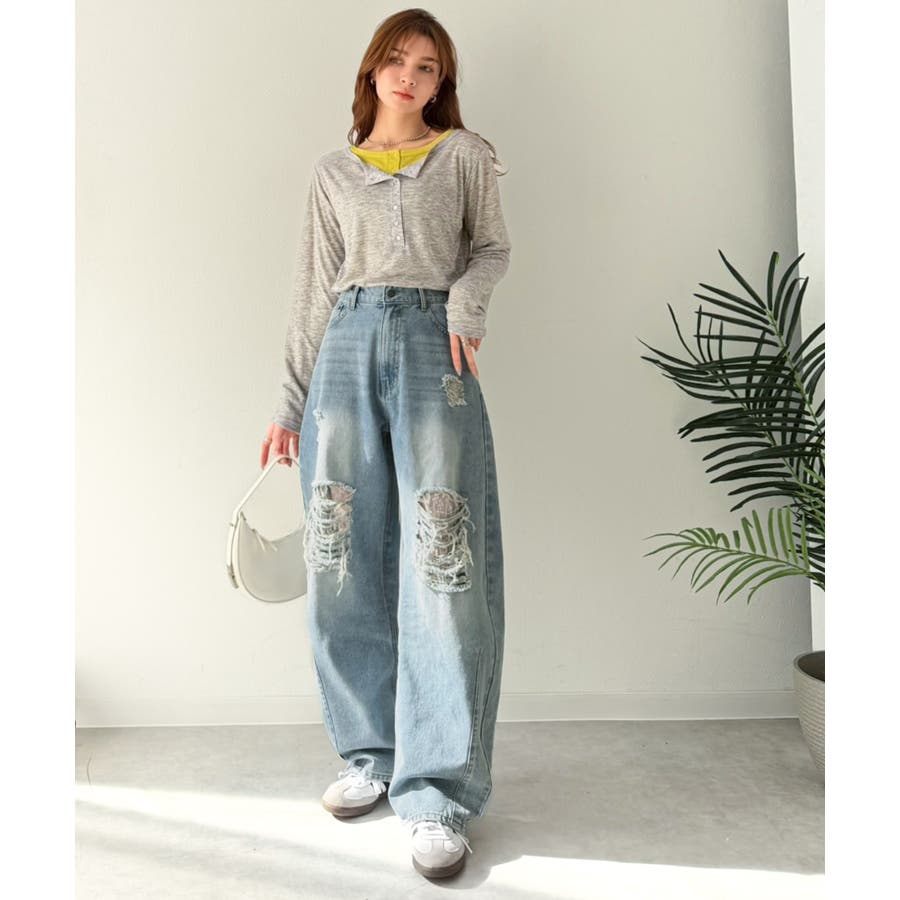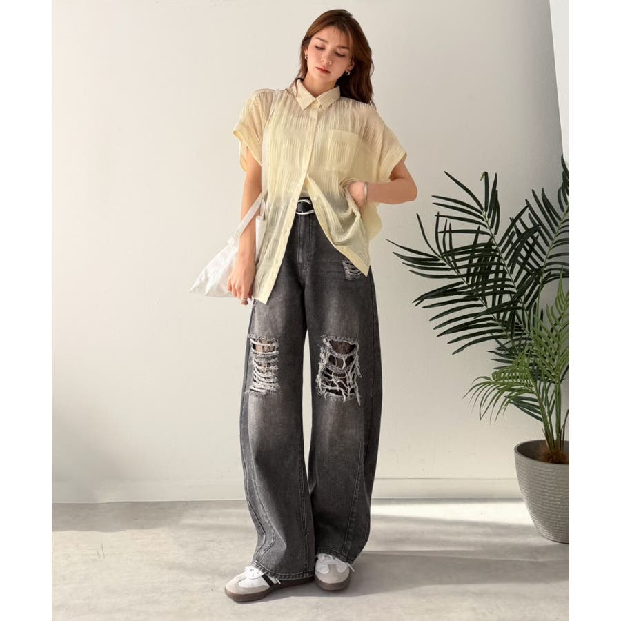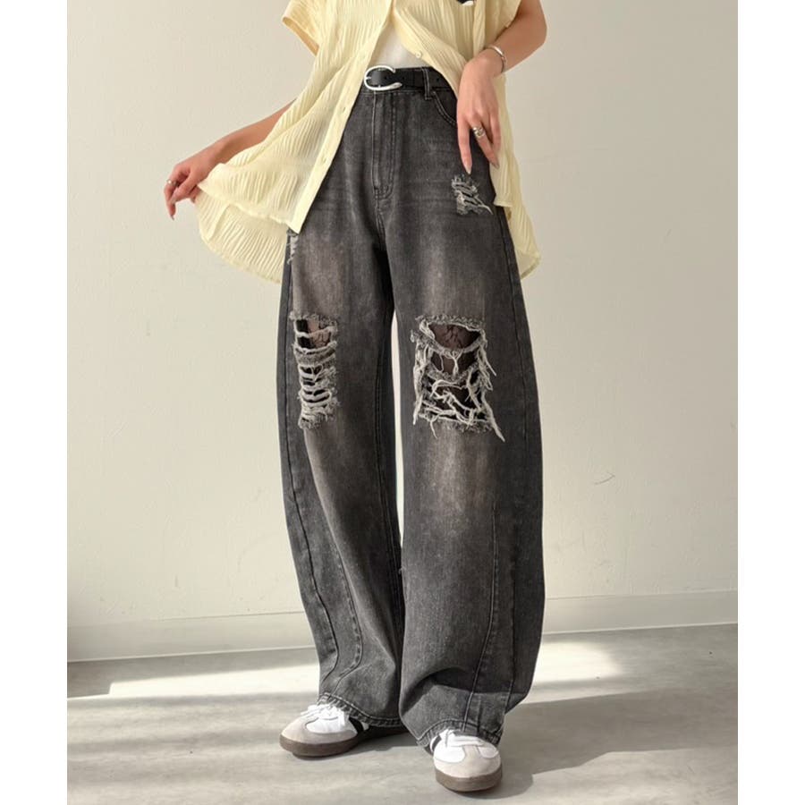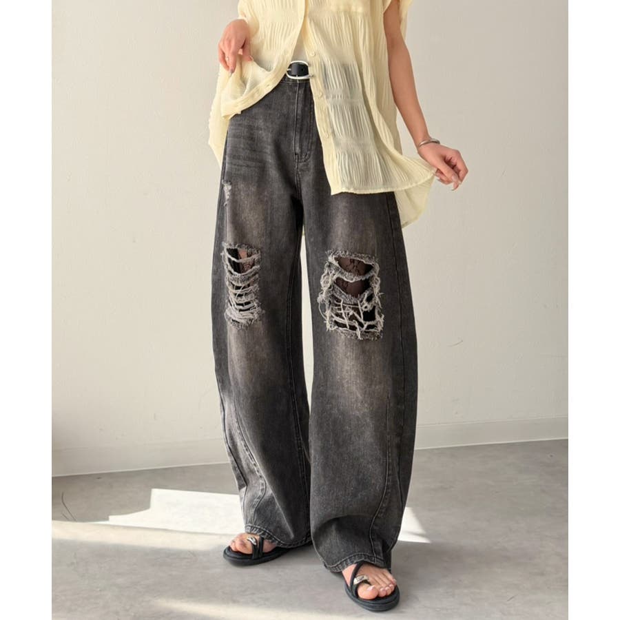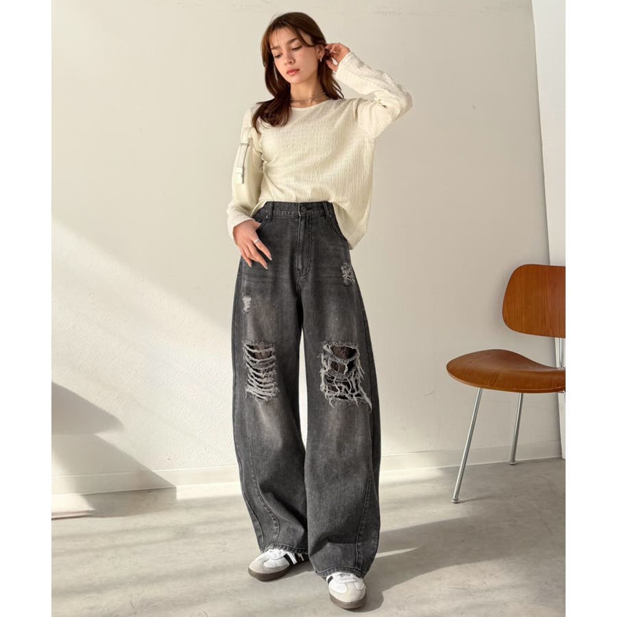 程よい厚みのデニムに、ダメージ部分は内側からレースを重ね、上品な肌見せを演出。