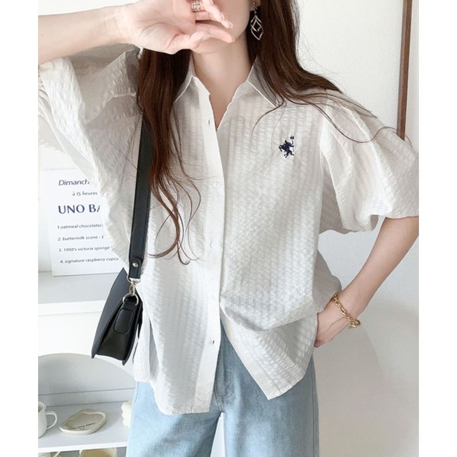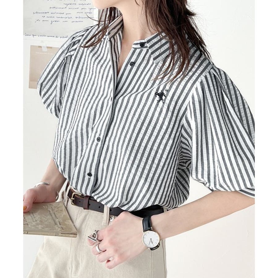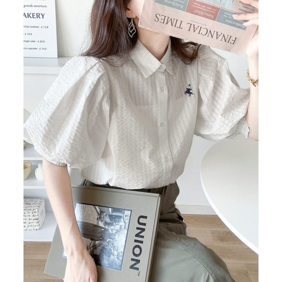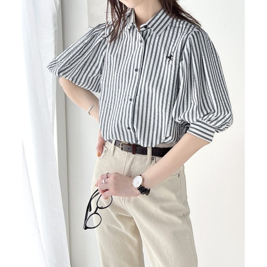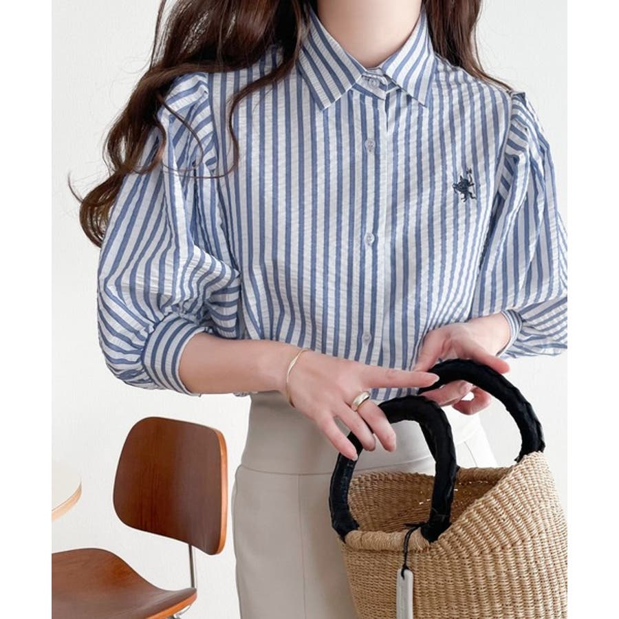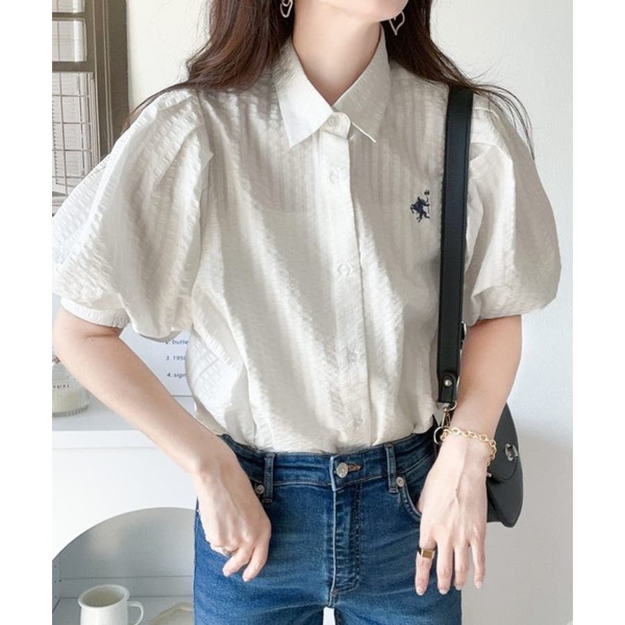 爽やかふんわりテイスト。タック入りボリュームスリーブ胸刺繍サッカーシャツ