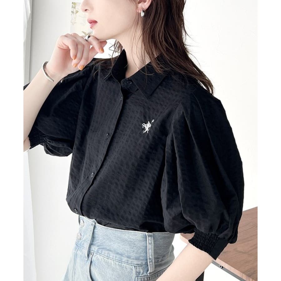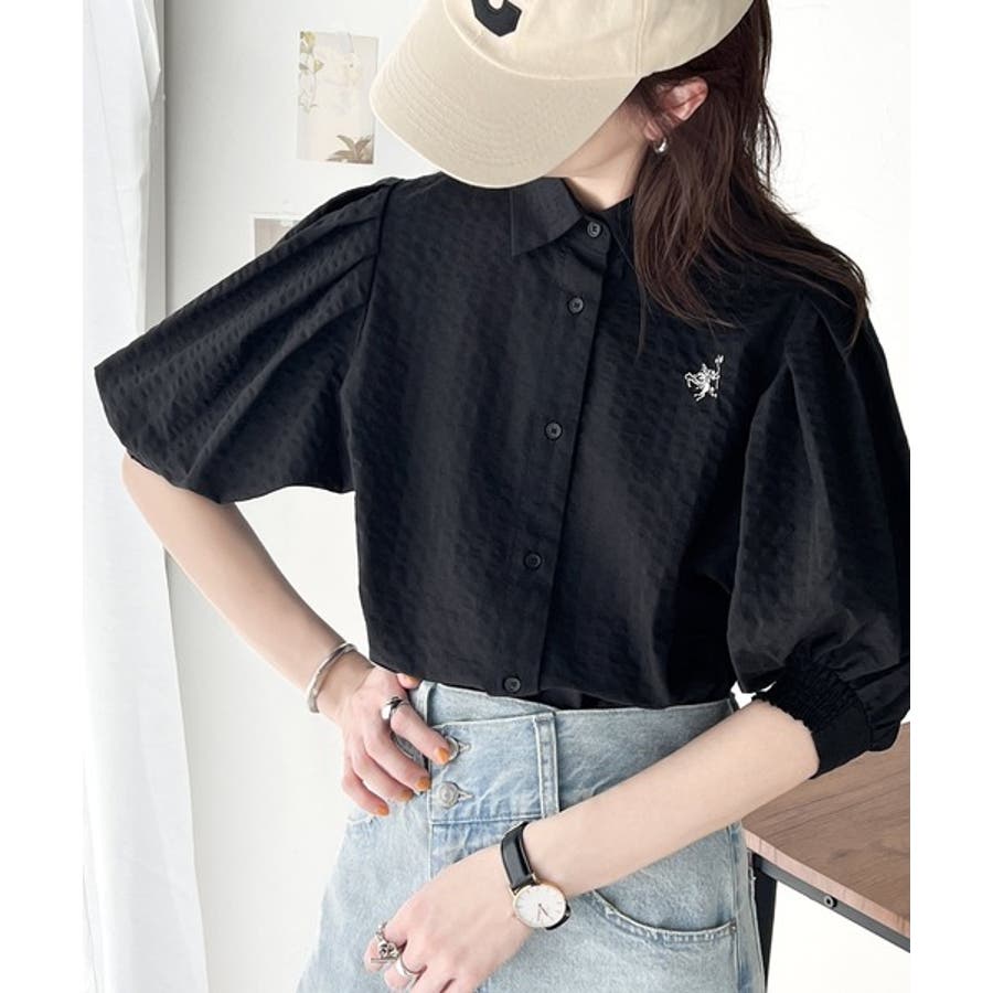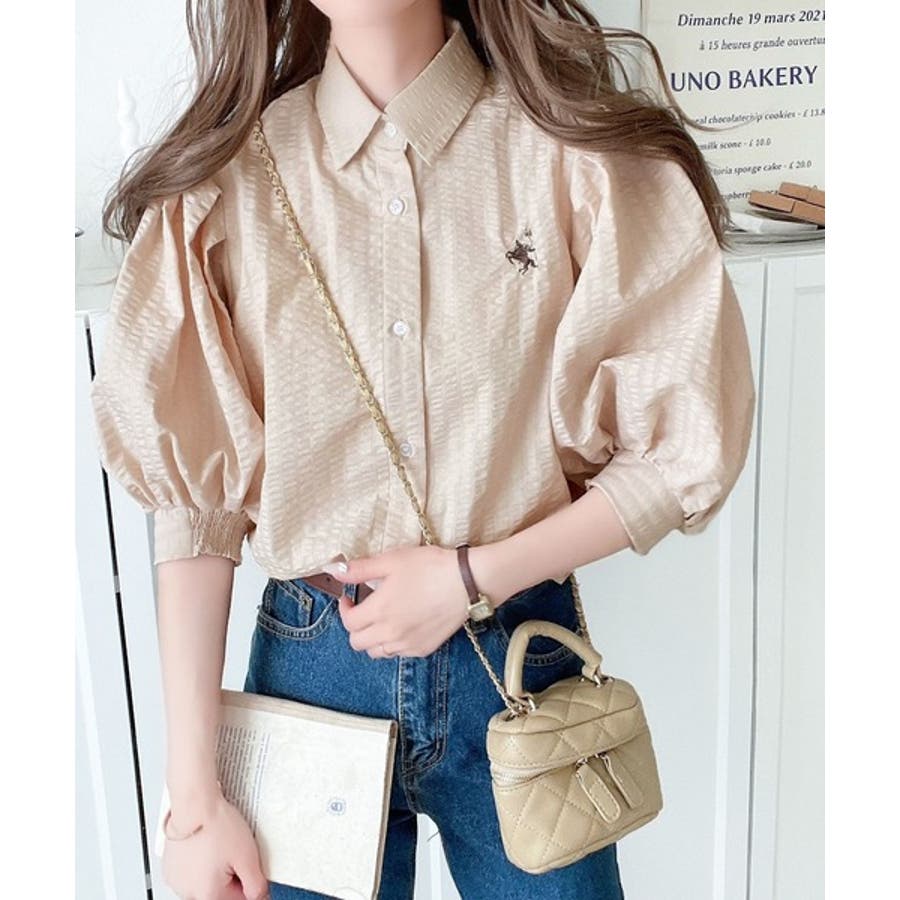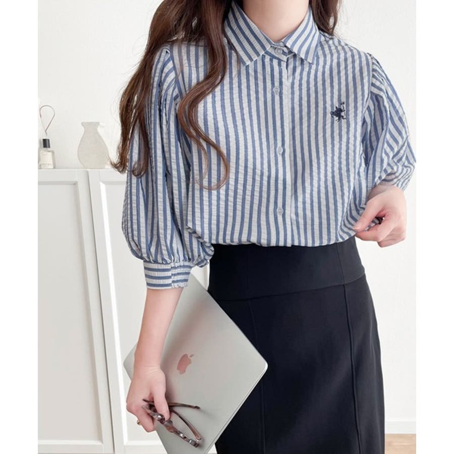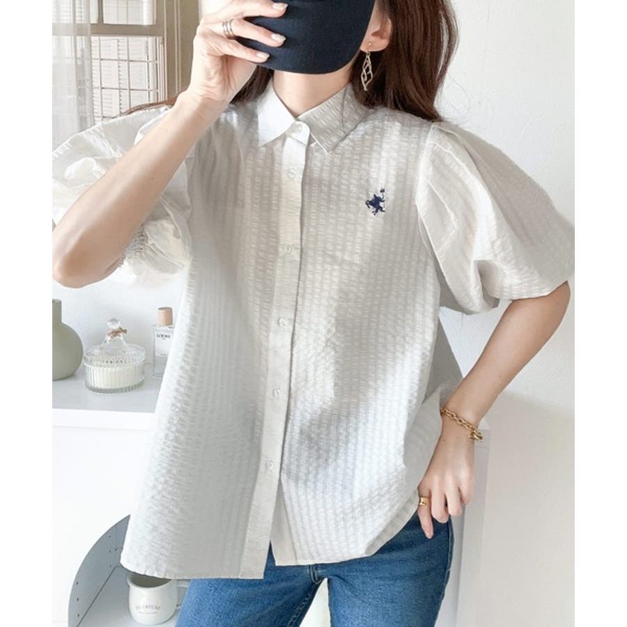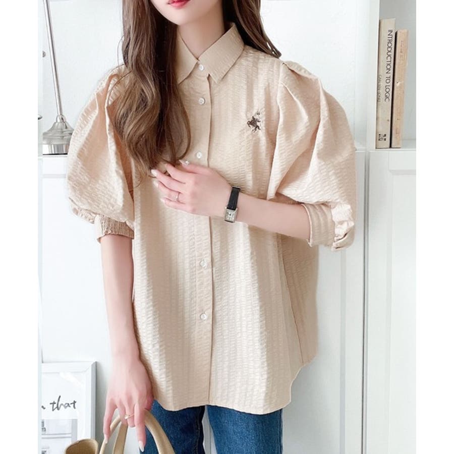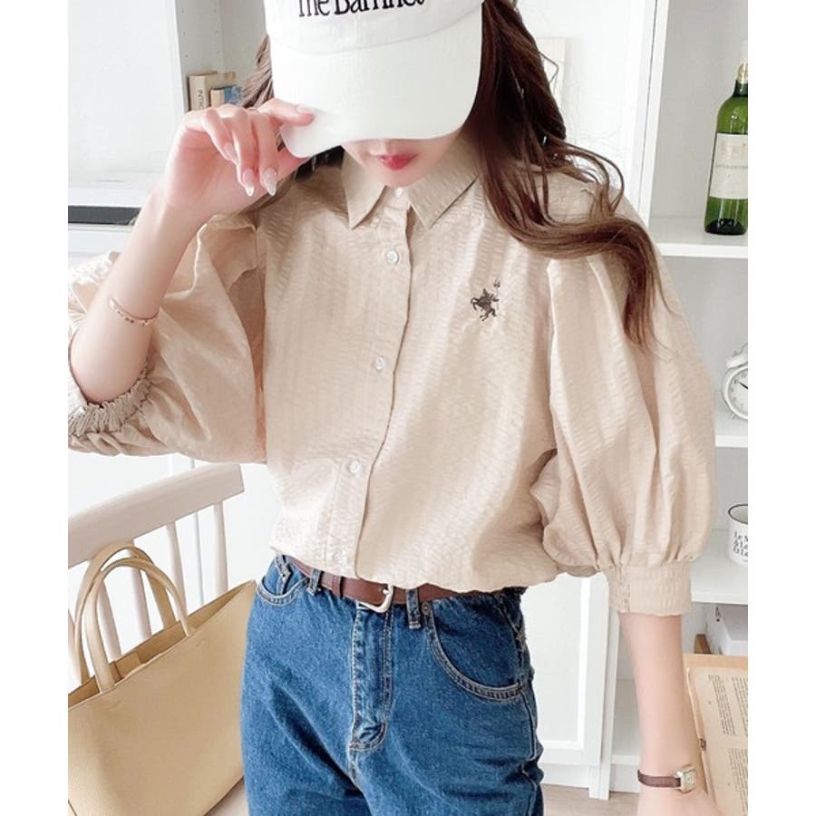 爽やかふんわりテイスト。タック入りボリュームスリーブ胸刺繍サッカーシャツ