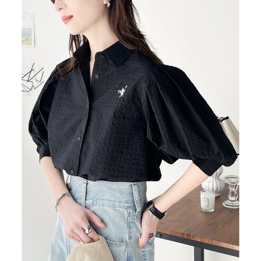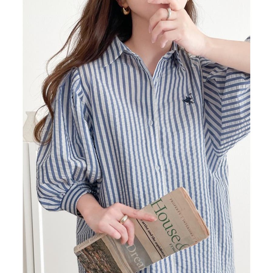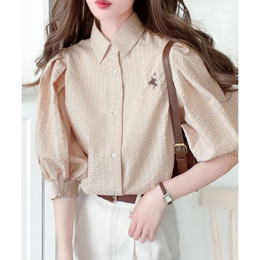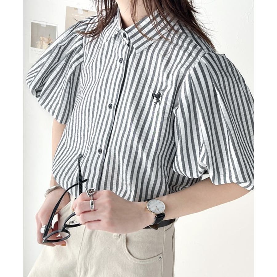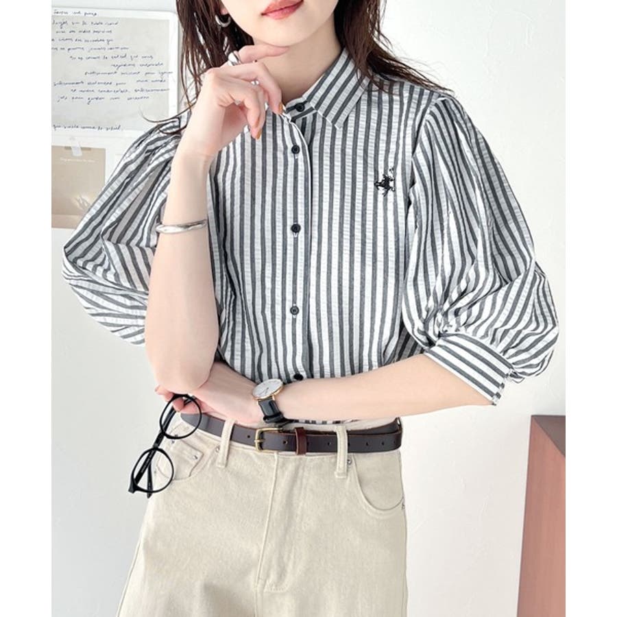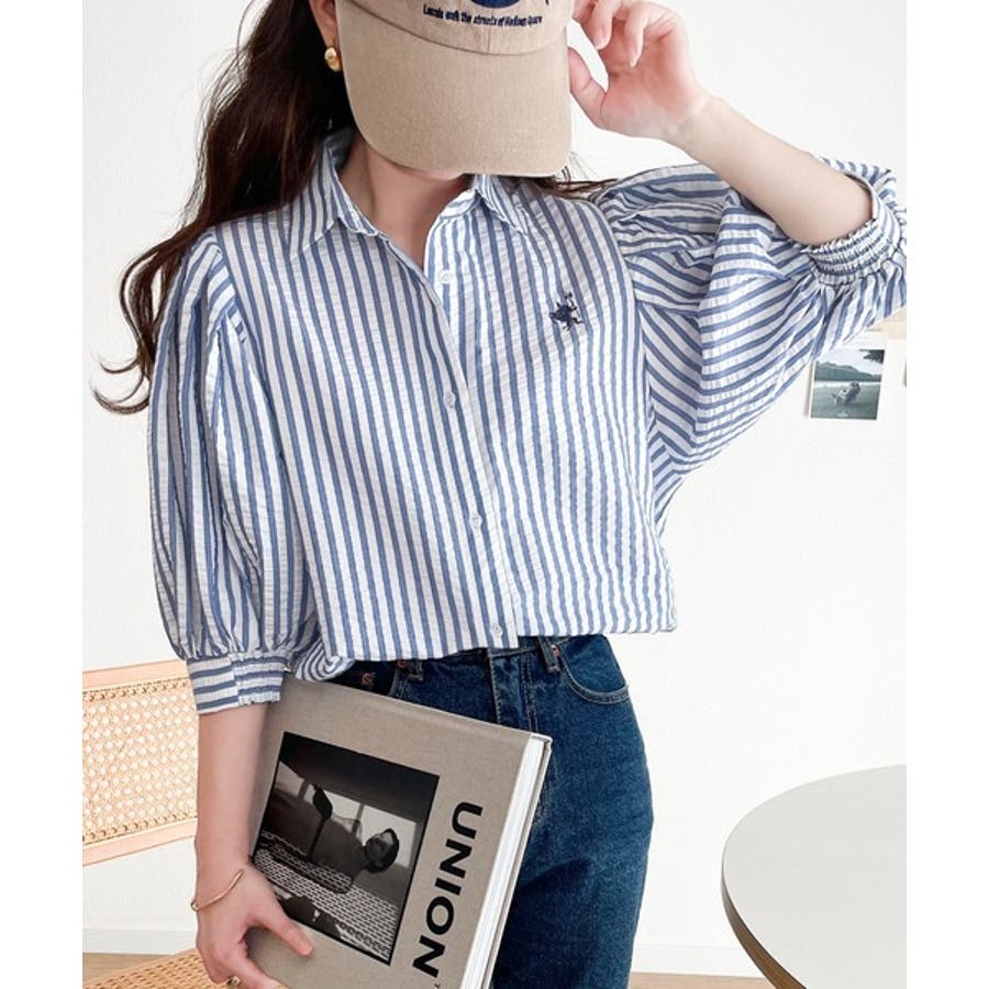 爽やかふんわりテイスト。タック入りボリュームスリーブ胸刺繍サッカーシャツ