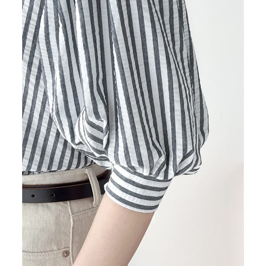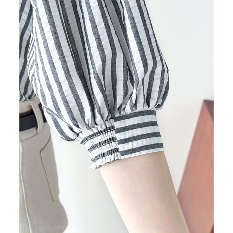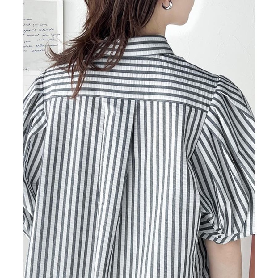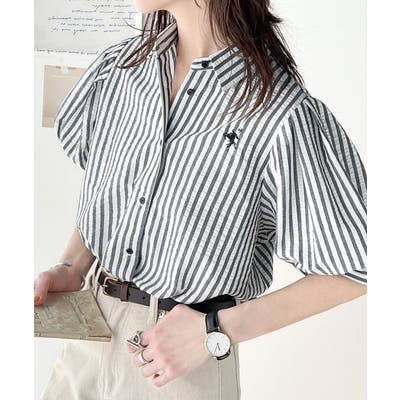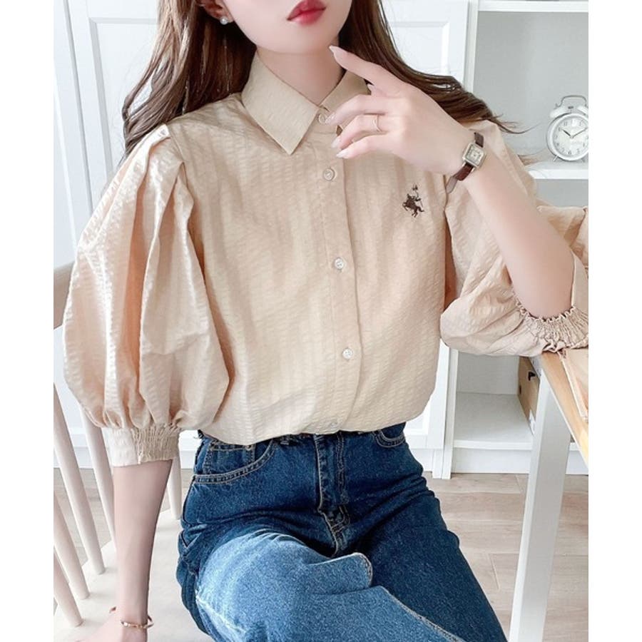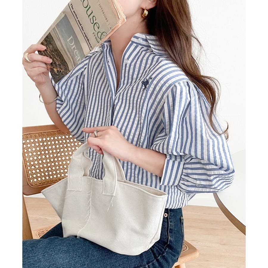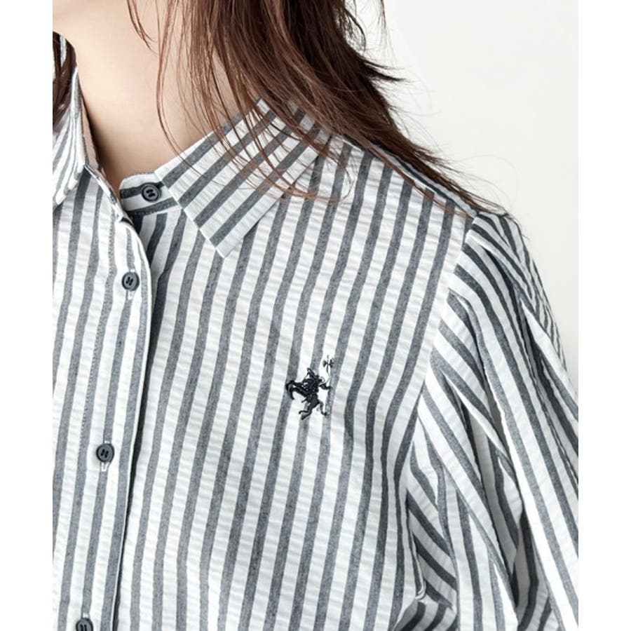 爽やかふんわりテイスト。タック入りボリュームスリーブ胸刺繍サッカーシャツ