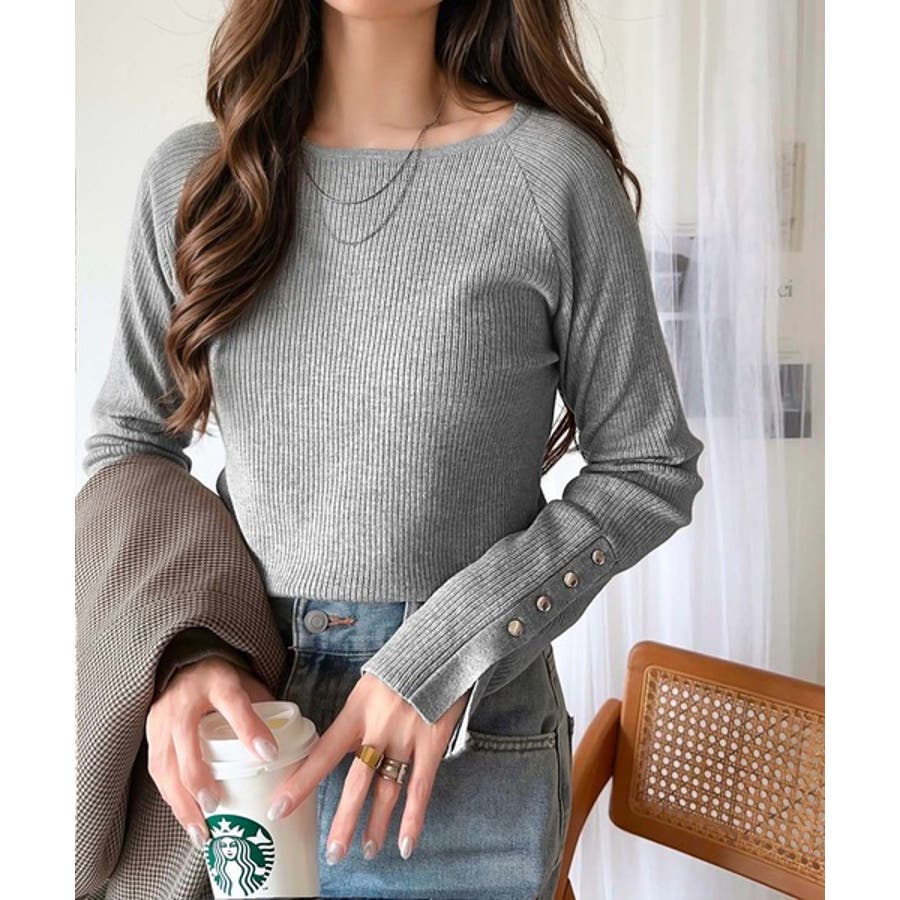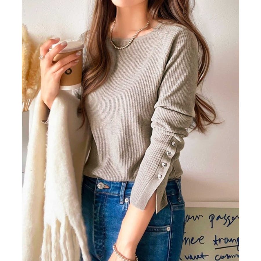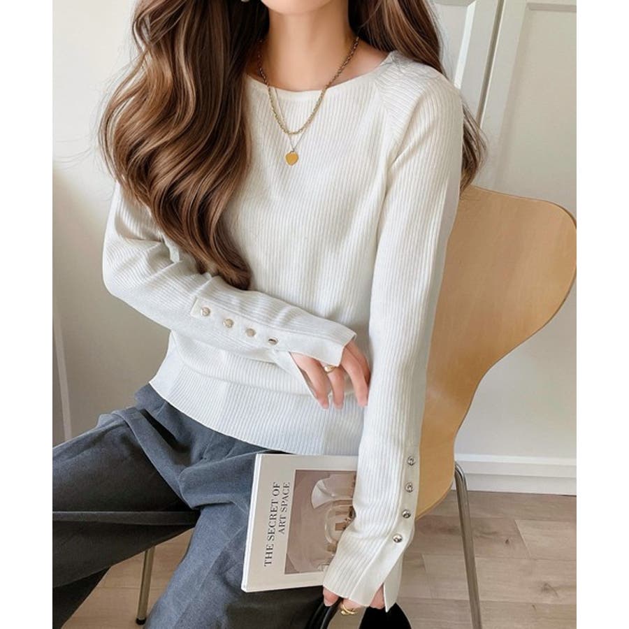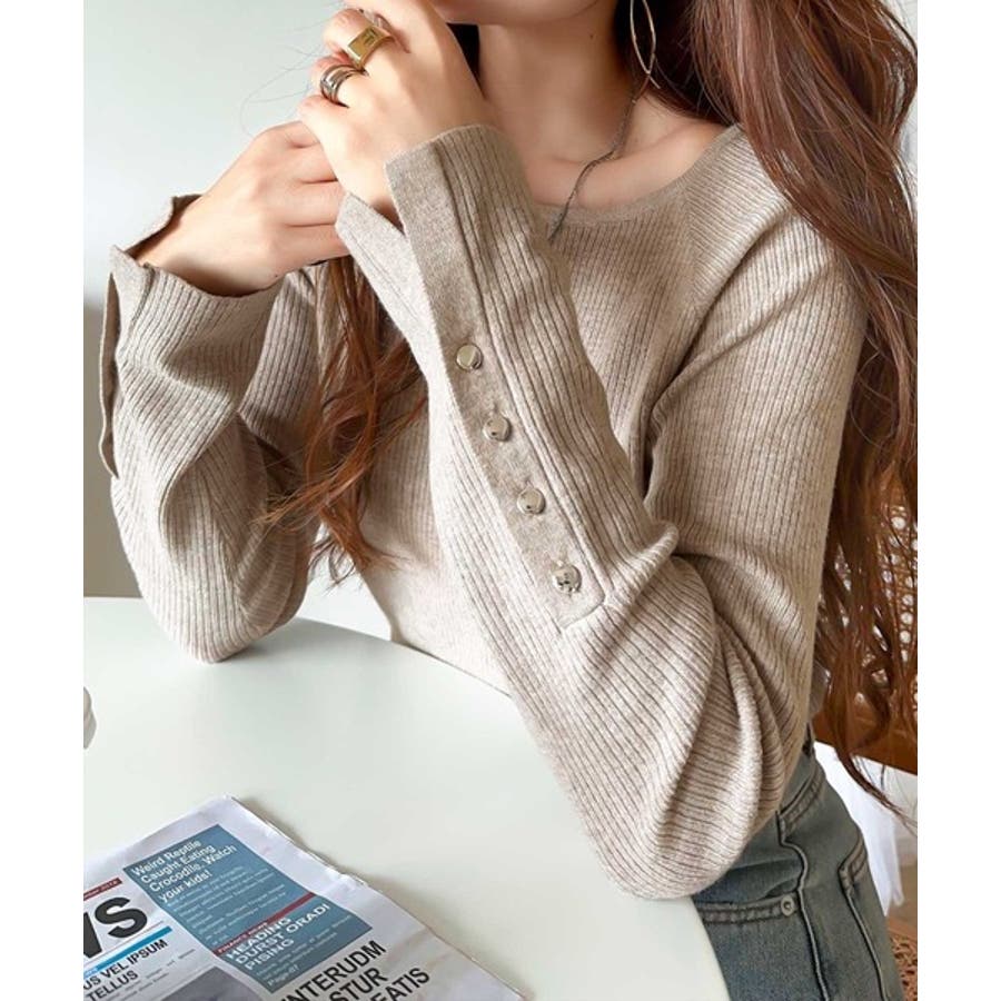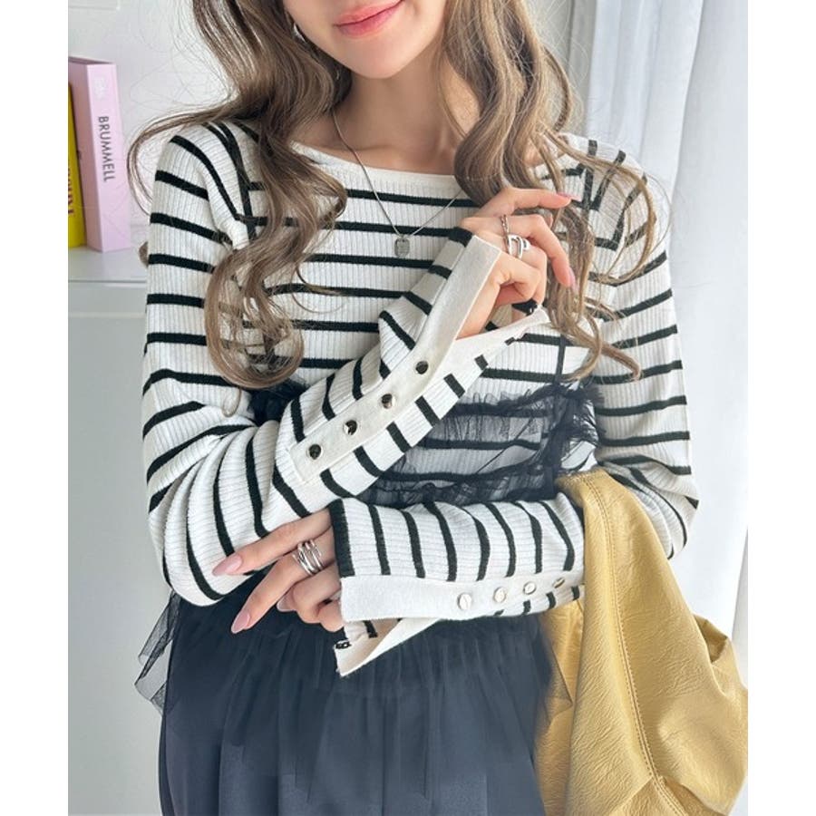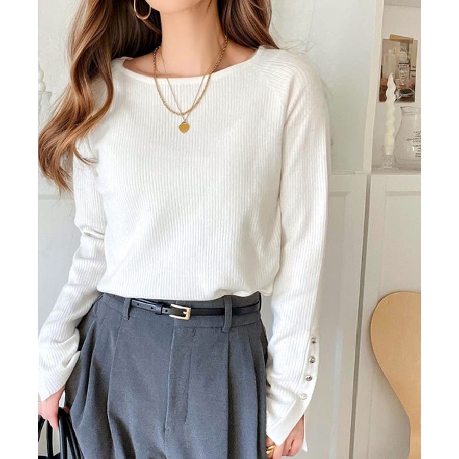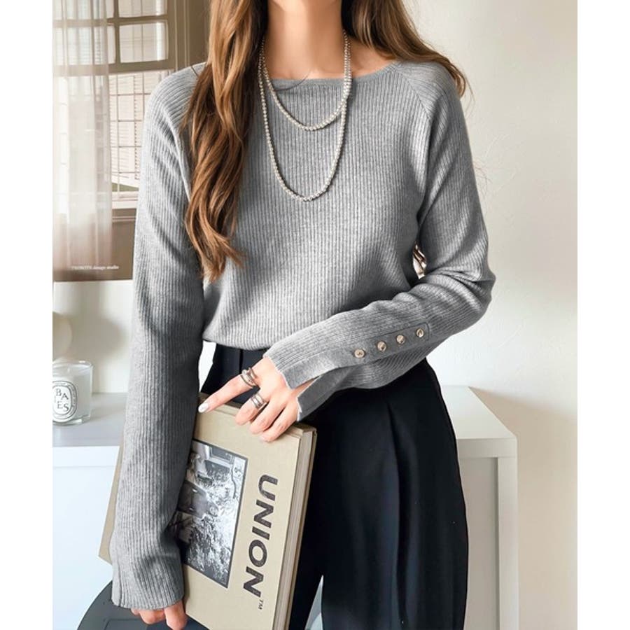 品よく鎖骨魅せ。袖ボタンクルーネックリブニット(無地・ボーダー)