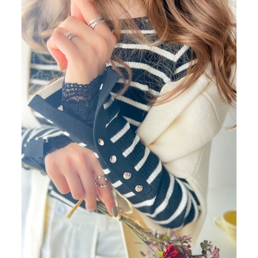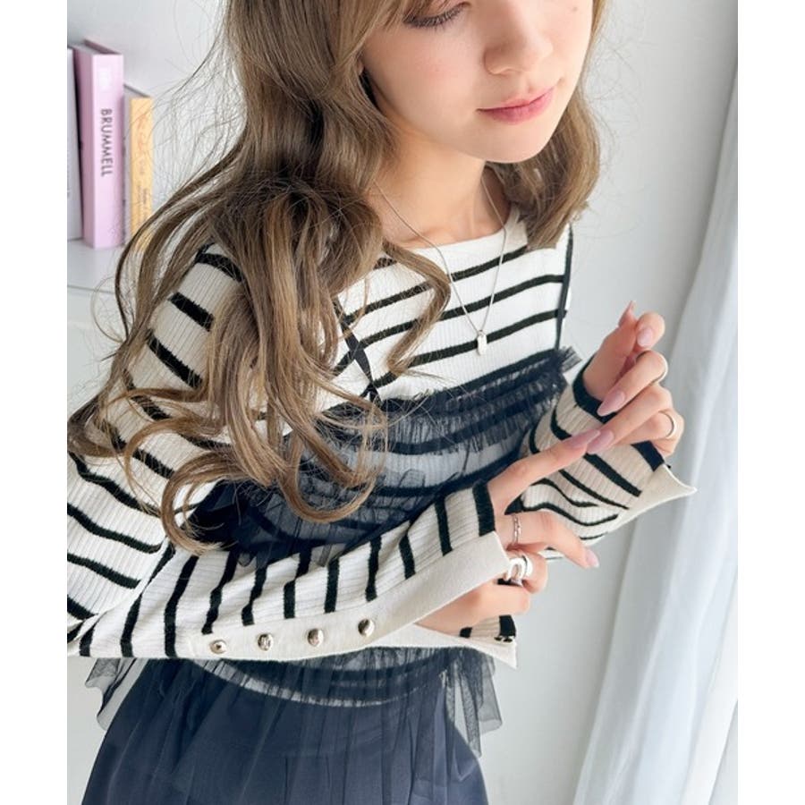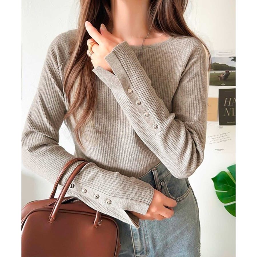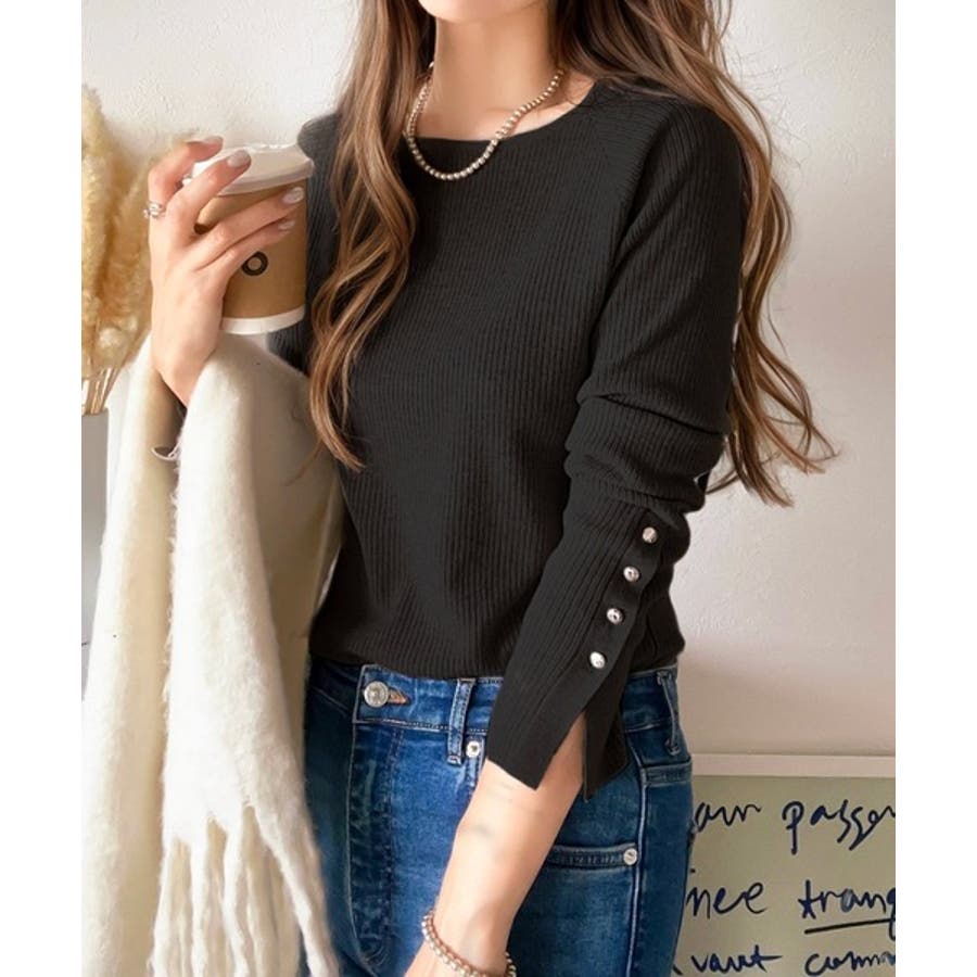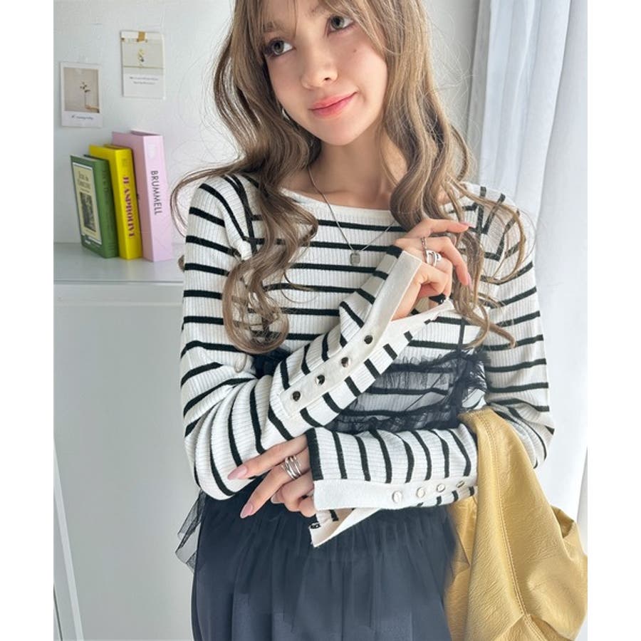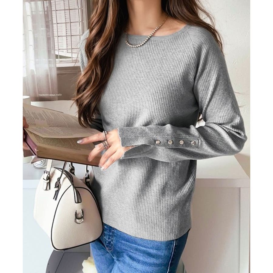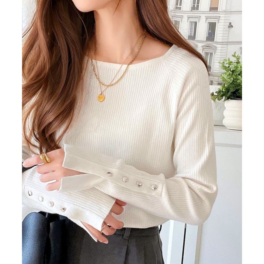 品よく鎖骨魅せ。袖ボタンクルーネックリブニット(無地・ボーダー)