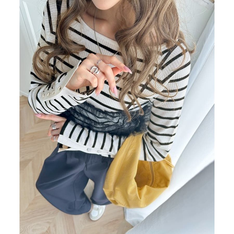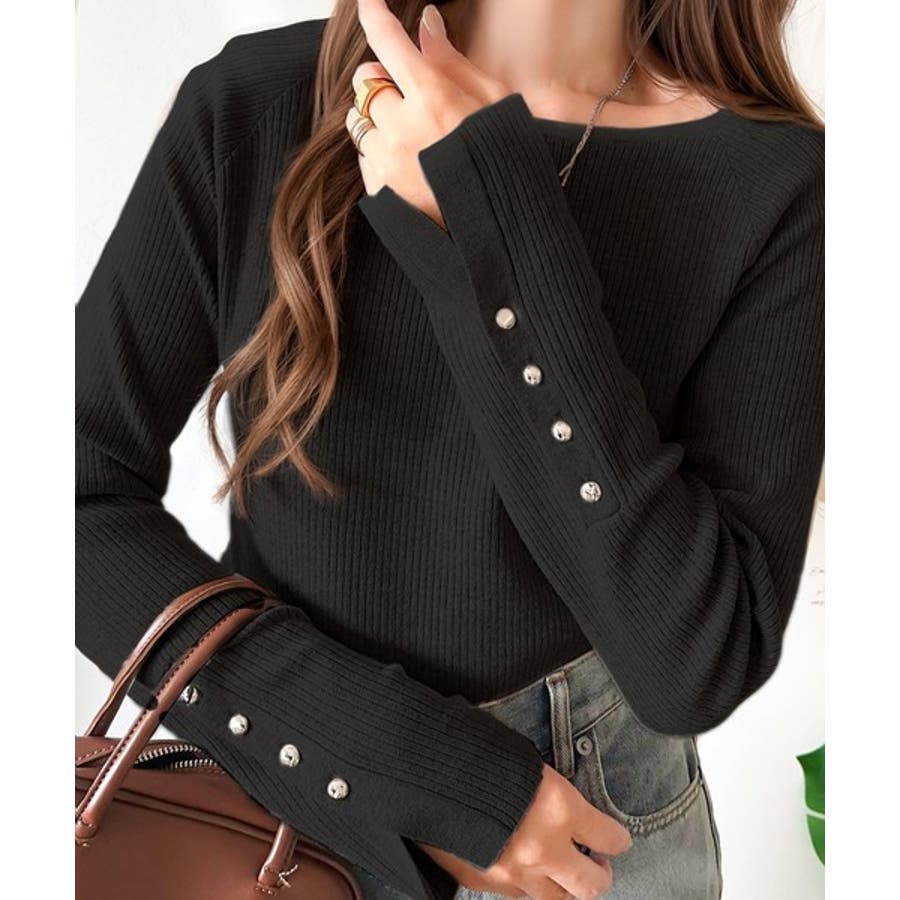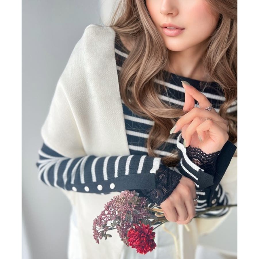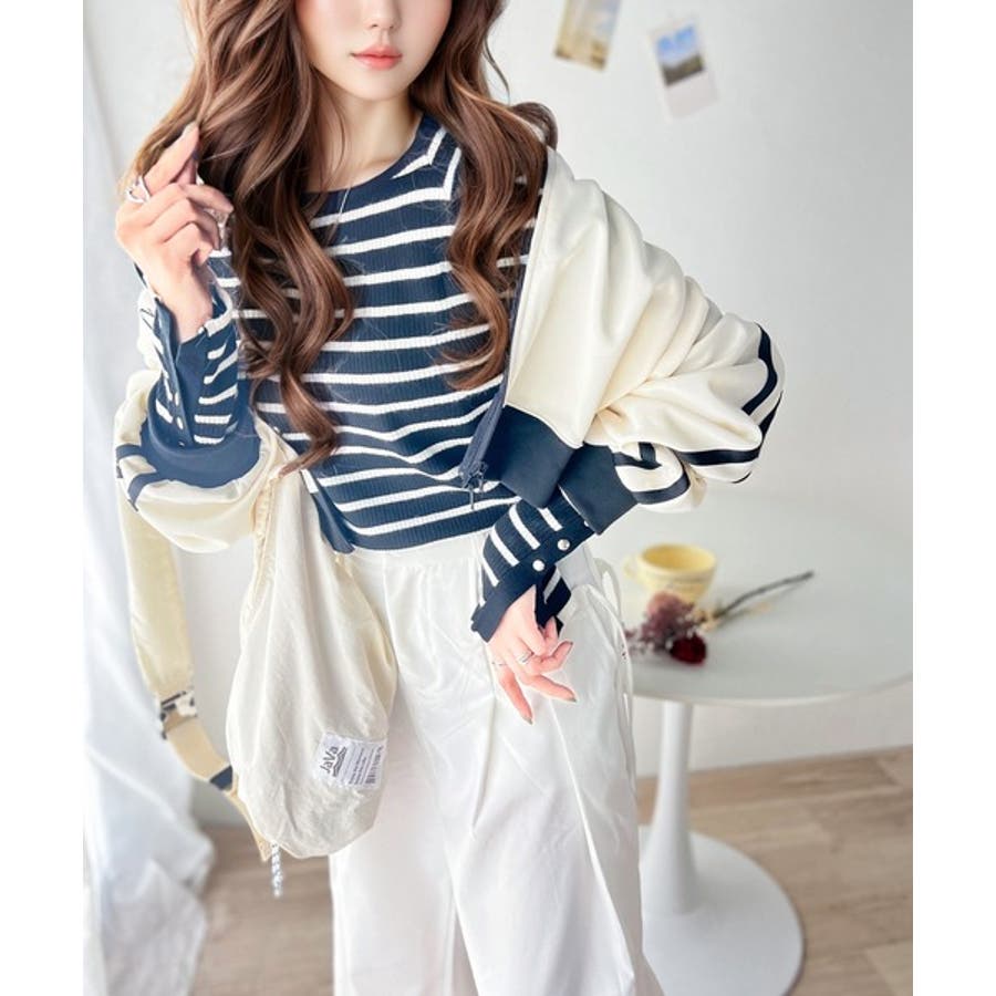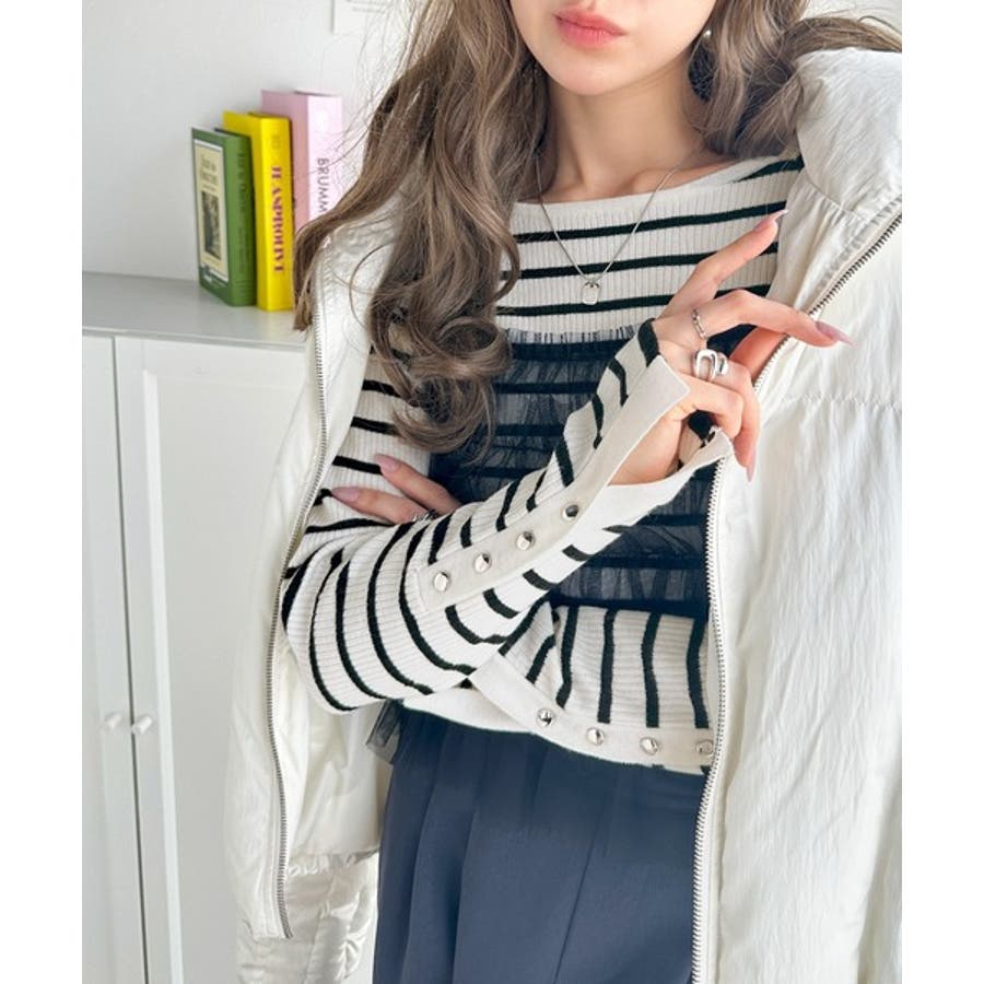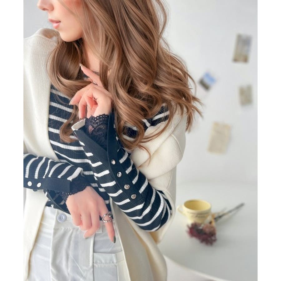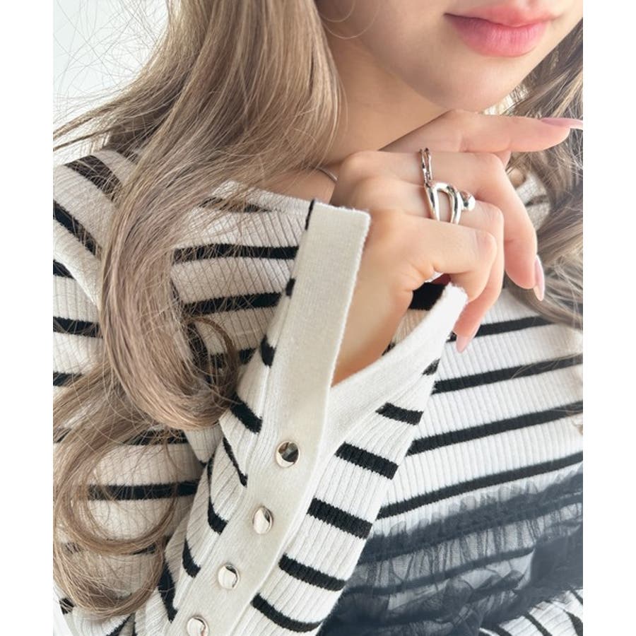品よく鎖骨魅せ。袖ボタンクルーネックリブニット(無地・ボーダー)