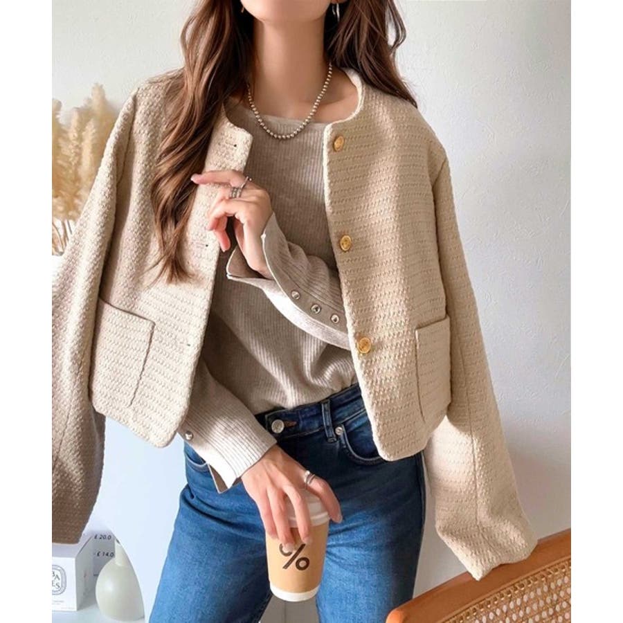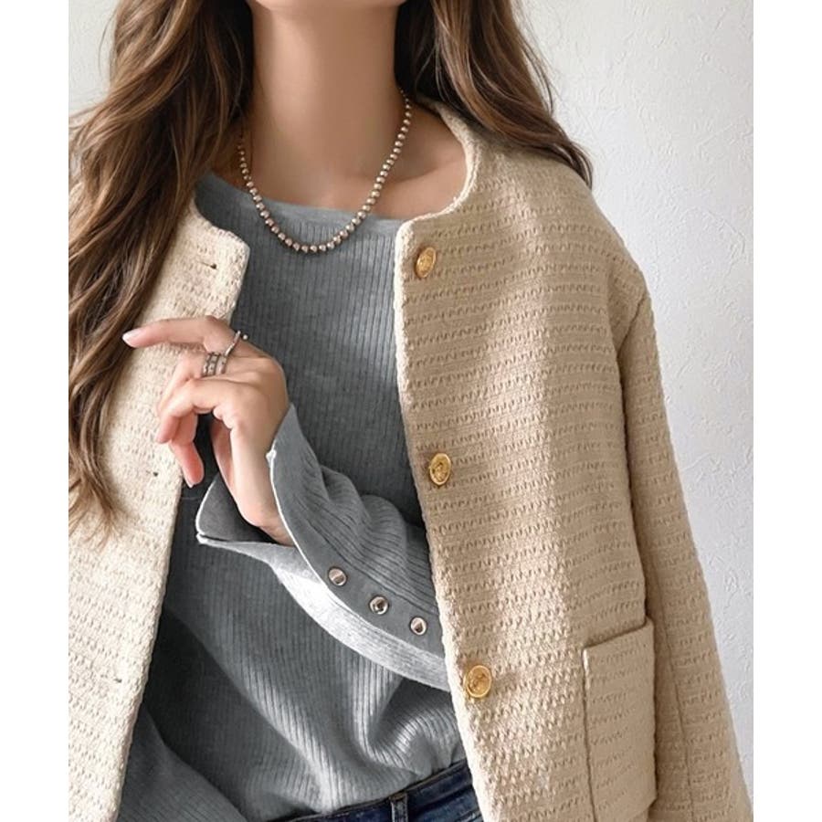 トレンド感満載の袖ボタンが女性らしい華やかな雰囲気。