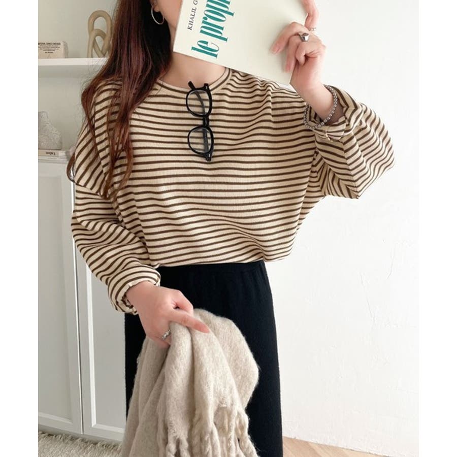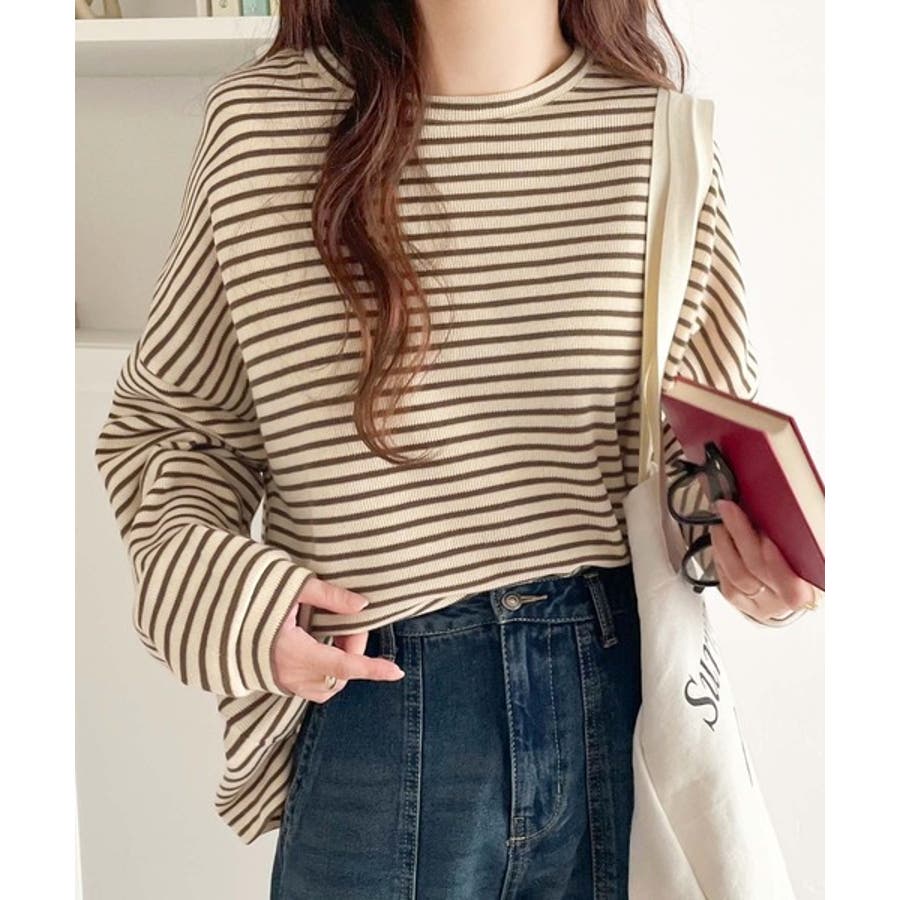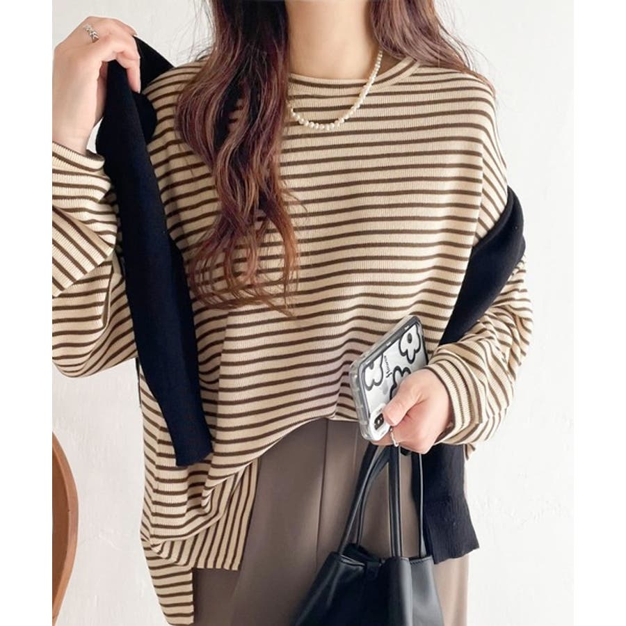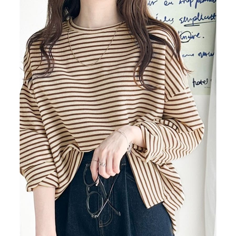 【ベージュ×ブラウン】ボーダーブーム再来。ゆるっとサイドスリット長袖ボーダーロンTee
