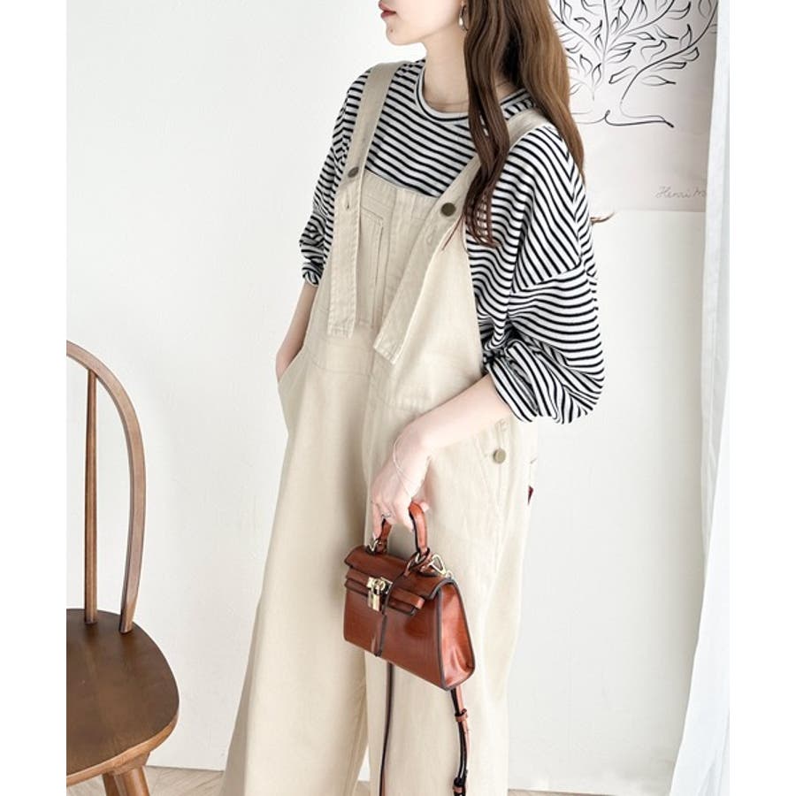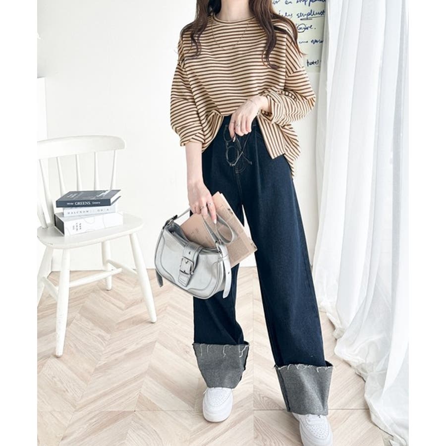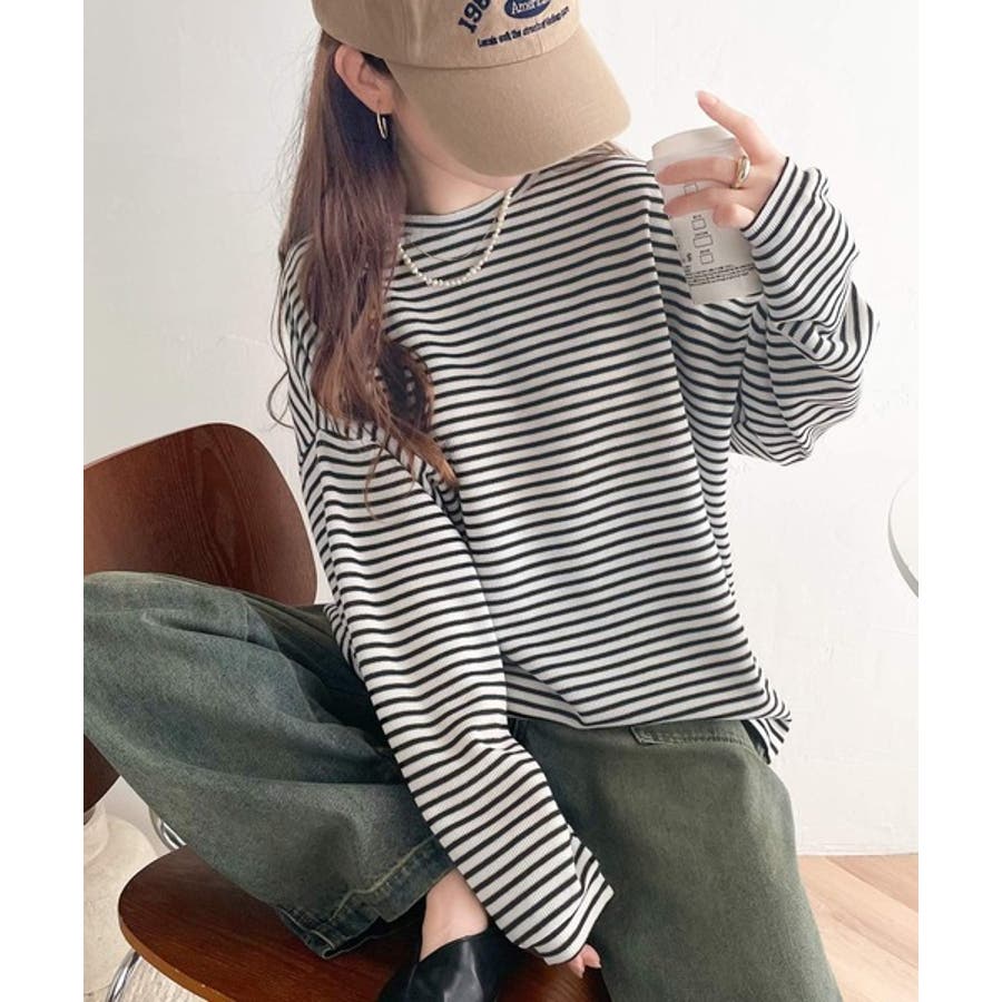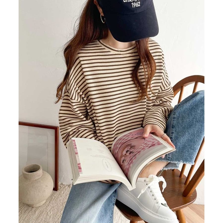 【ベージュ×ブラウン】ボーダーブーム再来。ゆるっとサイドスリット長袖ボーダーロンTee